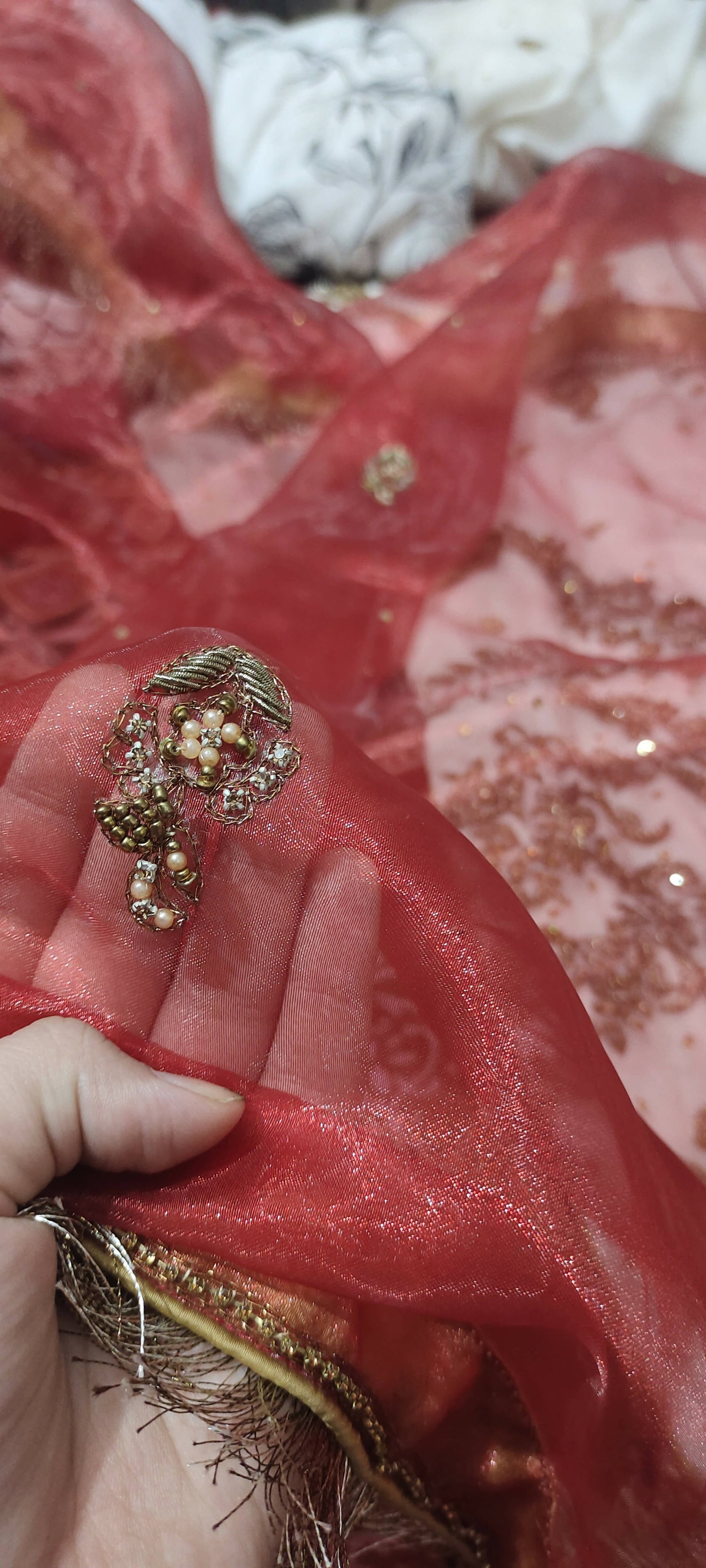 MATERIAL & MEASUREMENT Shirt Length. 38 Shoulders 15 Chest 20 Sleeve length 21 Sharara length 38 Material is Net with inner And dupatta is Organza