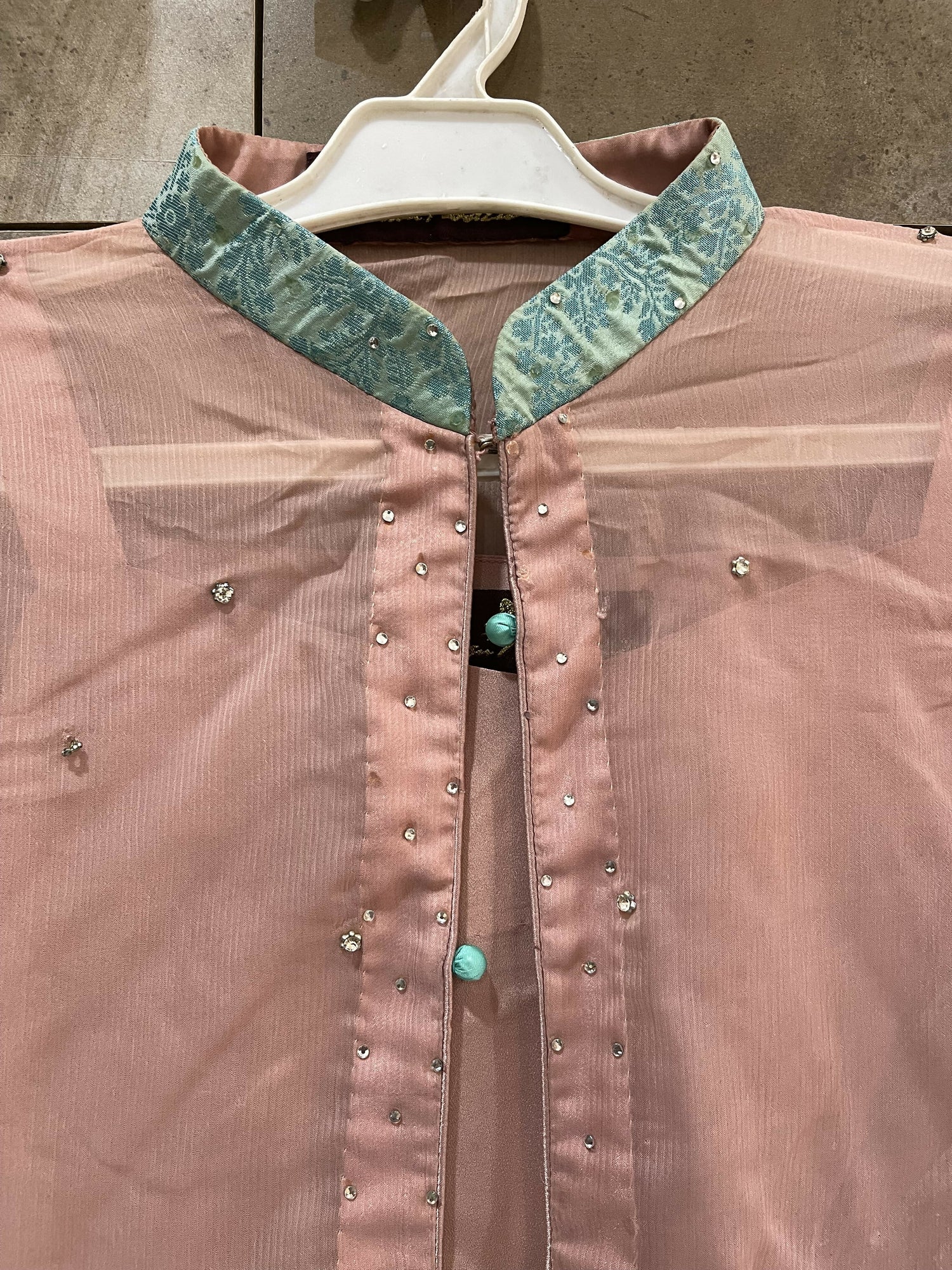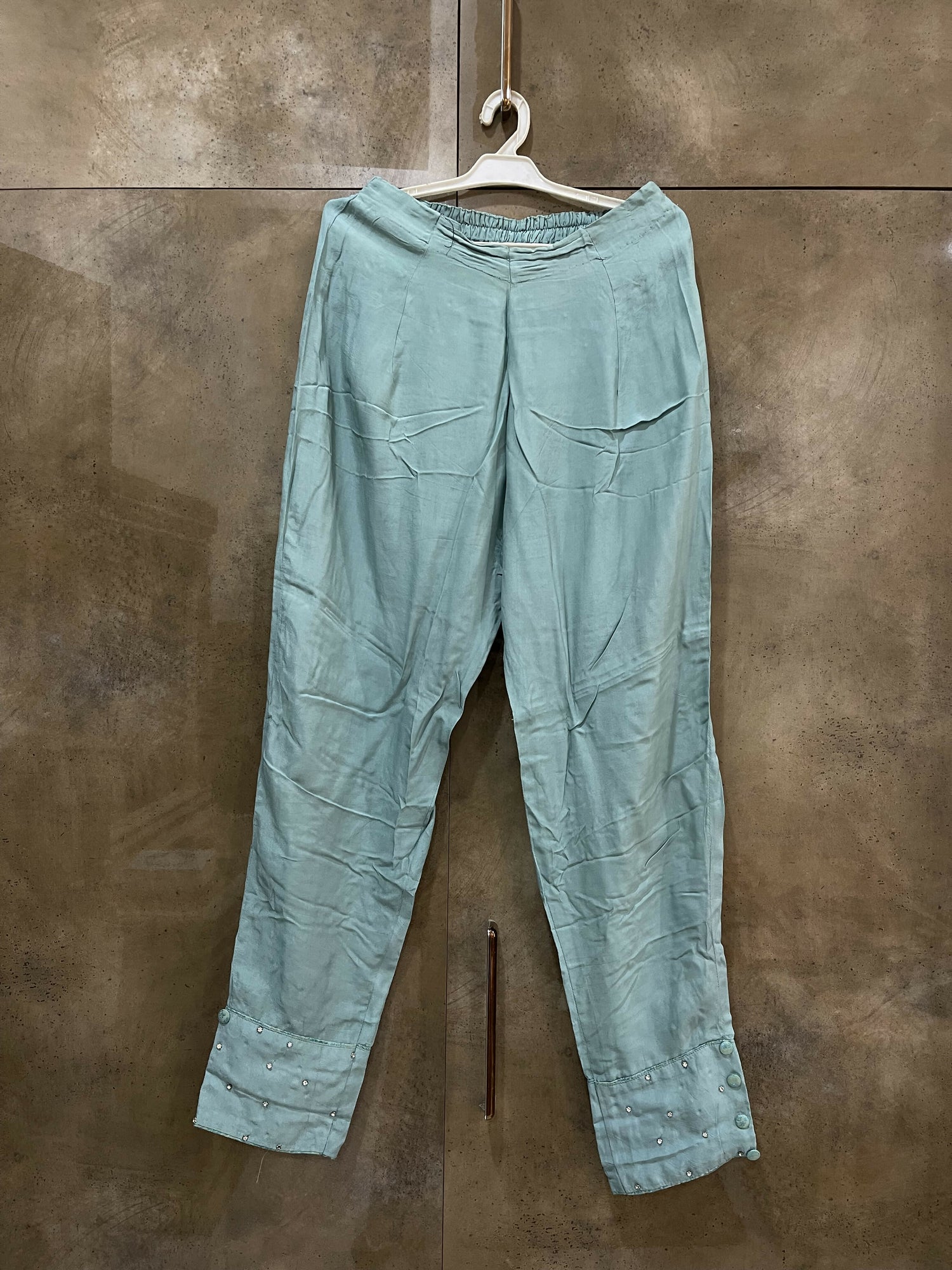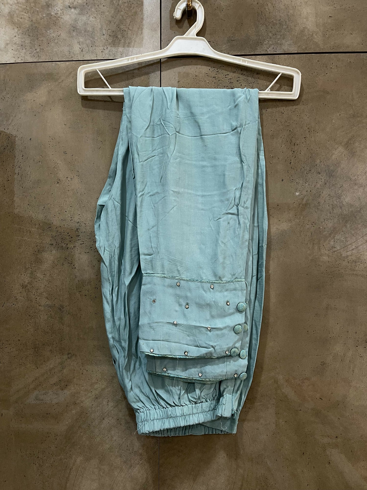 | MATERIAL & MEASUREMENT | Material: chiffon Shirt: Chest 20 Shoulder 14 Arm hole 8 Sleeves 22.5 Sleeves opening 4.5 Length 39.5 Trousers: Relaxed waist 26 Stretched waist 34 Inner thighs 13 Length 41 Paicha 6.5 *All measurements are in inches |