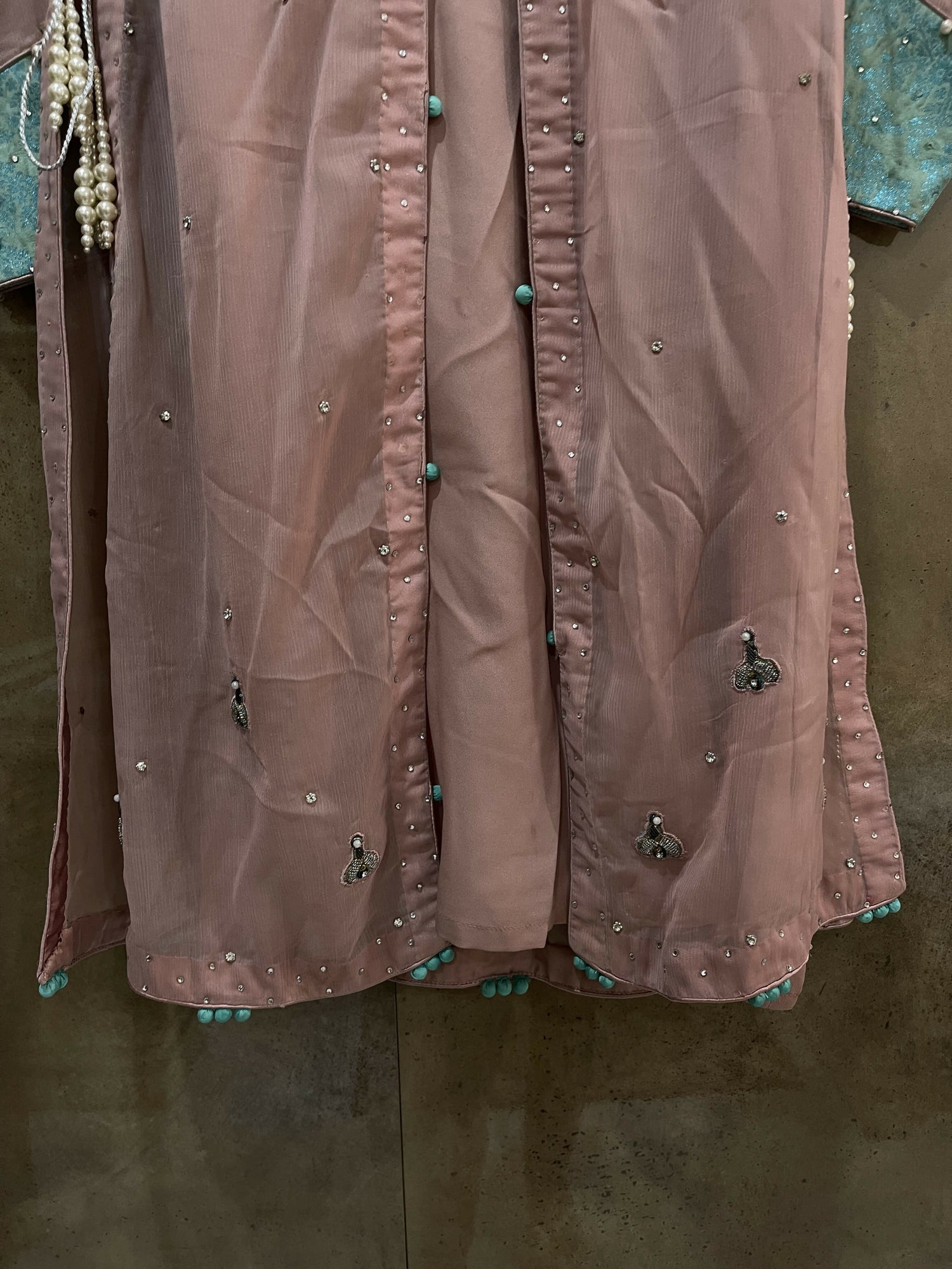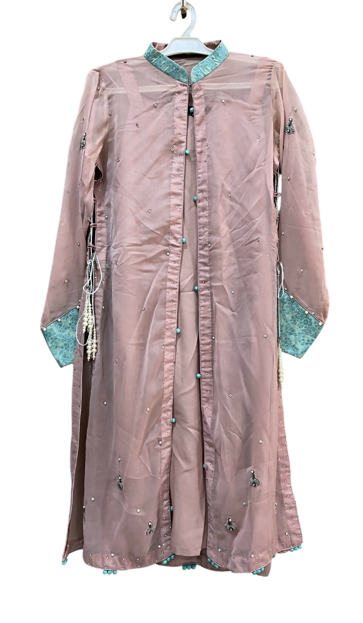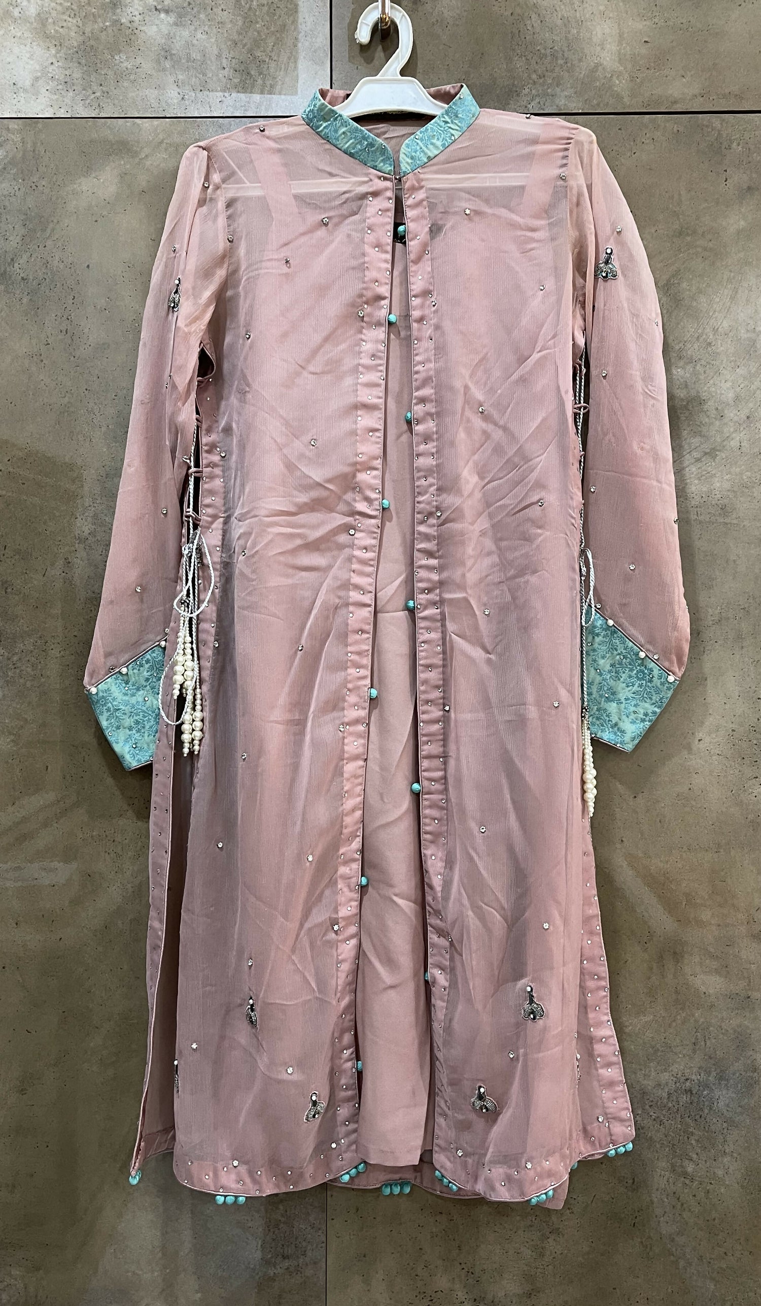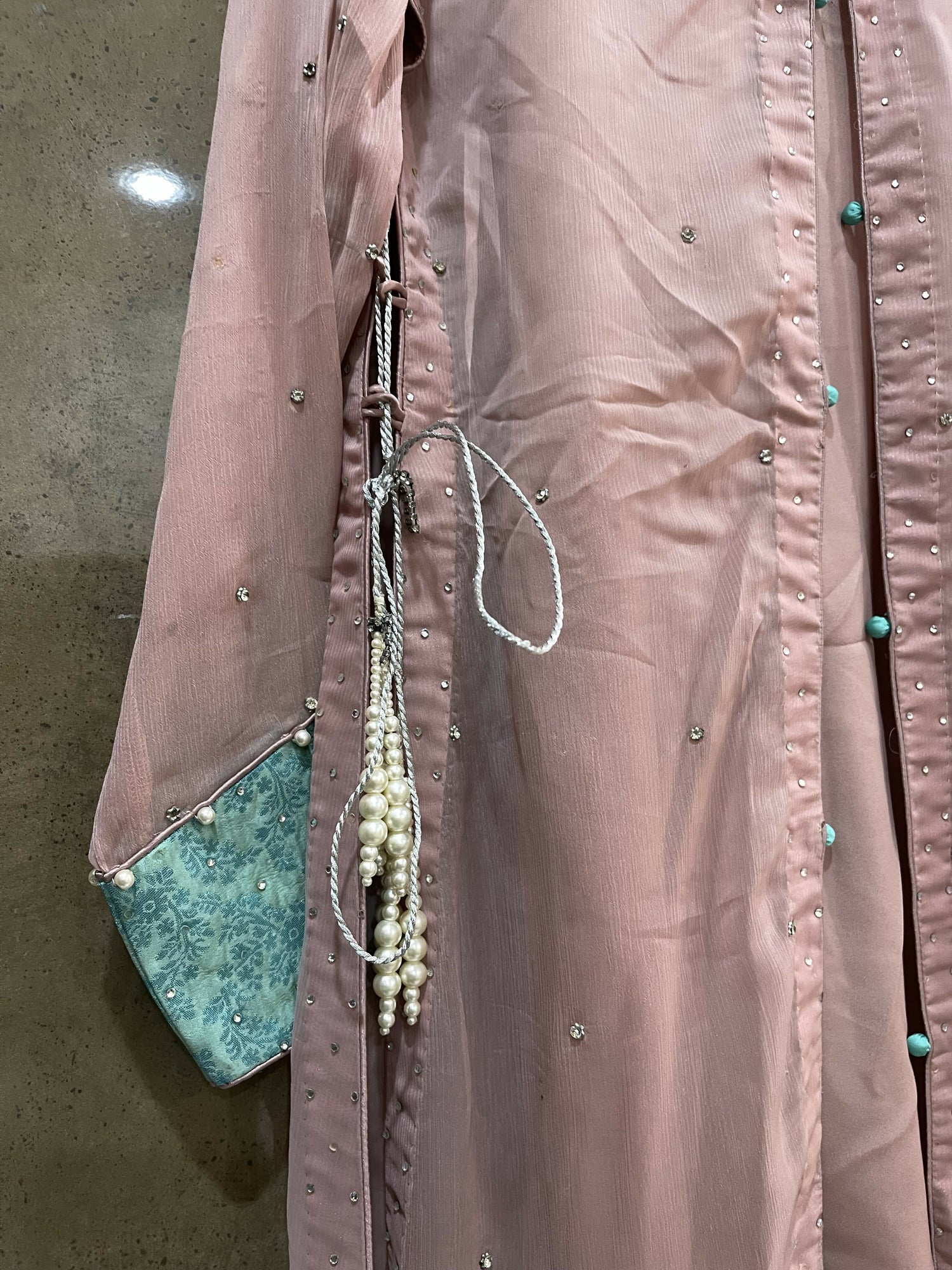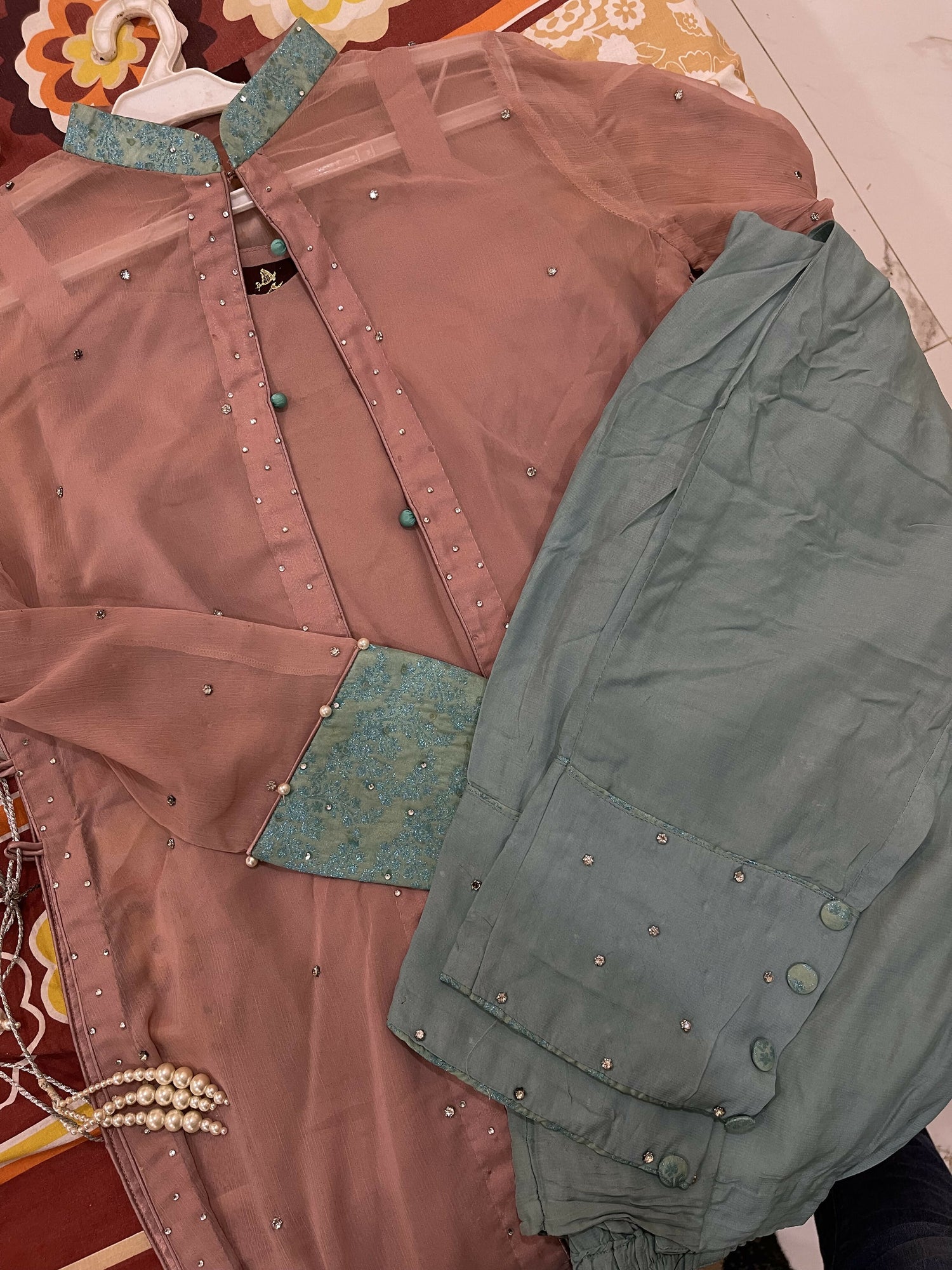 Fabric Gorgeous chiffon pastel colour dress with light work embracing elegance.