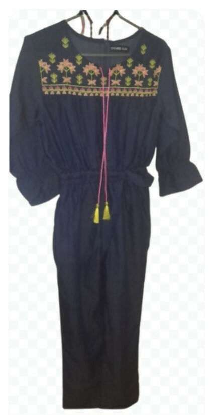 | MATERIAL & MEASUREMENT | Ochre brand Denim embroidered jumpsuit Length 54 inches Chest 18.5 inches Shoulder 14 inches |