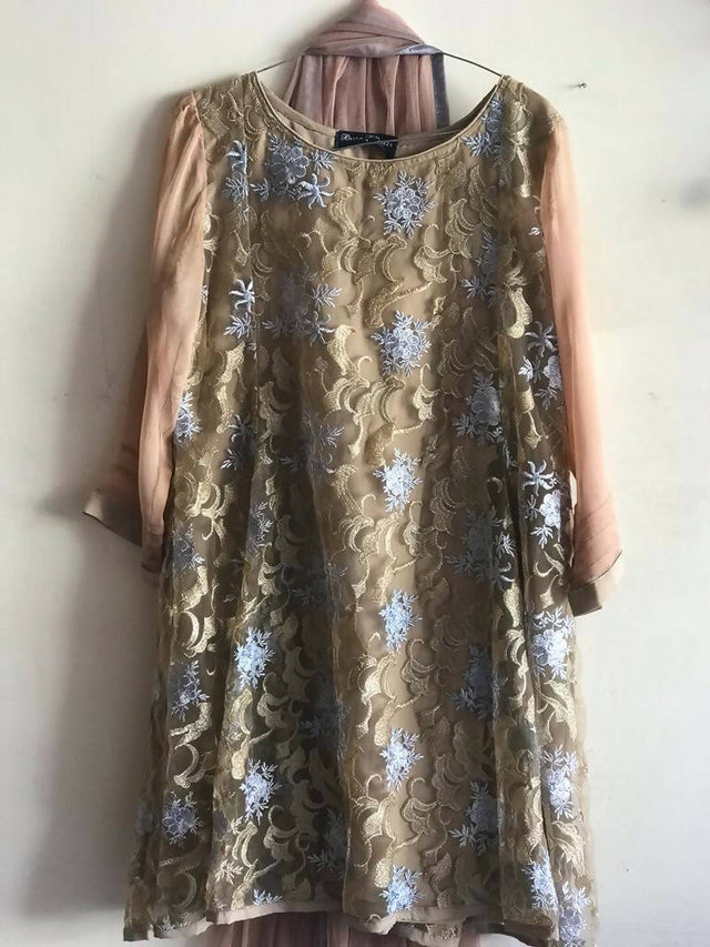 Three-piece semiformal dress. It is a net frock with a net dupatta and reshmi trousers