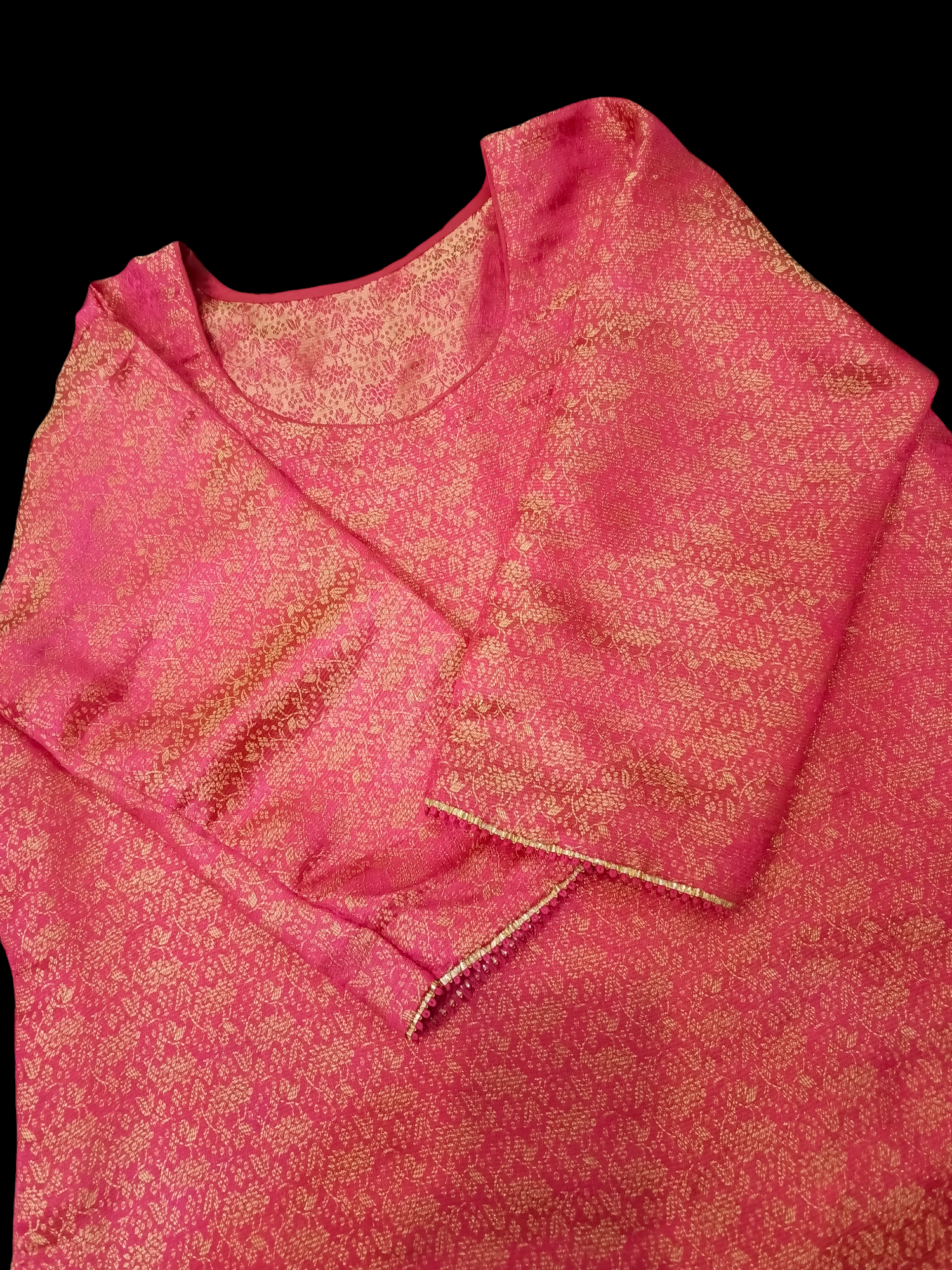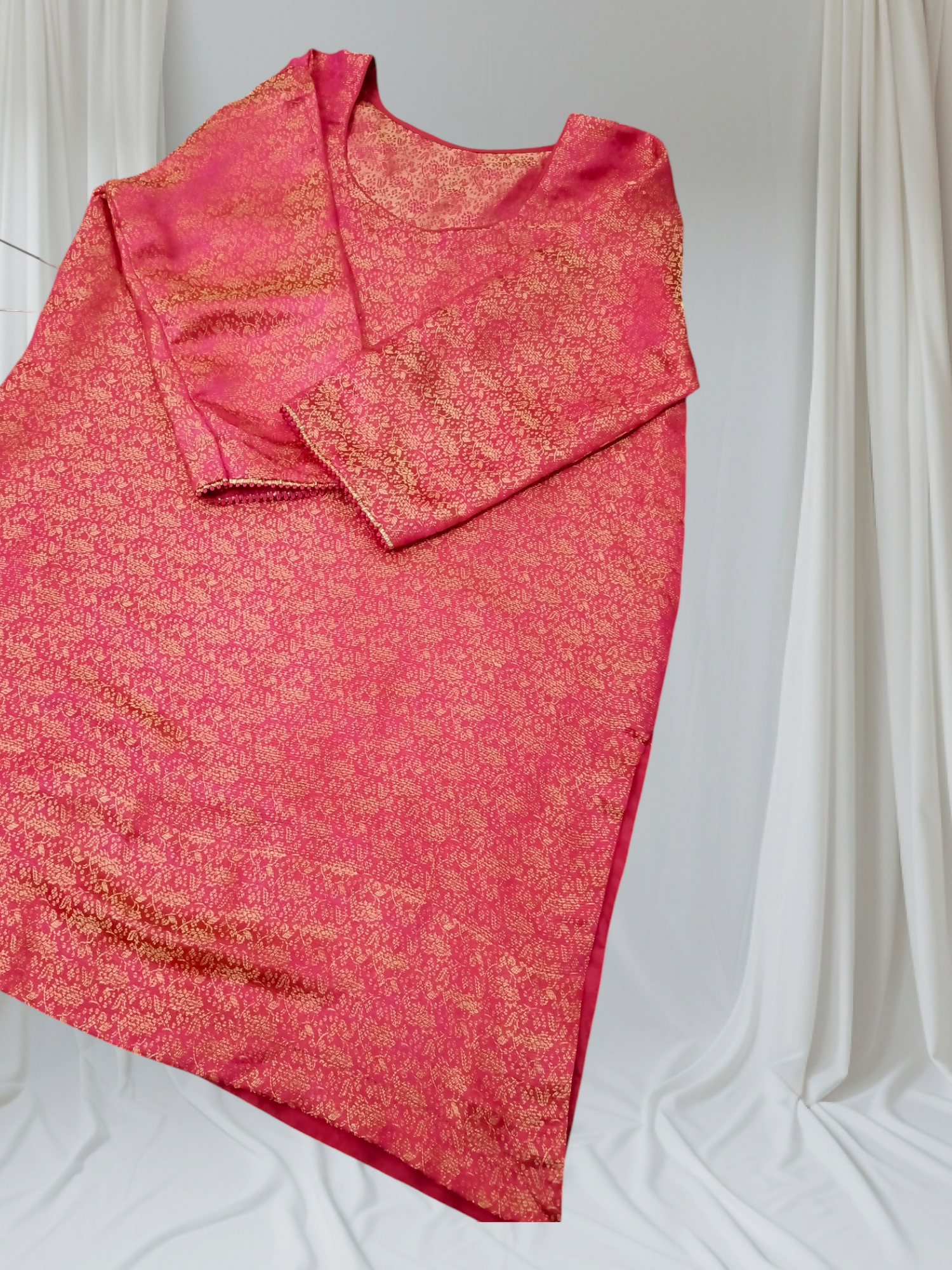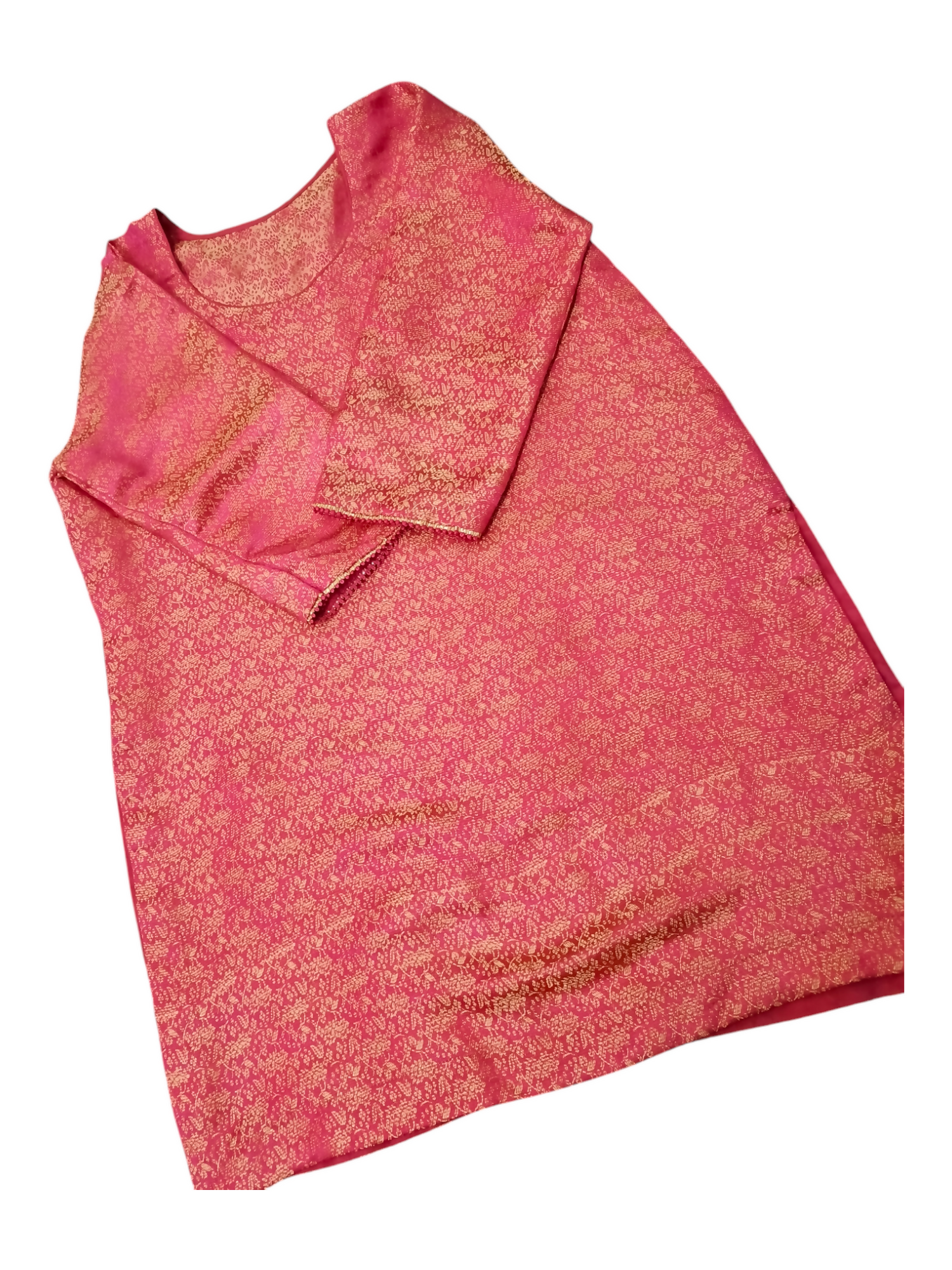 Product Description: This festive Jacquard shirt is beautifully emboying a round neckline.It loose sleeves features fancy golden lace alongwith pink rounded designs.