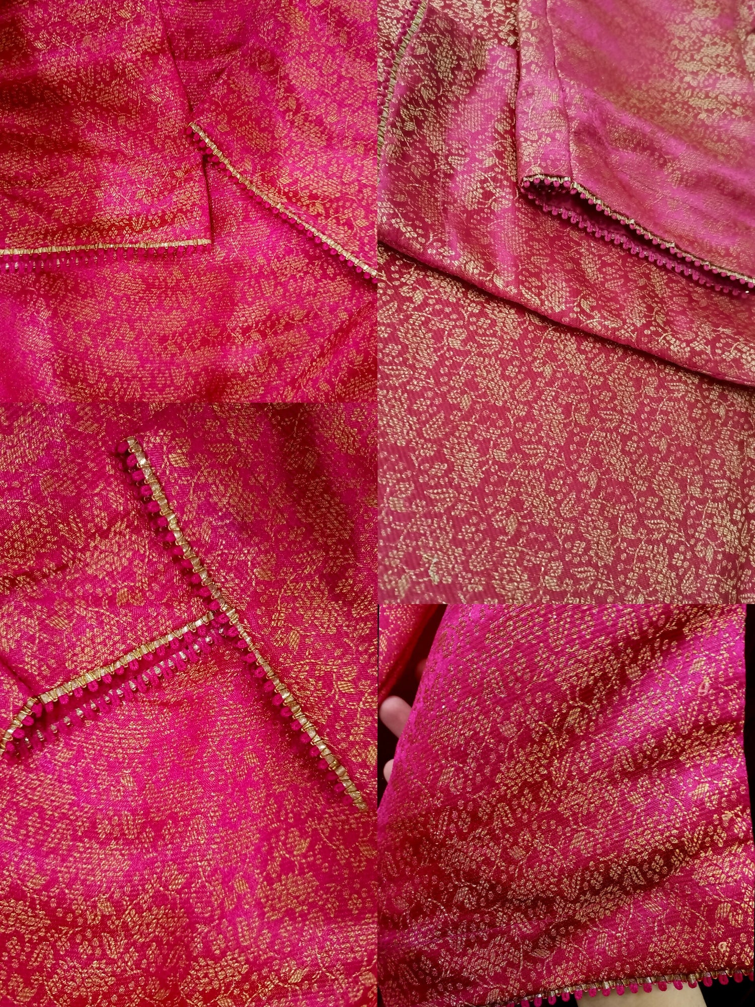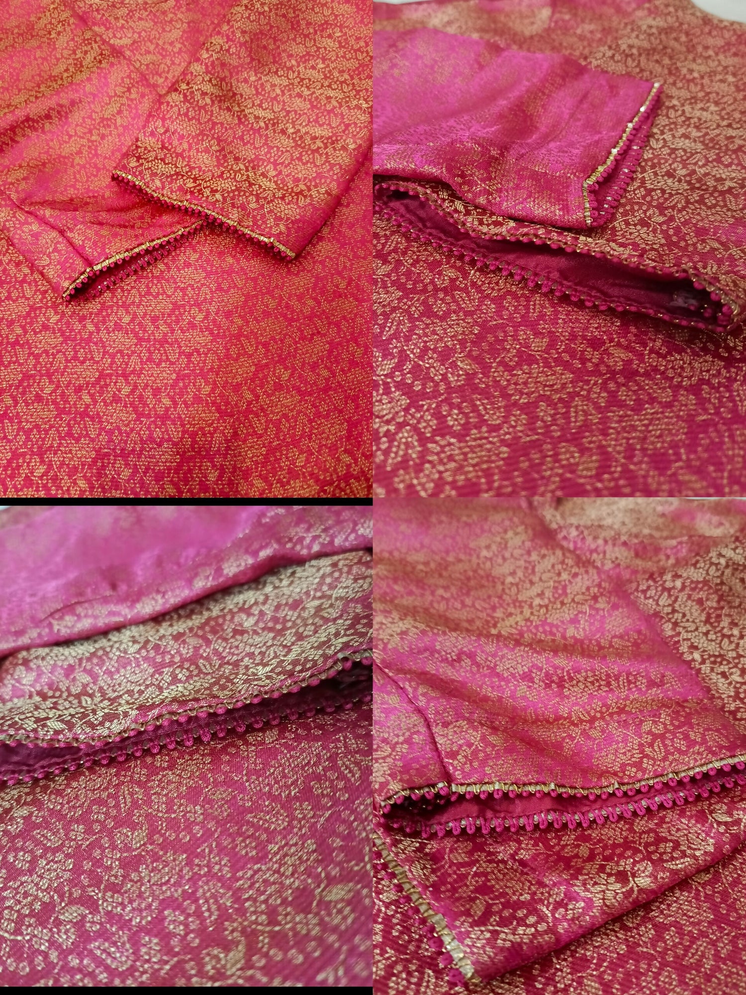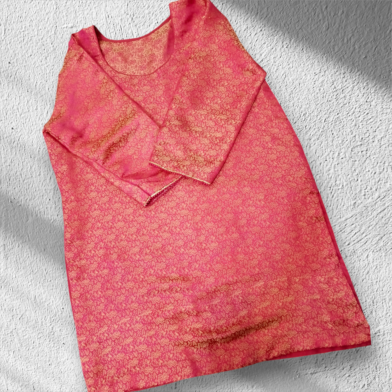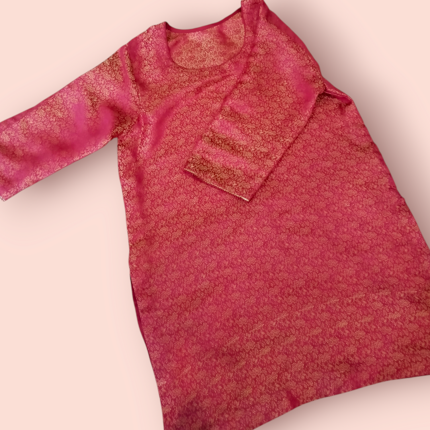 Product Description: This festive Jacquard shirt is beautifully emboying a round neckline.It loose sleeves features fancy golden lace alongwith pink rounded designs.