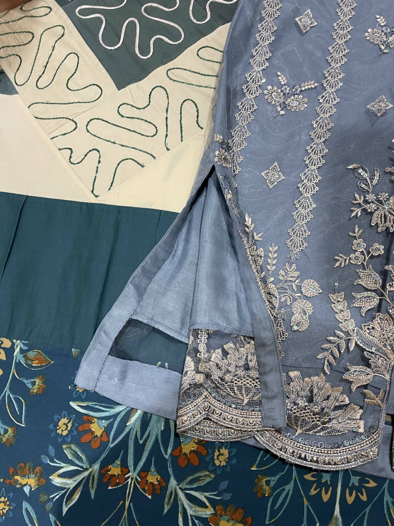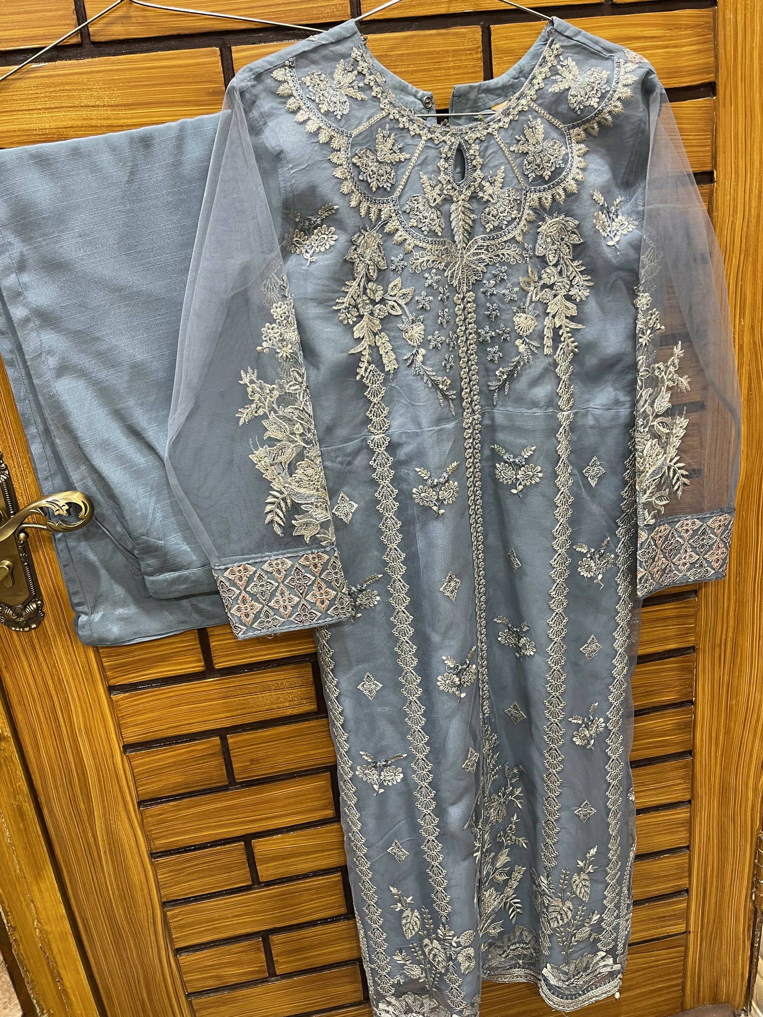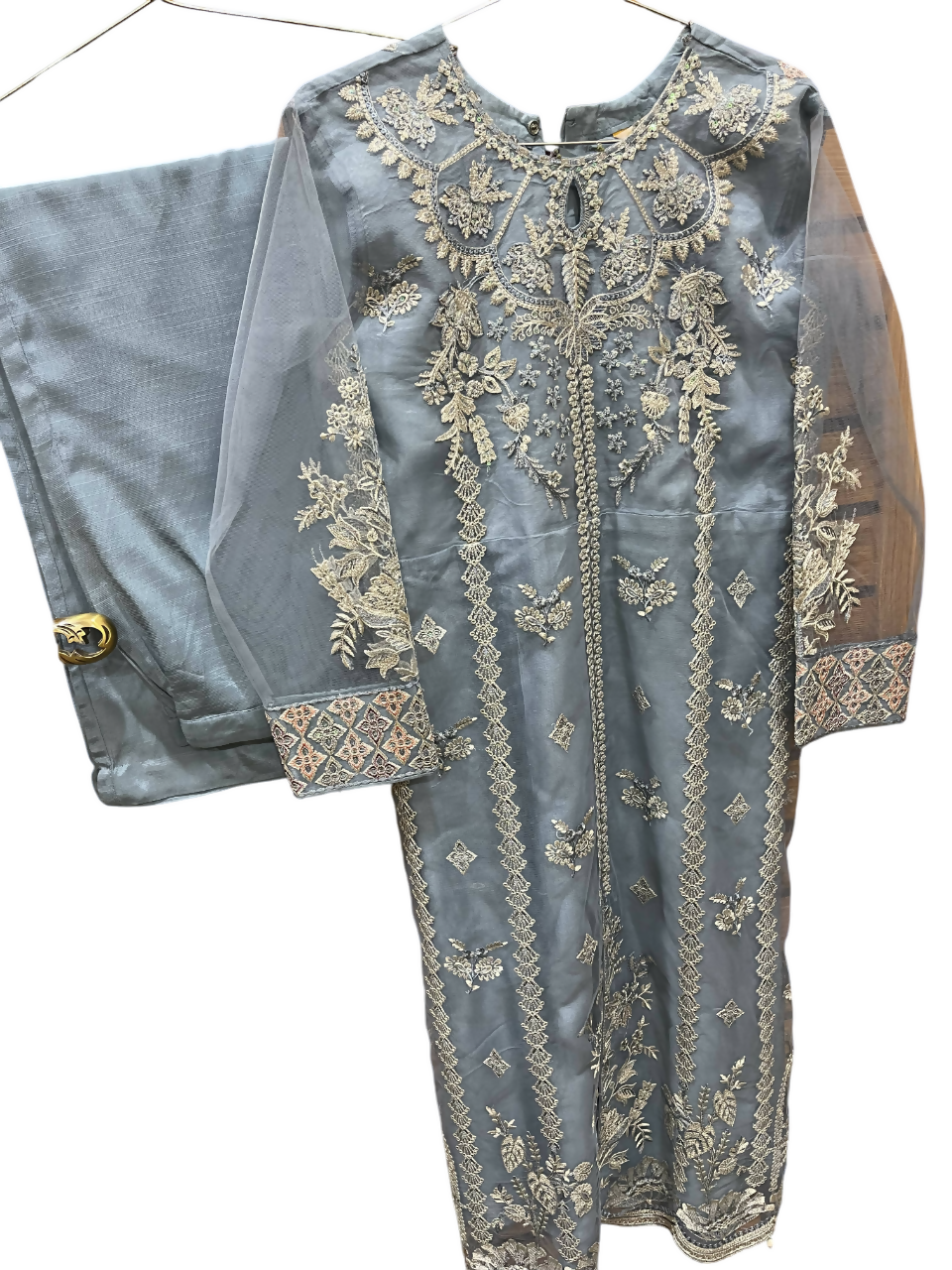 | MATERIAL & MEASUREMENT | Chest size 20 Waist 19•8 Bazu length 21•2 Shirt length 47 Trouser length 38•6 Net Embroided |