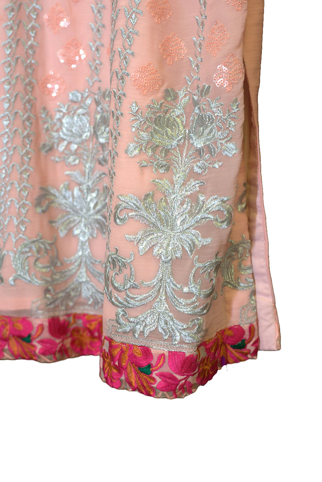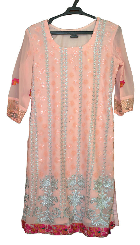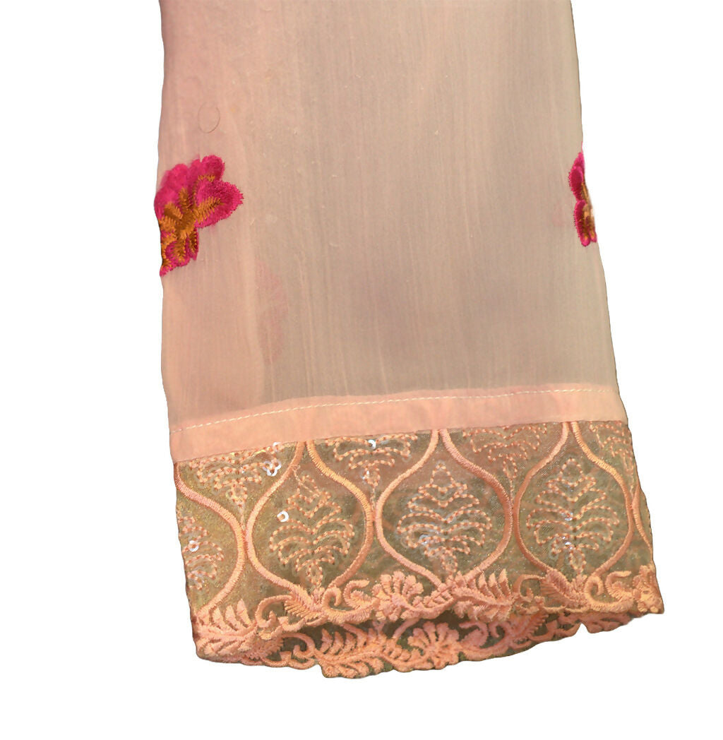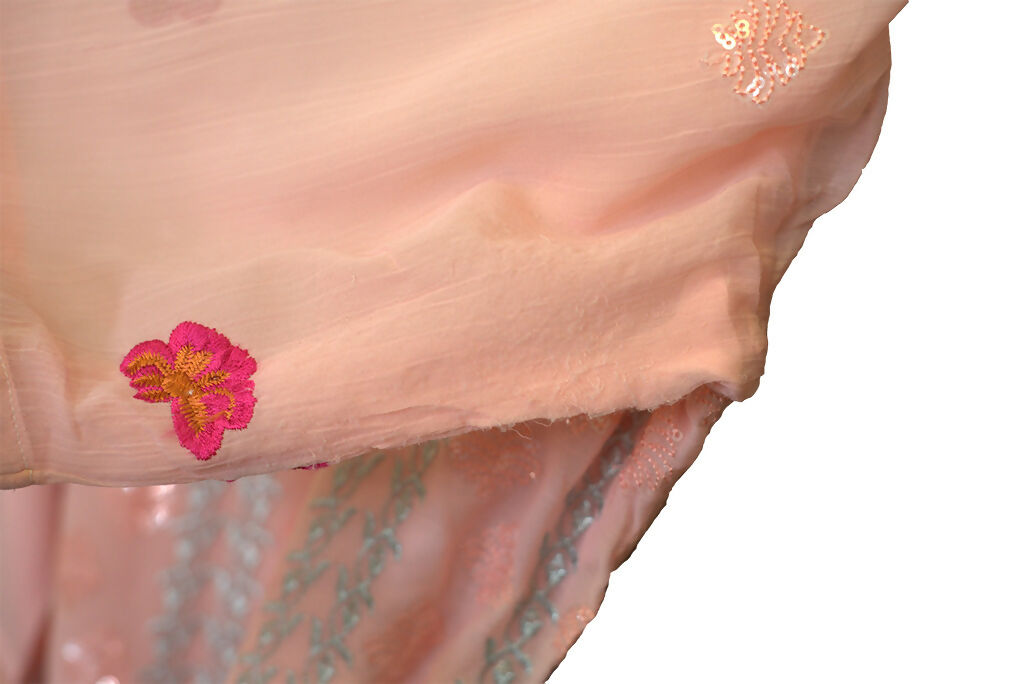 Description: Peach with silver and pink design Qameez Shalwar suit with lining