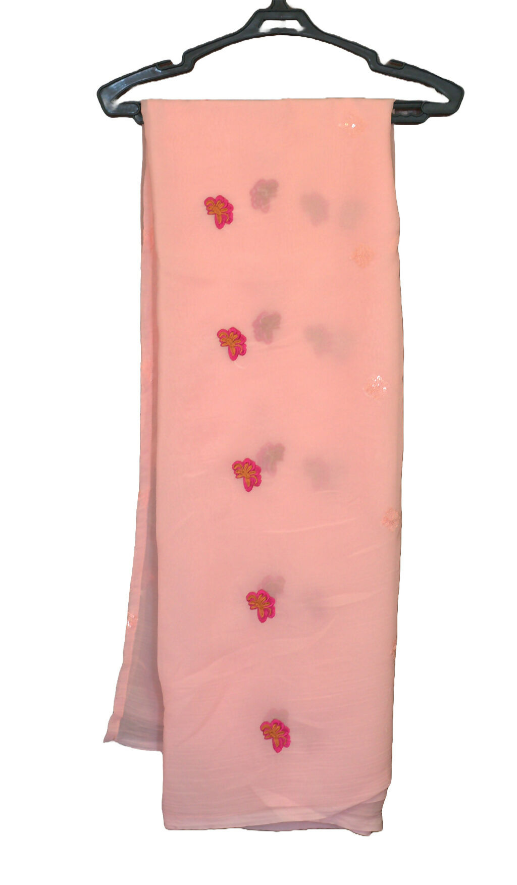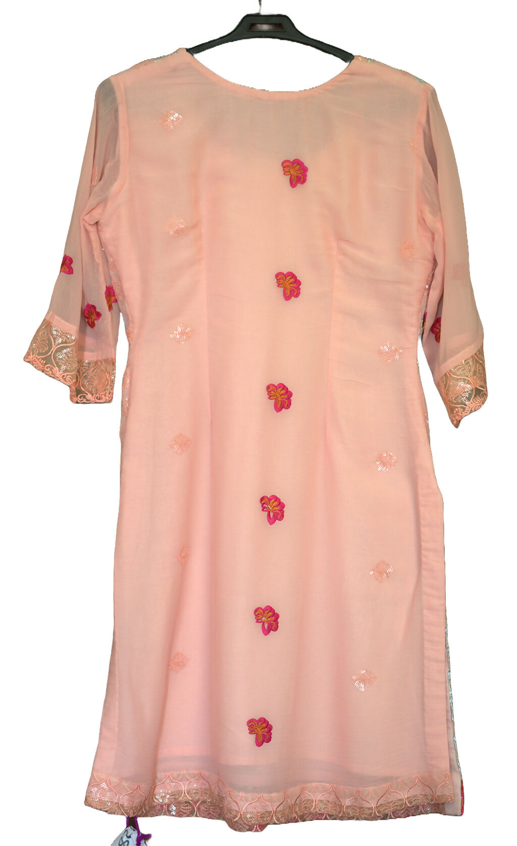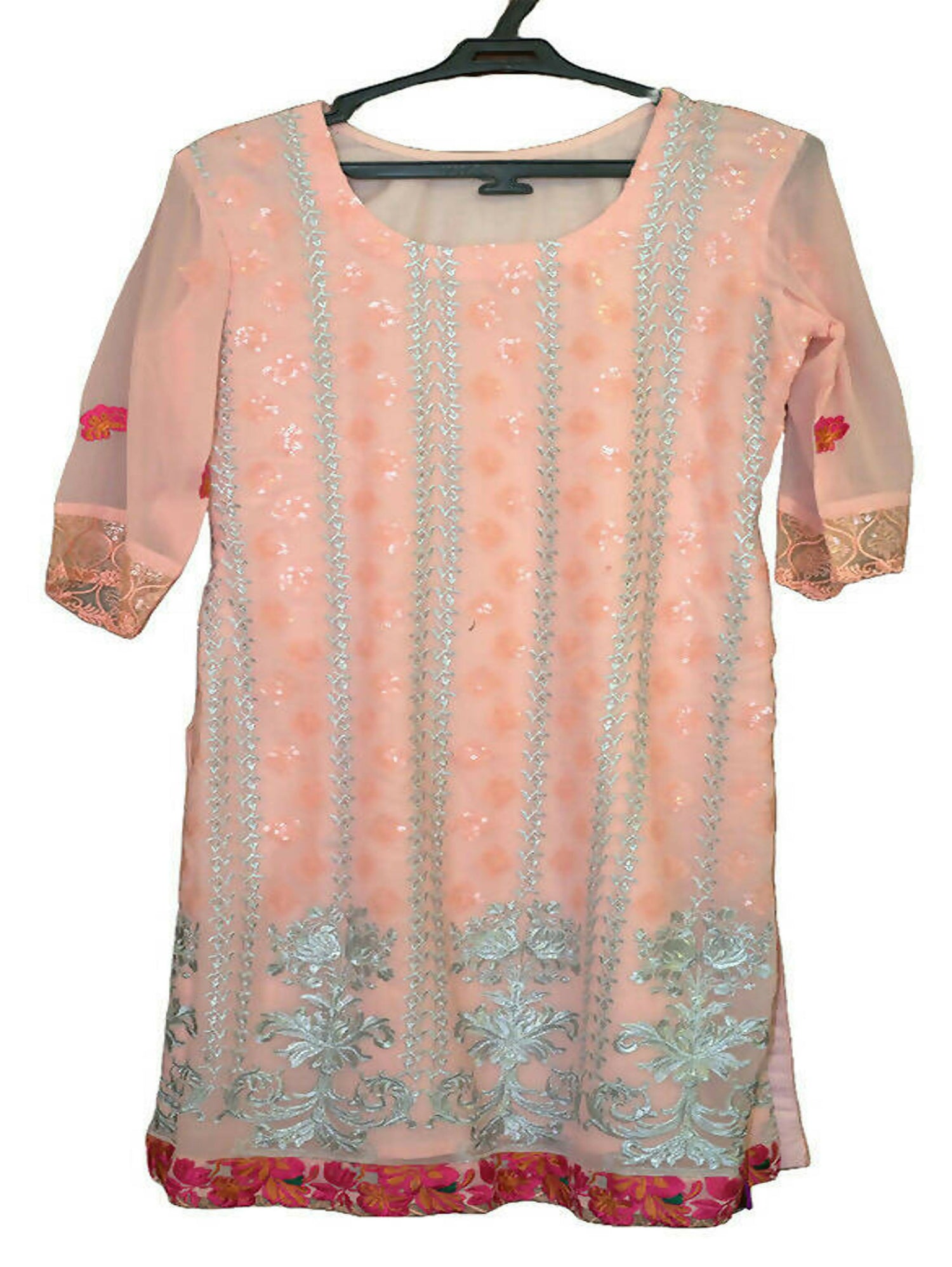 | MATERIAL & MEASUREMENT | Description: Peach with silver and pink design Qameez Shalwar suit with lining , Minor defect on sleeve Brand : locally stitched Condition : 8/10 No of pieces : 3 Made in Pakistan Measurements: Chiffon Shirt: Length: 44" Chest: 18" Sleeve: 8" Daaman :21" Shoulder : 13.5" Lady Crepe Shalwar: Length: 36” Waist: 20” Payincha: 7” Chiffon Dupatta |