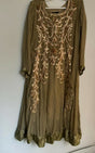 | MATERIAL & MEASUREMENT | Fabric (Shirt): chiffon Trouser: cotton Duppata: chiffon Front fully embroidered Back plain Wore Twice Color : olive green Measurements(Inches): Shirt Length : 48 Chest : 20 Arm Length: 20 Shoulder: 15 1/2 Trouser: 40 |