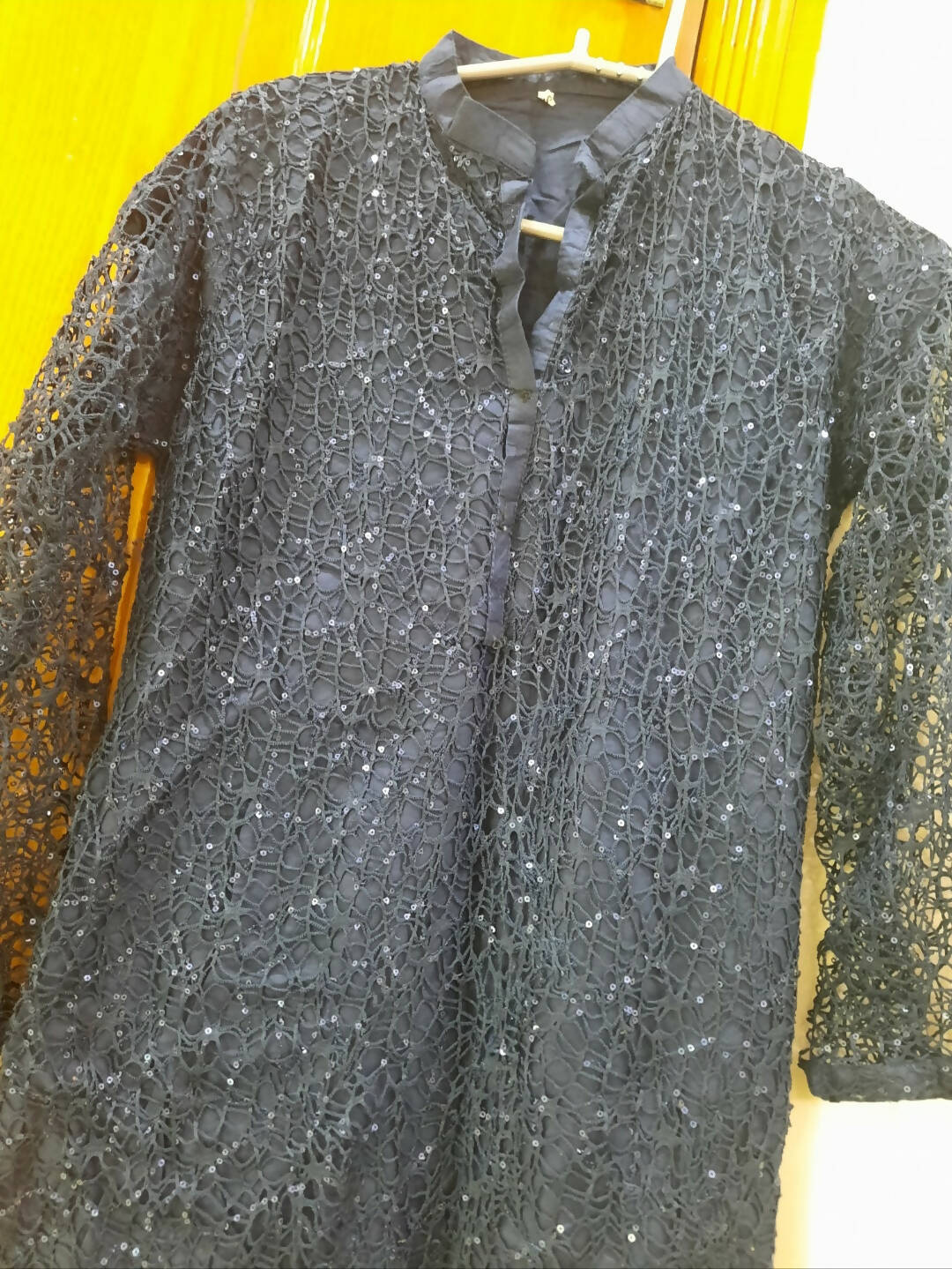 MATERIAL & MEASUREMENT Material net and raw silk Length 41 Chest 18 Arm length 20 Trouser length 38 inches