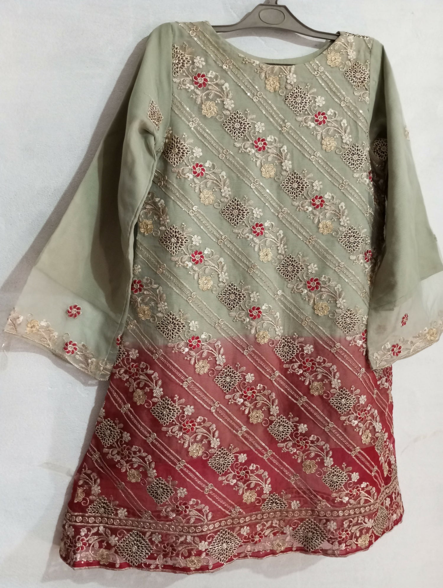 | MATERIAL & MEASUREMENT | Shirt: A line ferok Stuff: Organze with Tilla Work Duptta: Bnarcy Trouser: satin silk Measurements: Shirt lenghth: 36 inches Width: 20 inches Chest: 18 inches arm hole: 10 inches Sleeves lenght 21inches Trouser lenght: 35 inches |