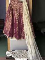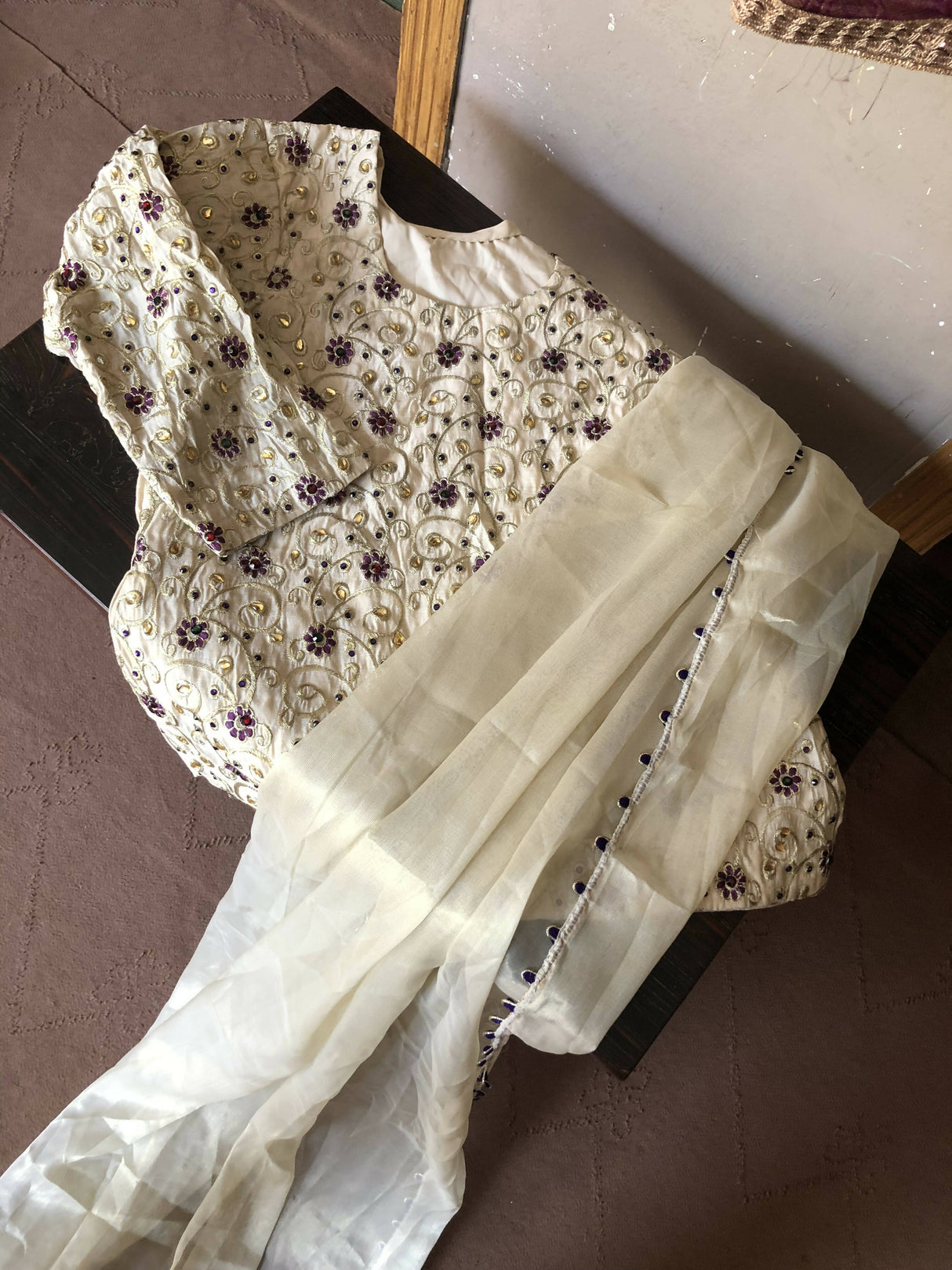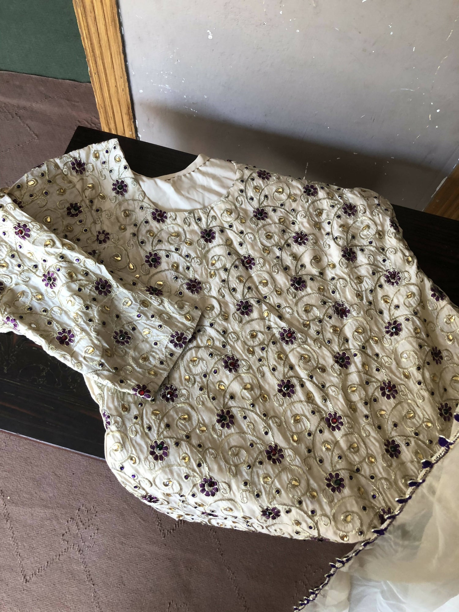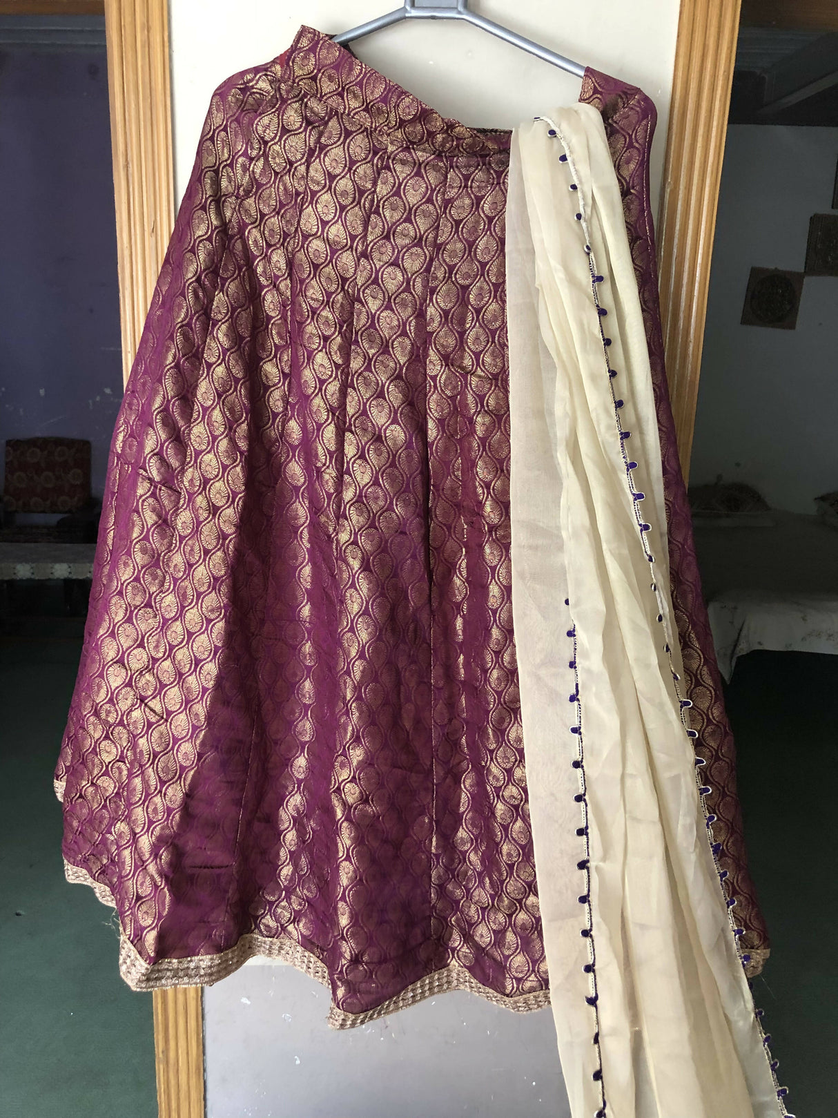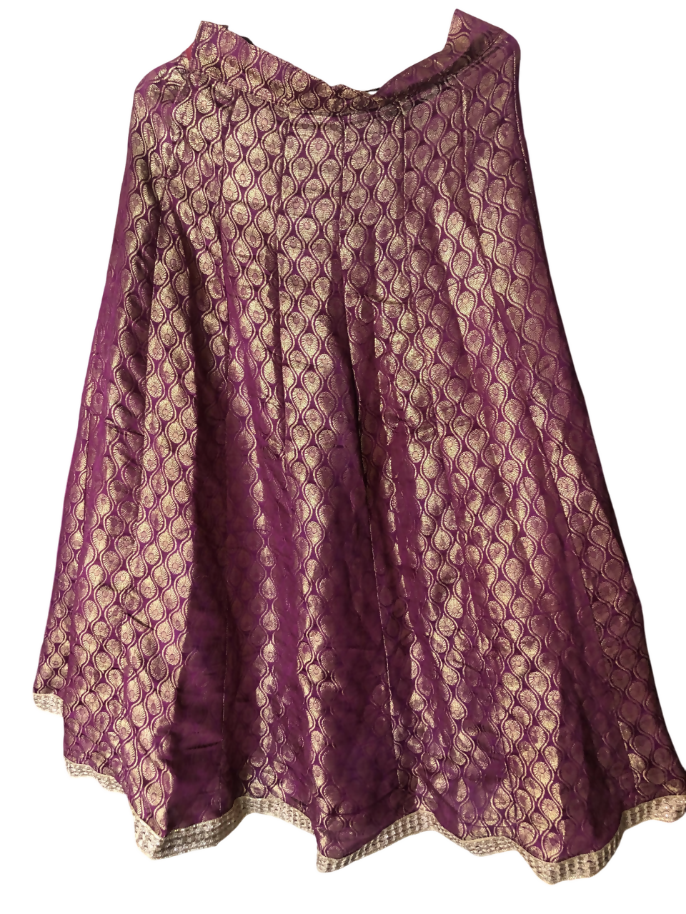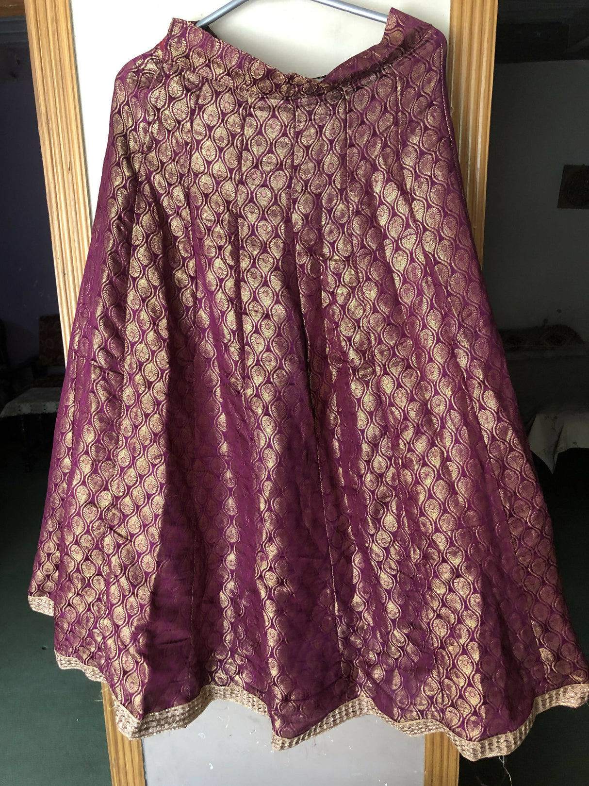 | MATERIAL & MEASUREMENT | 3pc ghagha choli with organza duppta Masoori shirt with detail work and purple ghaghra with embellished ending Ghaghra is adjustable but shirt is perfect for small to medium size Measurement: Kurti: Length 22 inches Chest 18 inches Arm length 16 inches Ghaghra: Length: 39.5 inches Waist: flexible to adjust Flare: 50 inches |