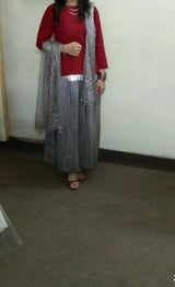 3 PC- Red Maroon Shirt with Skirt and Dupatta | Women Locally Made Formals | Small | Worn Once