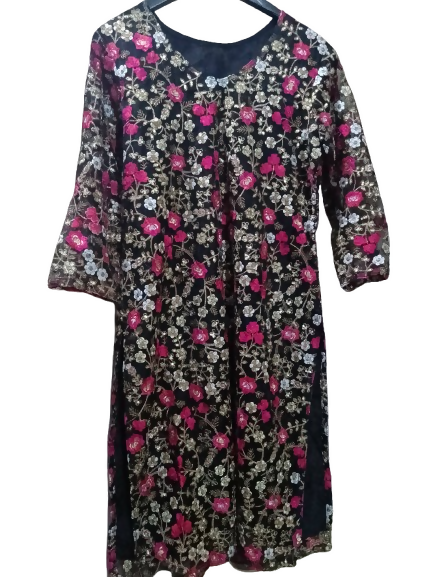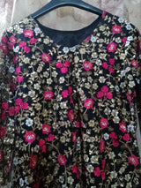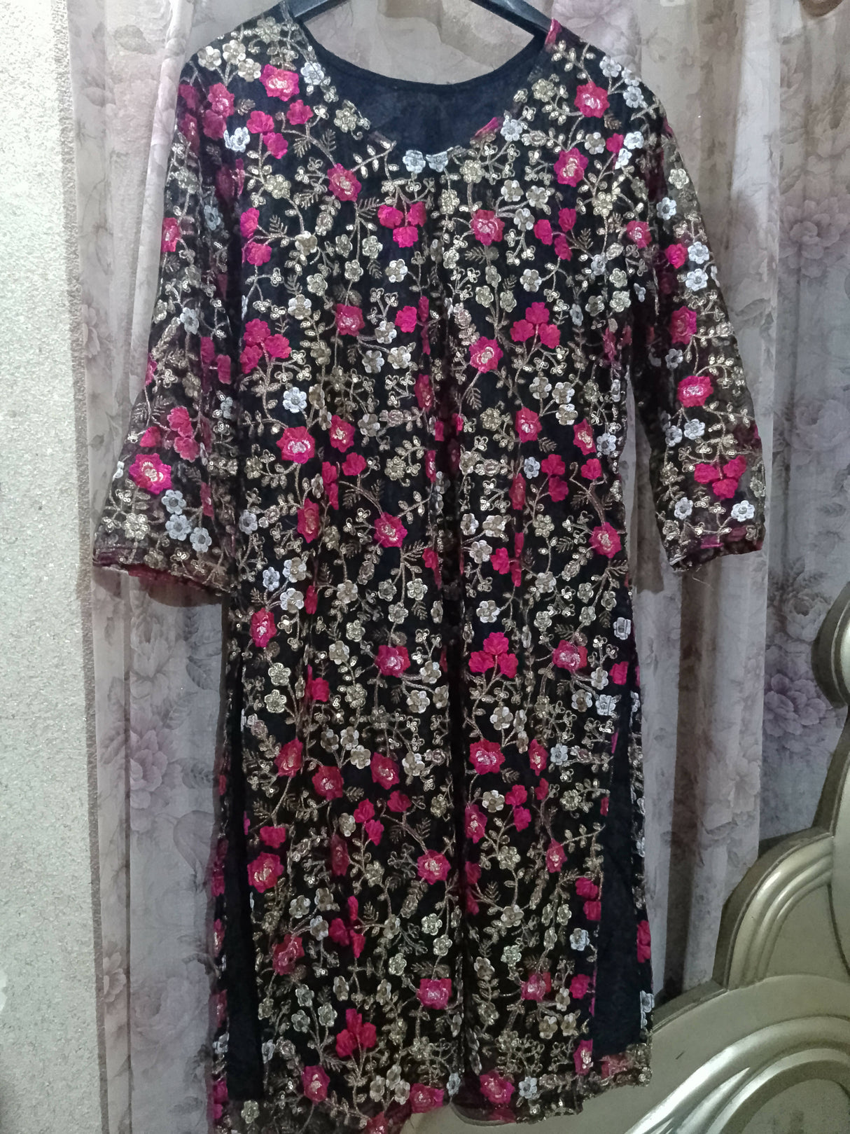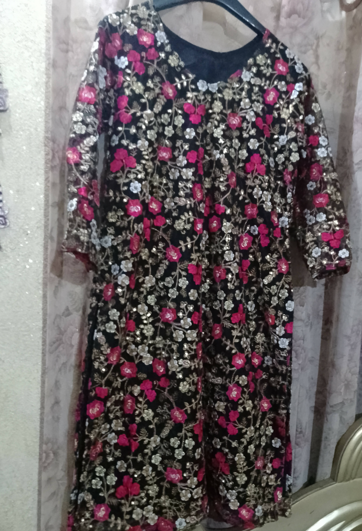 MATERIAL & MEASUREMENT Net fancy fabric full embroidery Colour black Length 35 Chest Size 20 Choori pajama