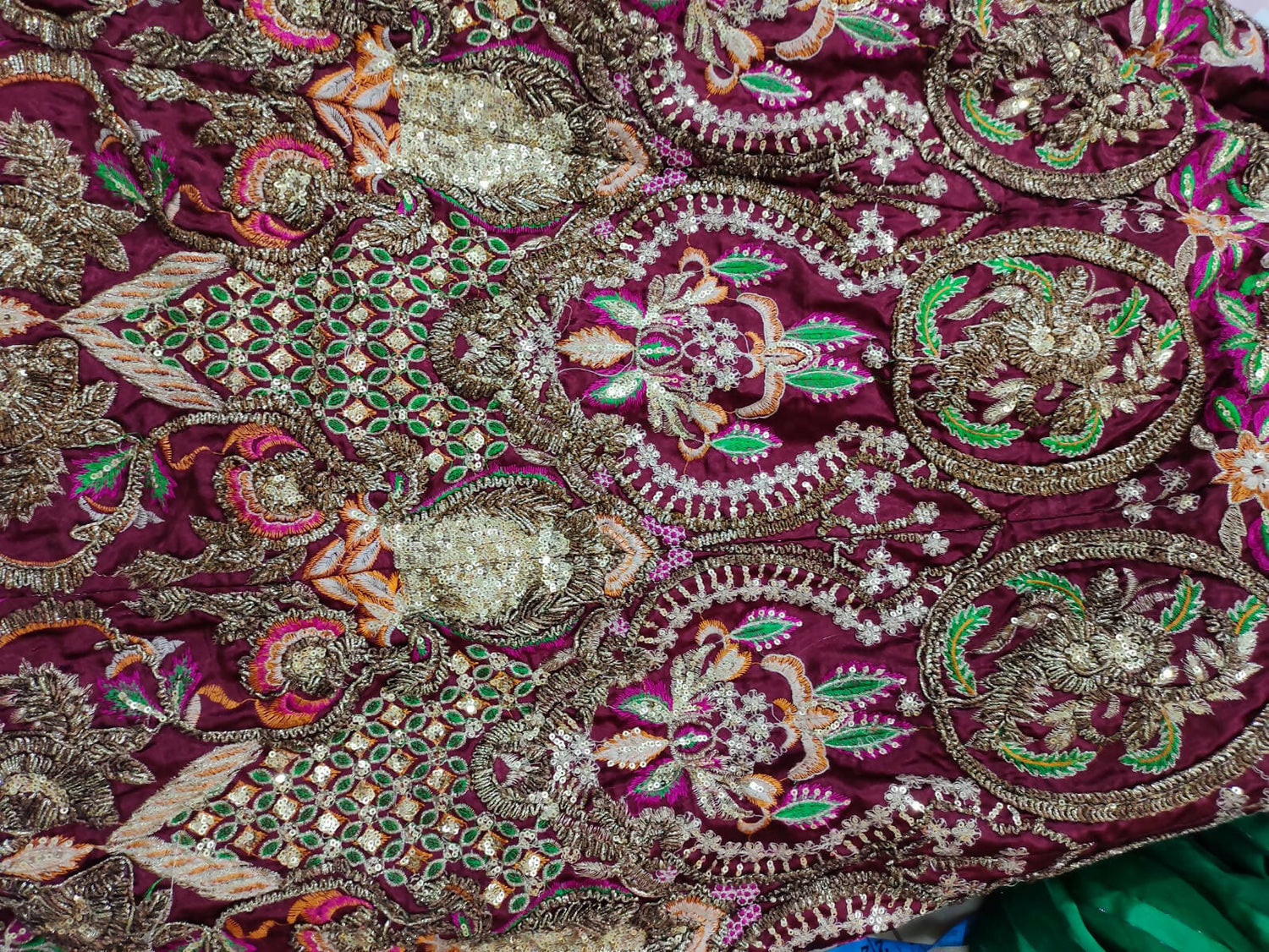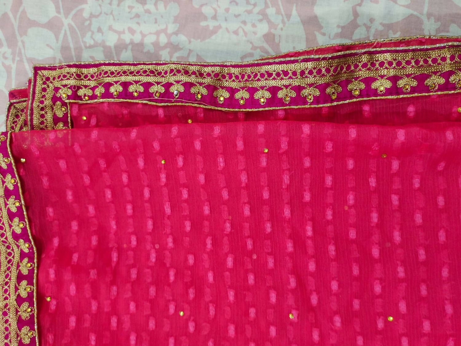 | MATERIAL & MEASUREMENT | Measurements: Sharara length 45 Shirt length 20 Sleeves 18 Bust 36 Heavy gota work on lehenga, Gold Sequins in banarsi silk Shirt And chiffon Dupatta |