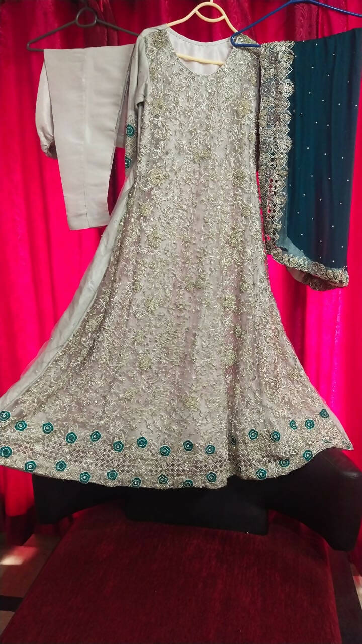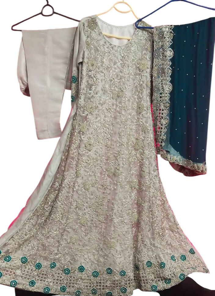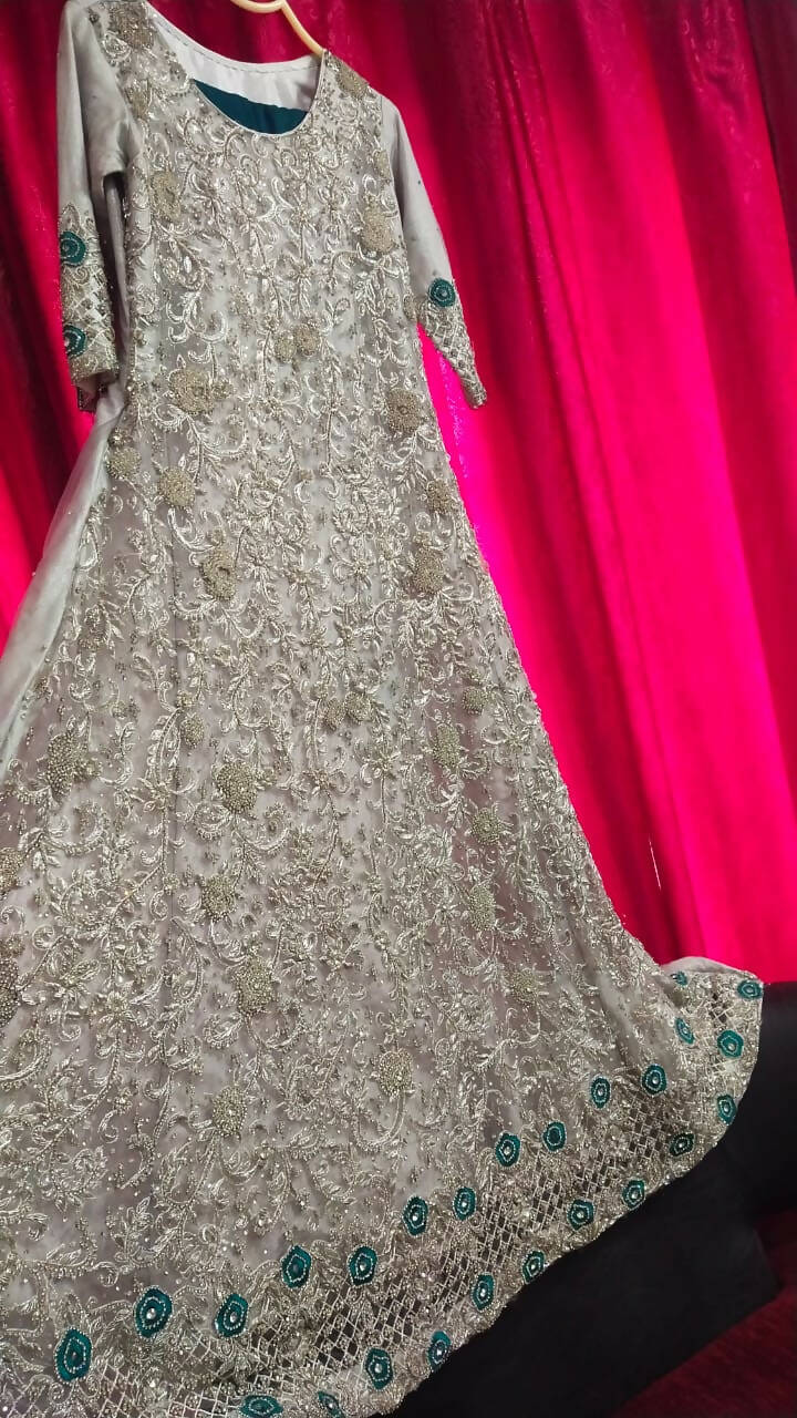 | MATERIAL & MEASUREMENT | Material / fabric: Net long maxi with silk lining with elegant chiffon dupatta and Capri .Measurements: Shoulders:14.5 Chest:19 Sleeves:16 Length:55 Flair:56 Trousers length:35 |