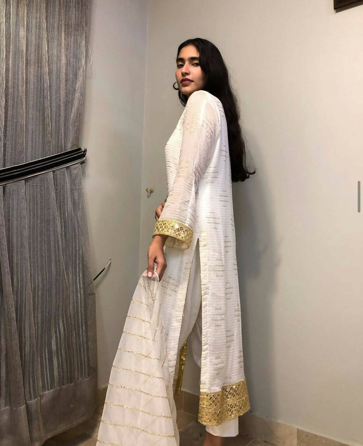 Introducing our exquisite white long kameez with a hint of golden work and golden lace on chaal daman.
