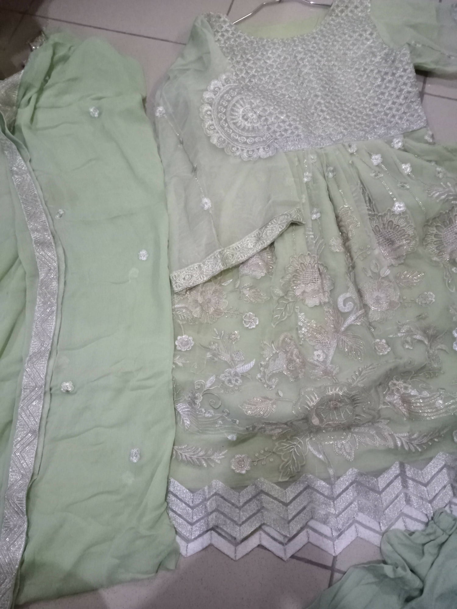 | MATERIAL & MEASUREMENT | Material: Frock length37 Malai trouser 37 Fitting 16 Shoulder 14 Pure duppatta 2.5 yard |