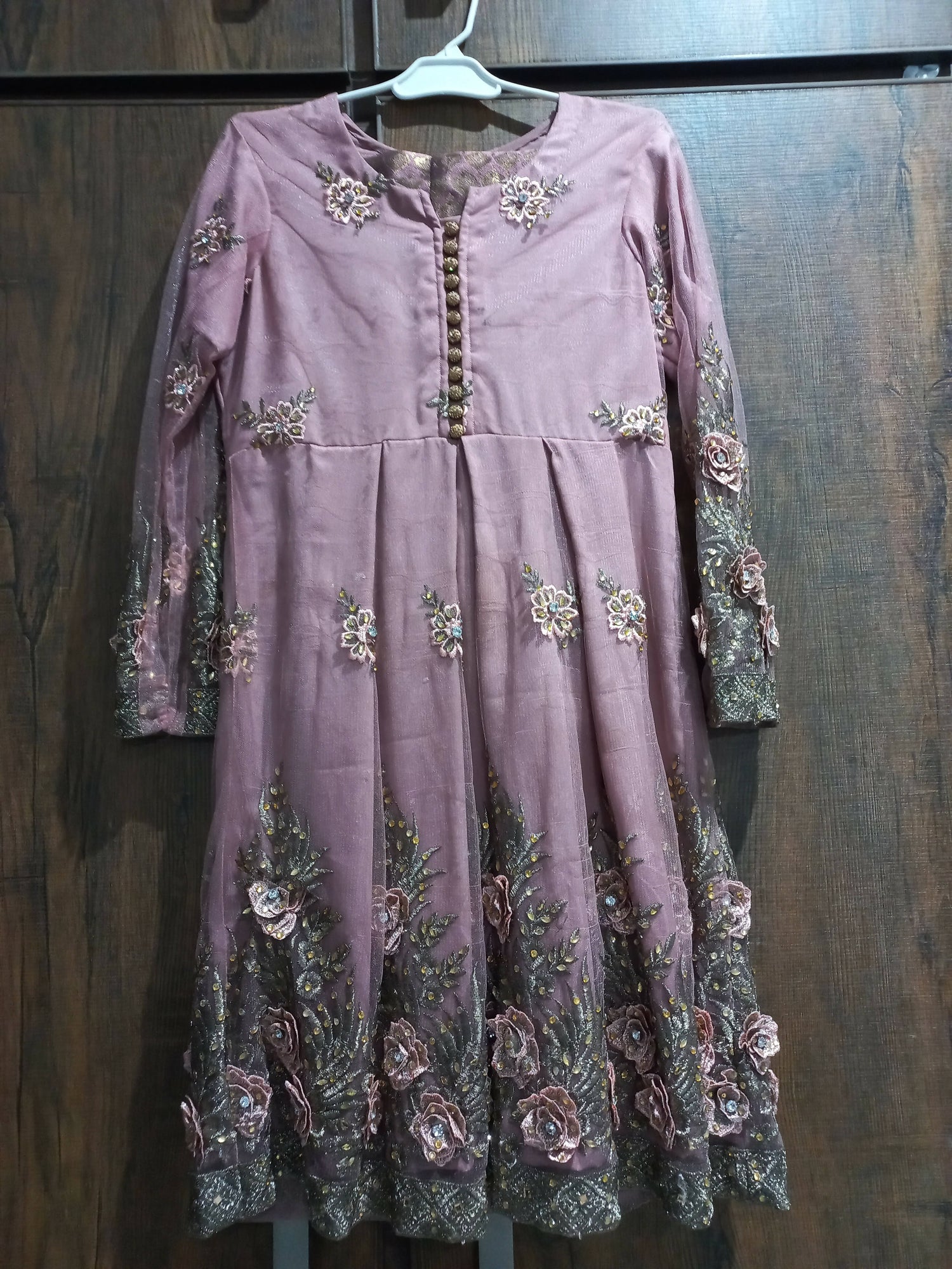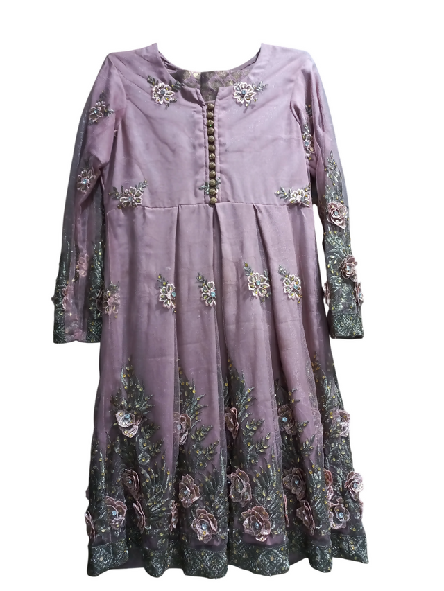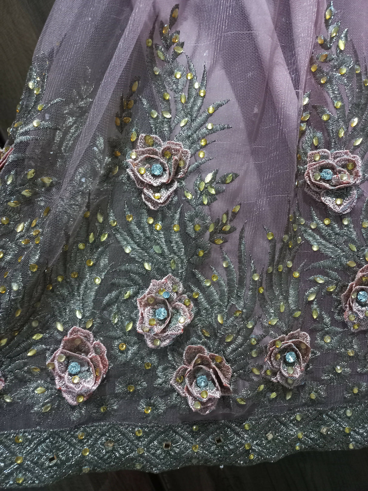 | MATERIAL & MEASUREMENT | Frok Material: Net Trouser Material: Jama-var Frok Length: 36 Chest: 17.5 Shoulder: 14 Baazo lengths: 20 Defect: A little bit scars on the dress, not very prominent |