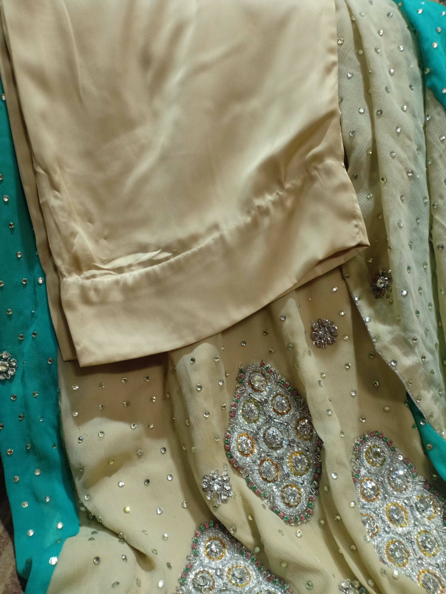 | MATERIAL & MEASUREMENT | Fabric : Pure Chiffon Kora embroidery and beads work Chest: 16 Length: 54 Shoulder: 15.5 Hip: 27 |