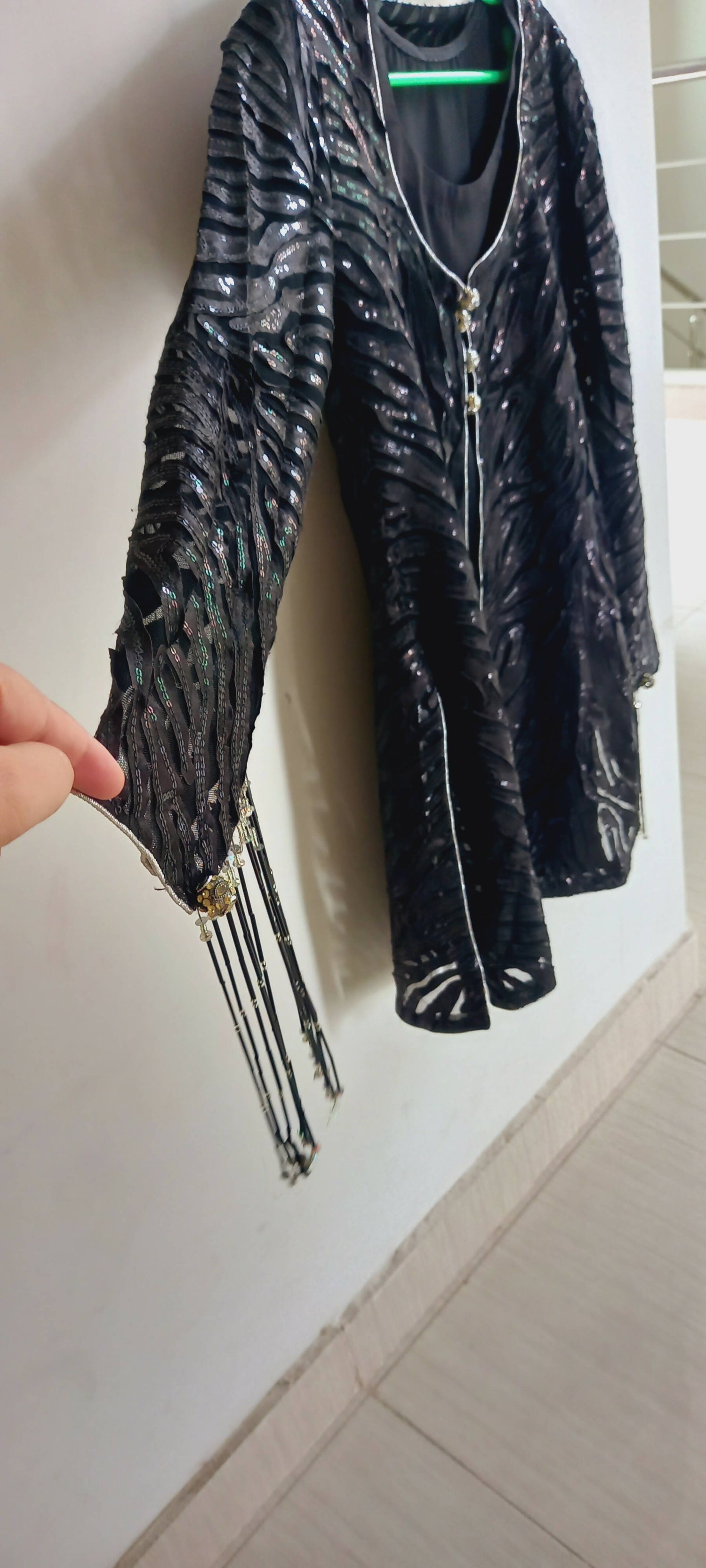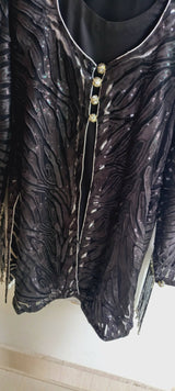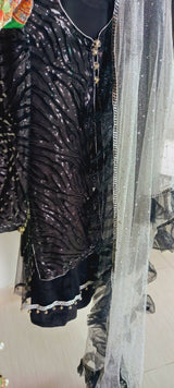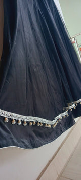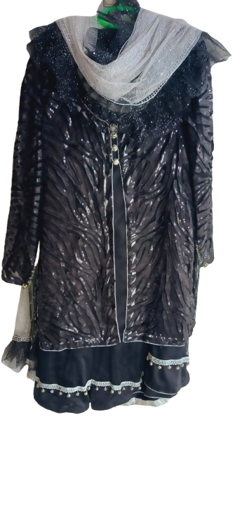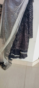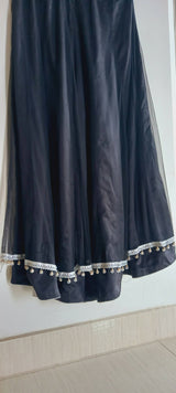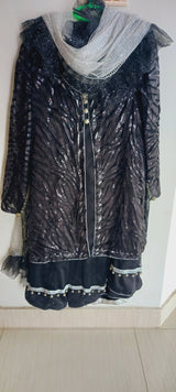 | MATERIAL & MEASUREMENT | Plazo: Black-Net Bajirao-Mastani Style plazo with silver tussled lace Dupatta: Glittery-Silver Net Dupatta with black laced and frilled on all sides Open-Style Gown: Black-Sitara BlackGown with chunnat style sleeves Black Inner- Shirt Measurements: 1: Mastani-Style Plazo:- length: 40 inches 2: Inner-Shirt:- length: 31 inches sleeves: 5 inches teera: 14 inches chest: 18 inches back(qamar): 16 inches hips: 20 inches 3: Black-Gown :- sleeves(chunnat style): 23 inches teera: 15 inches chest: 18 inches back(qamar): 17 inches hips: 20 inches |