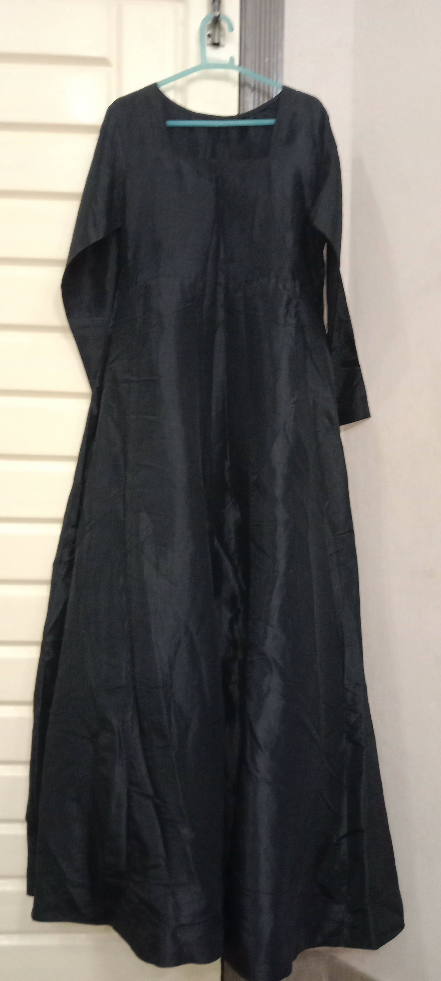 MATERIAL & MEASUREMENT Fabric : Kataan Silk Color black Additional details kaliyaan on maxi plus can can under the maxi Paired up with dupatta. Red duppata with golden lace and pearls Measurements: Length : 56 Sleeves : 21 Waist : 15 Gehra : 56