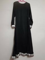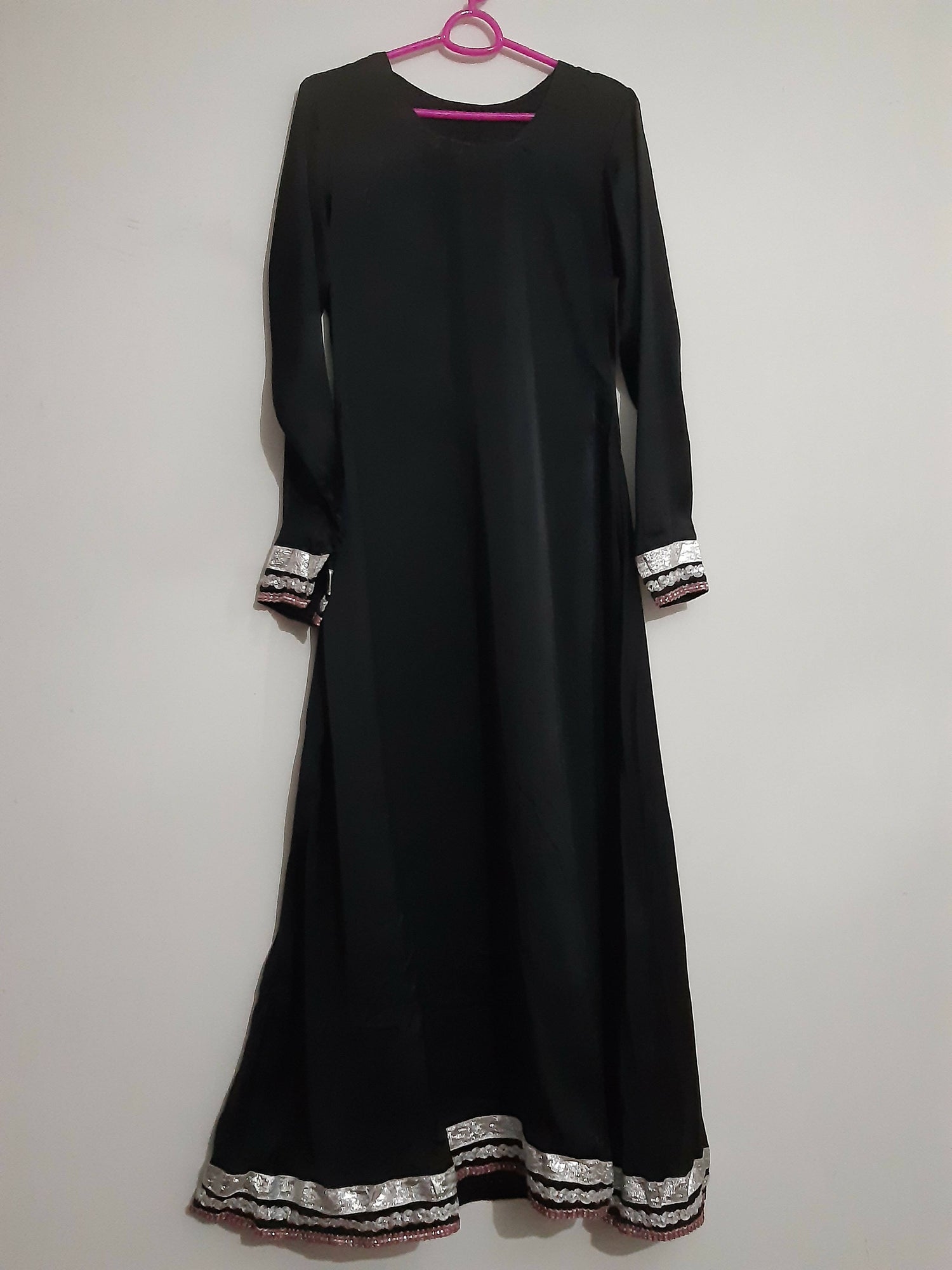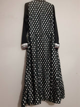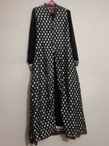 | MATERIAL & MEASUREMENT | Colour : Black Fabric of maxi : Pure Silk Fabric of Gown: Pure Jamawar Maxi length: 53 inches Maxi chest :17 inches Maxi shoulder : 14 inches Sleeves : 24 inches Gown sleeves : sleeve less Gown length: Same as maxi |