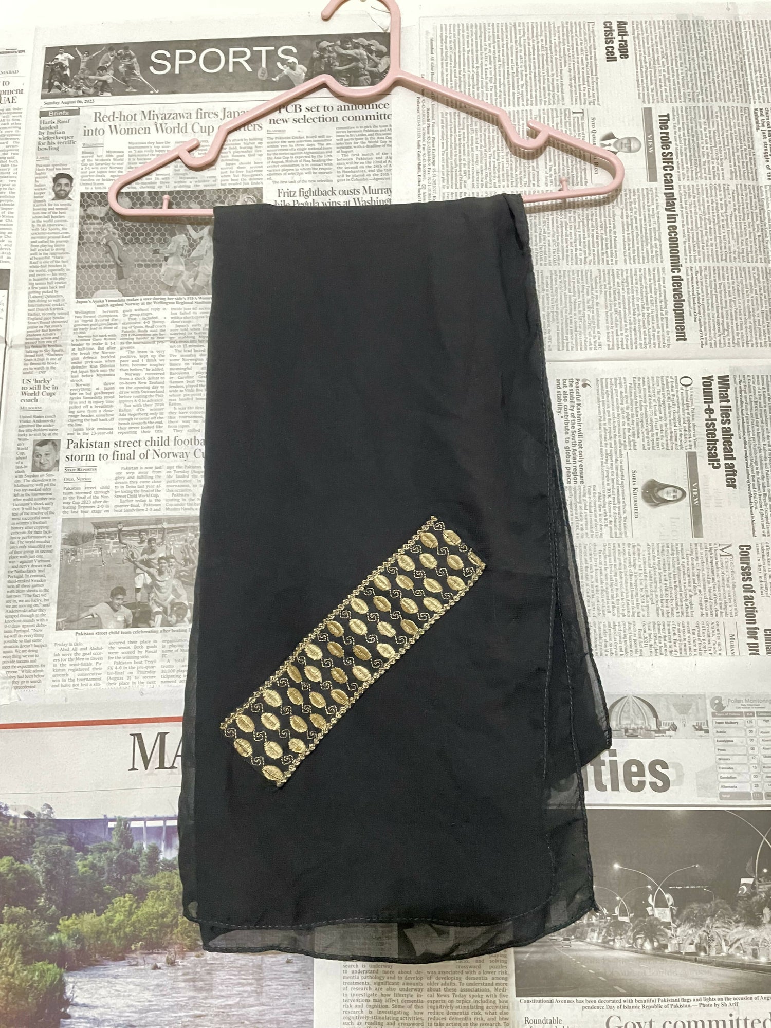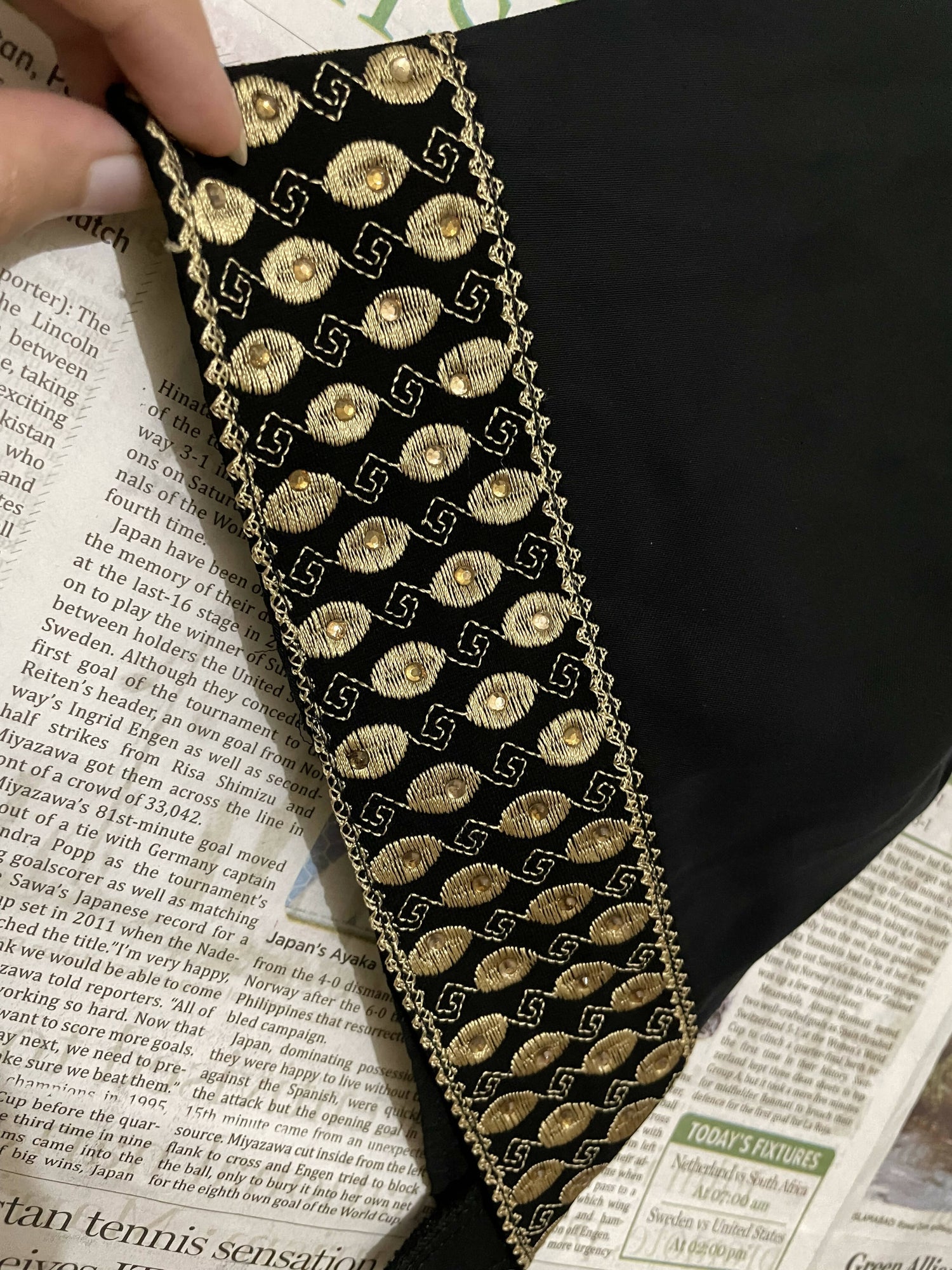| MATERIAL & MEASUREMENT | Medium Measurement: Length - 58 inches Sleeves - 24 Chest - 24 Waist - 23 Hips - 30 Flare - 88 inches (Embroidered lace with golden stones) Comes with matching black scarf Scarf measurements: Length - 75.5 Width - 28 |