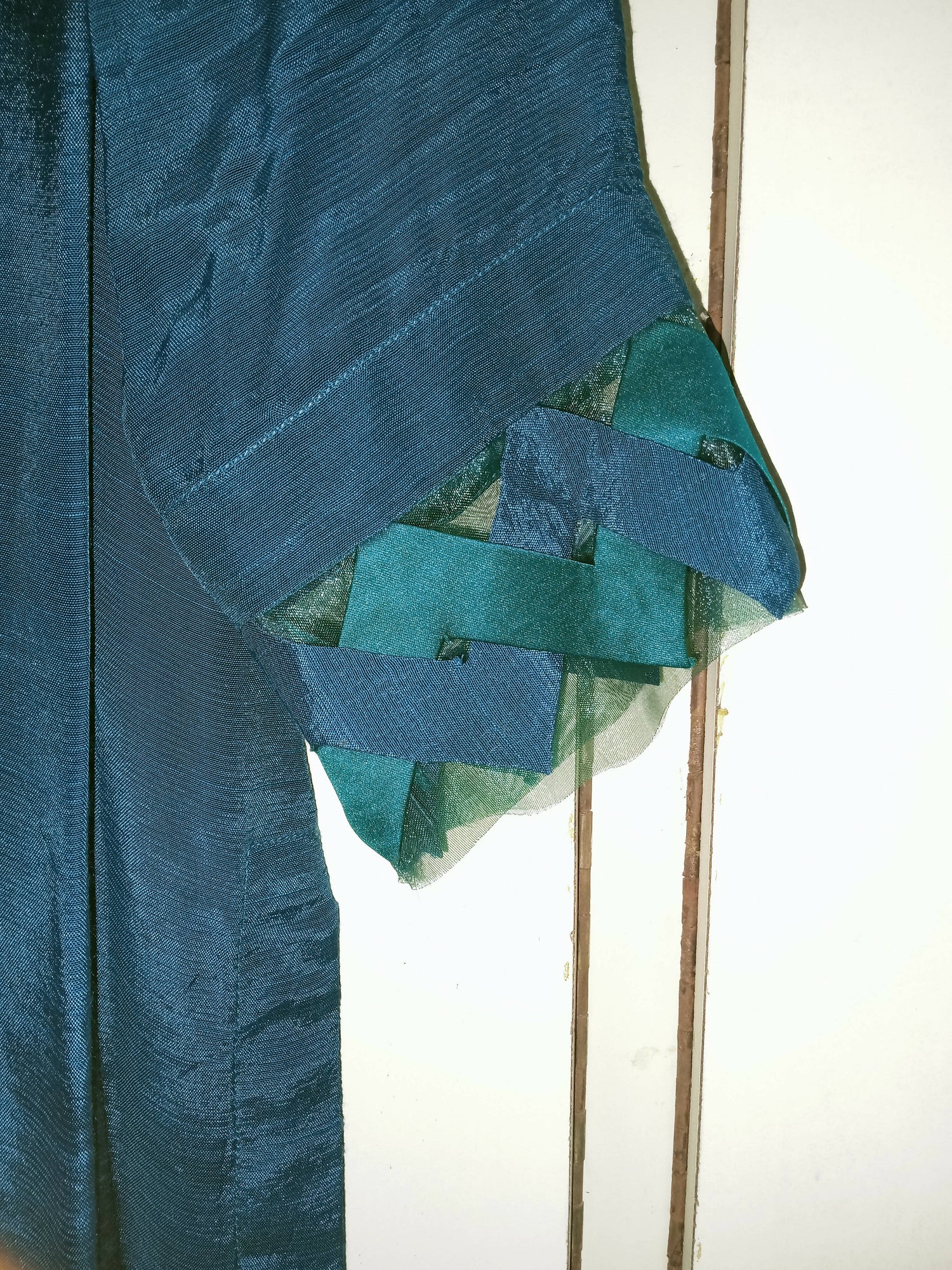 | MATERIAL & MEASUREMENT | Three piece completely stitch Pakistani silk outfit in blue and peacock green color with hand embellishments and diamonties. Comes with shirt, trouser and two tone dyed dupatta. Chest 19.5 Sleeves 21 |