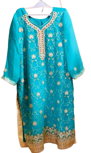 | MATERIAL & MEASUREMENT | Measurements: kameez: Length: 42 inch Width: 22 inch Sleeves: 22 inch Chest: 22 inch Shoulder: 16 inch Daman: 30 inch Shalwar: length: 40 inch Pancha: 8 inch Material: Reshmi |