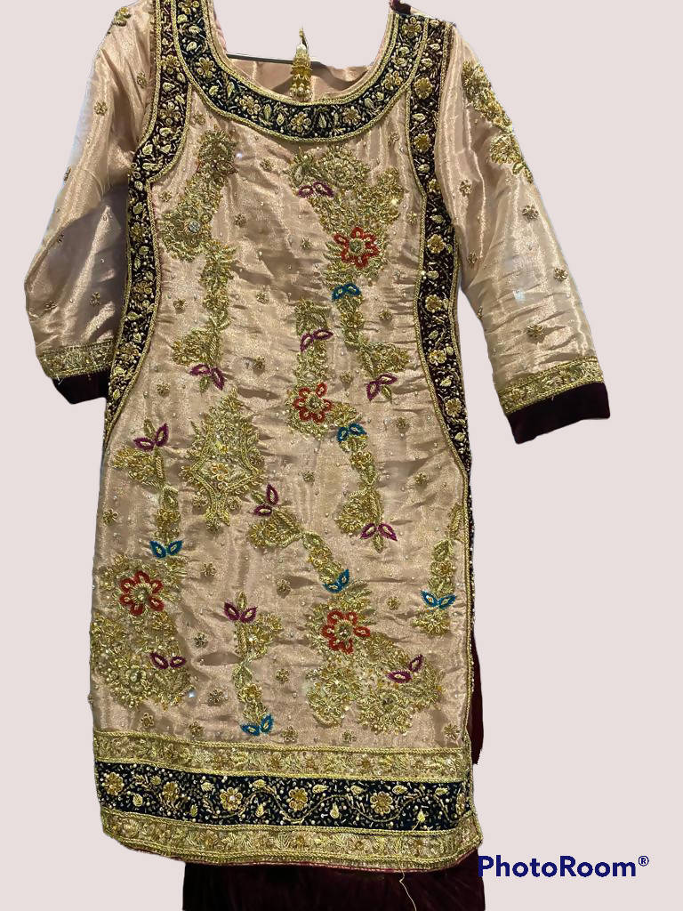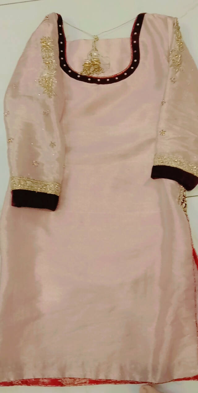 | MATERIAL & MEASUREMENT | Organza n velvet base shirt with kora dabka Resham pearl workOrganza n velvet base shirt with kora dabka Resham pearl work Kamiz Size: medium Fabric :Organza Material:kora ,dabka ,Resham ,pearl ,stars,fresh nag Color:peach pink Made in with Adda embroidery on velvet n organza Original price25000 Selling price10000 Used:worn once, Condition: score on 9/10 Measurements: Chest:18 inches Length:36inches Shoulder:9 inches |