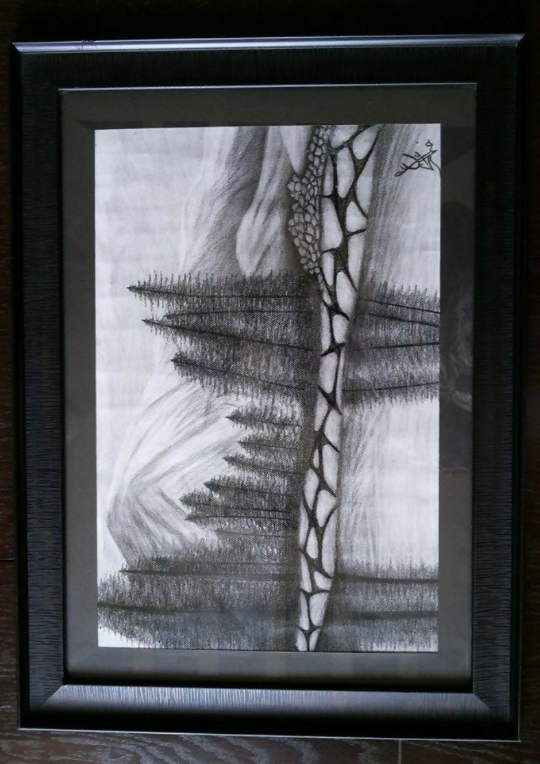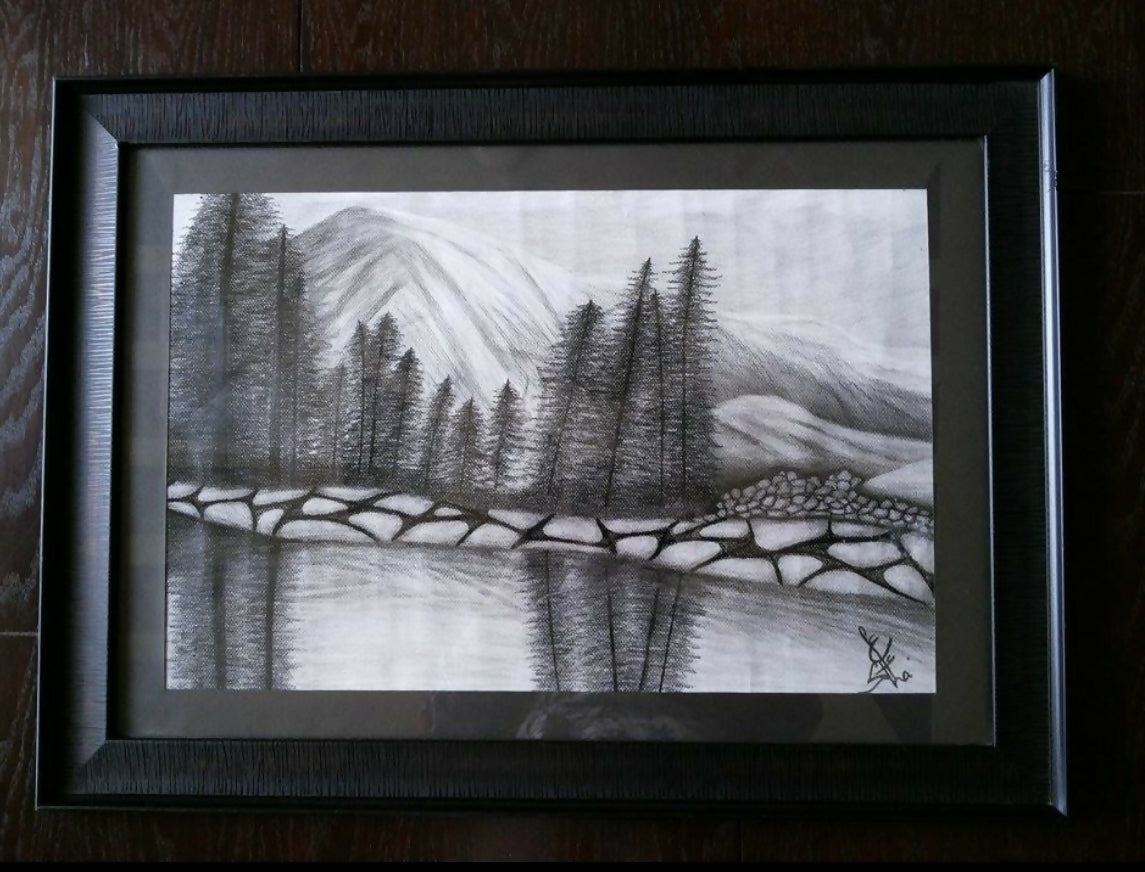 | MATERIAL & MEASUREMENT | Charcoal sketch on paper Glass frame 15*22 inches |