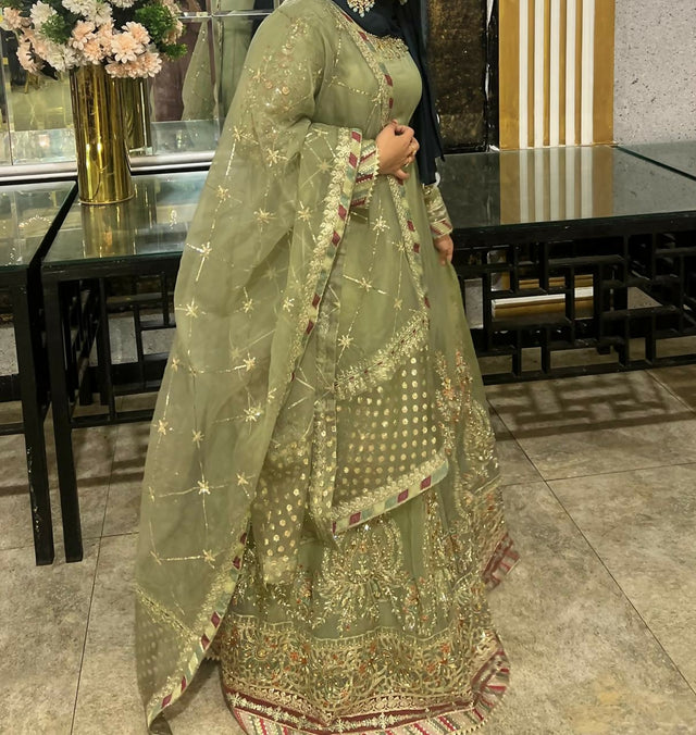 Beautiful pastel green 3-piece formal suit with heavy embroidery and intricate handwork. Includes embroidered shirt, embellished dupatta, and matching trousers. Perfect for weddings, parties, or festive wear. Worn only once and kept in excellent condition.