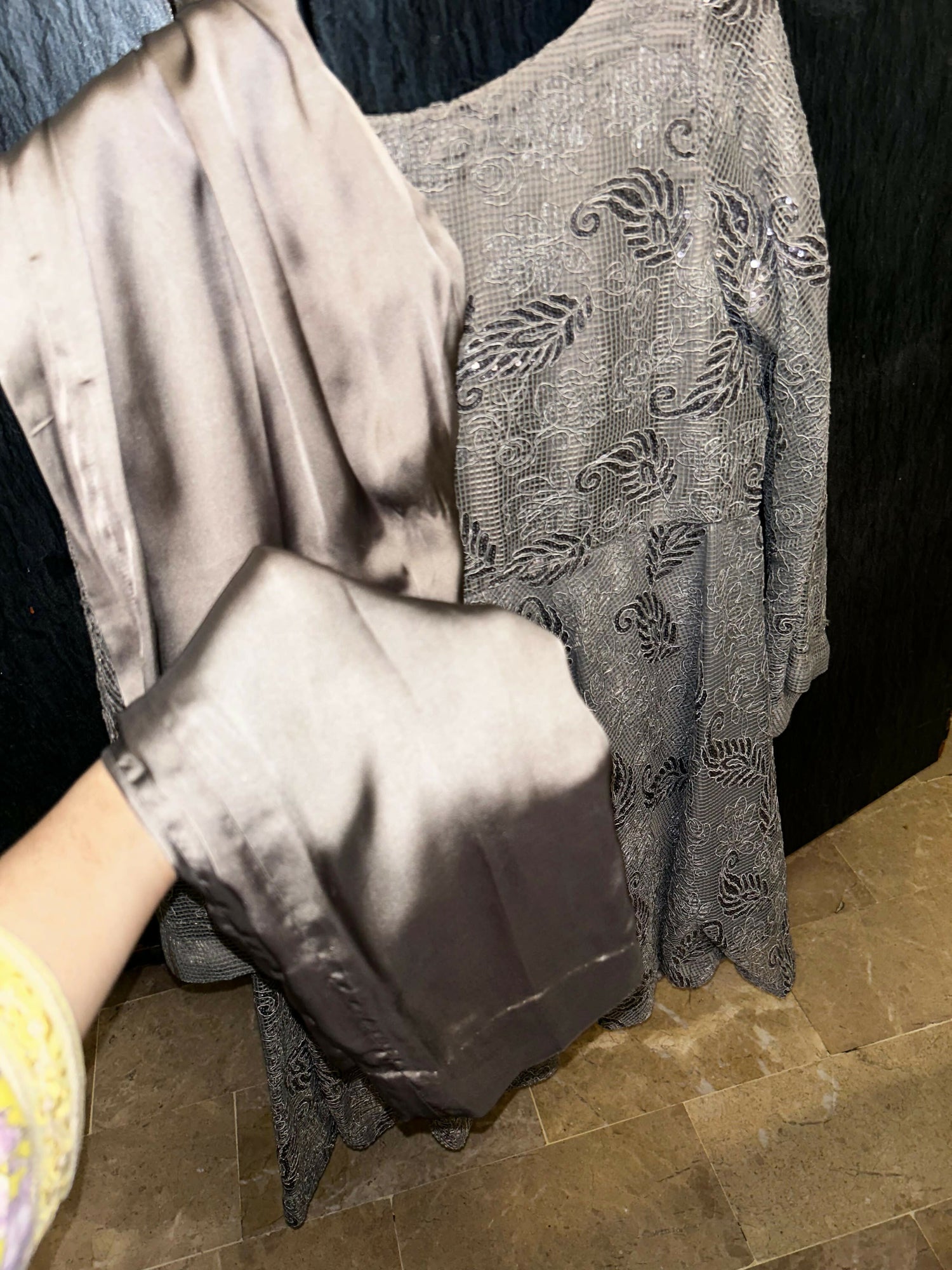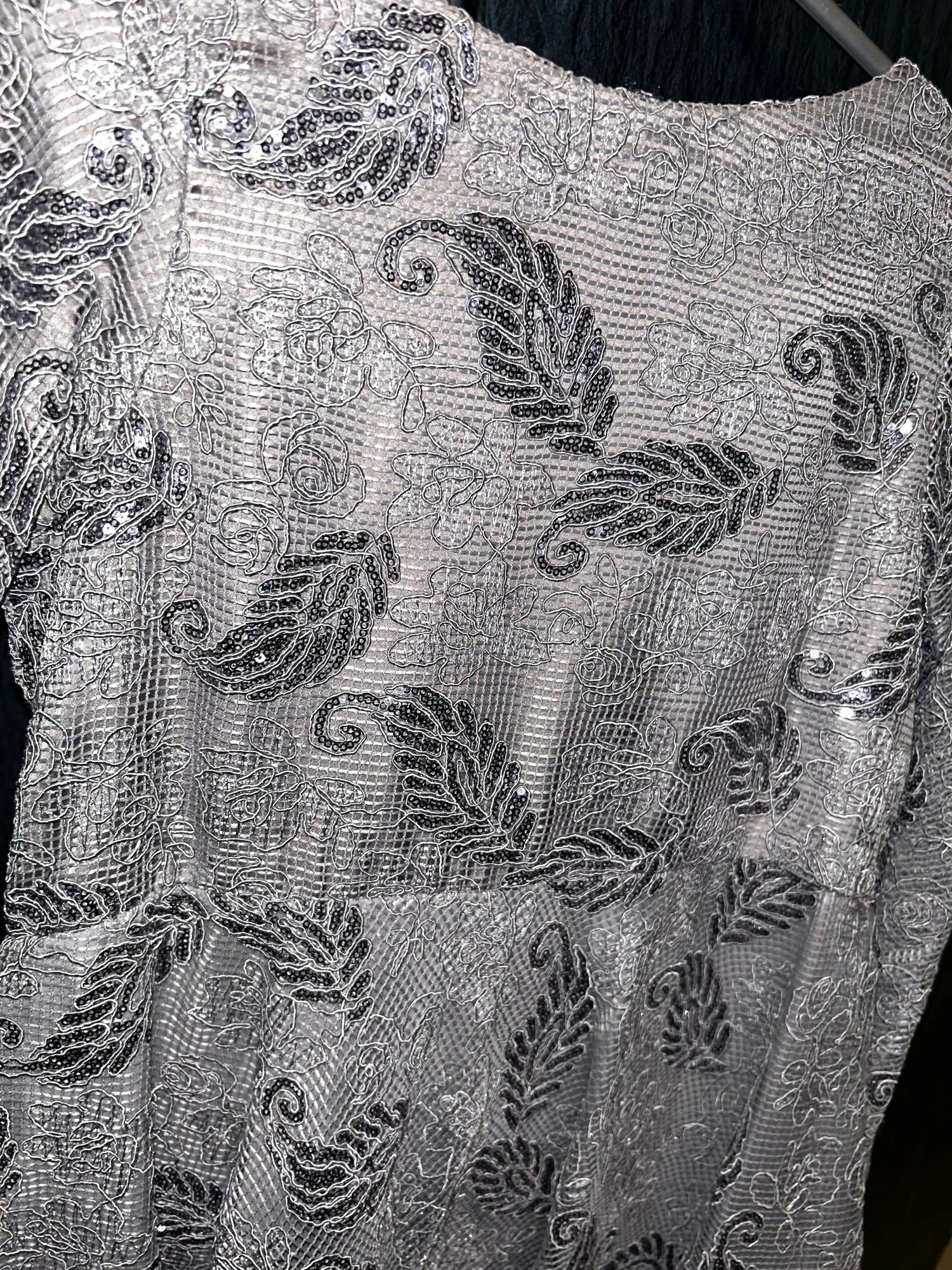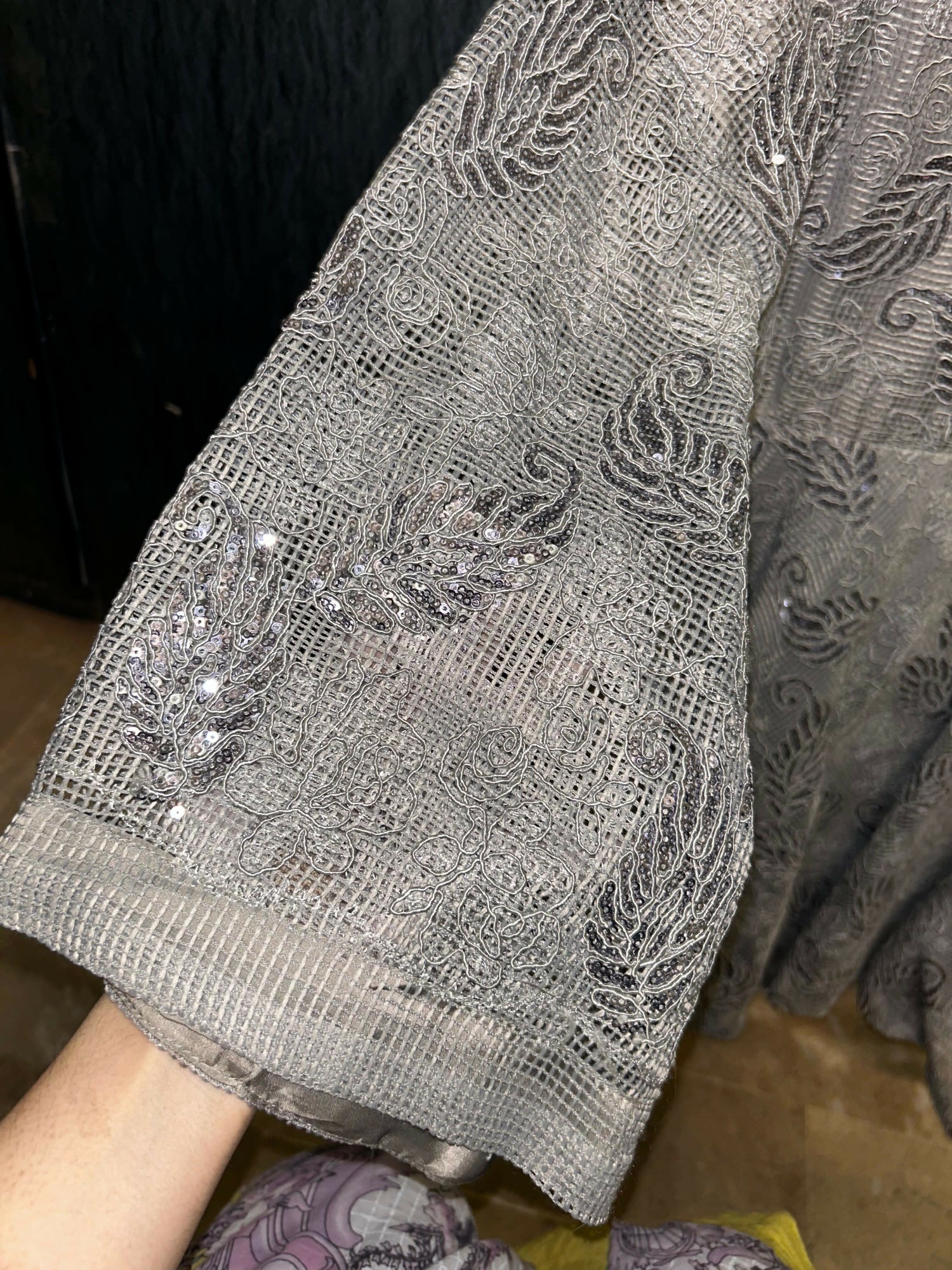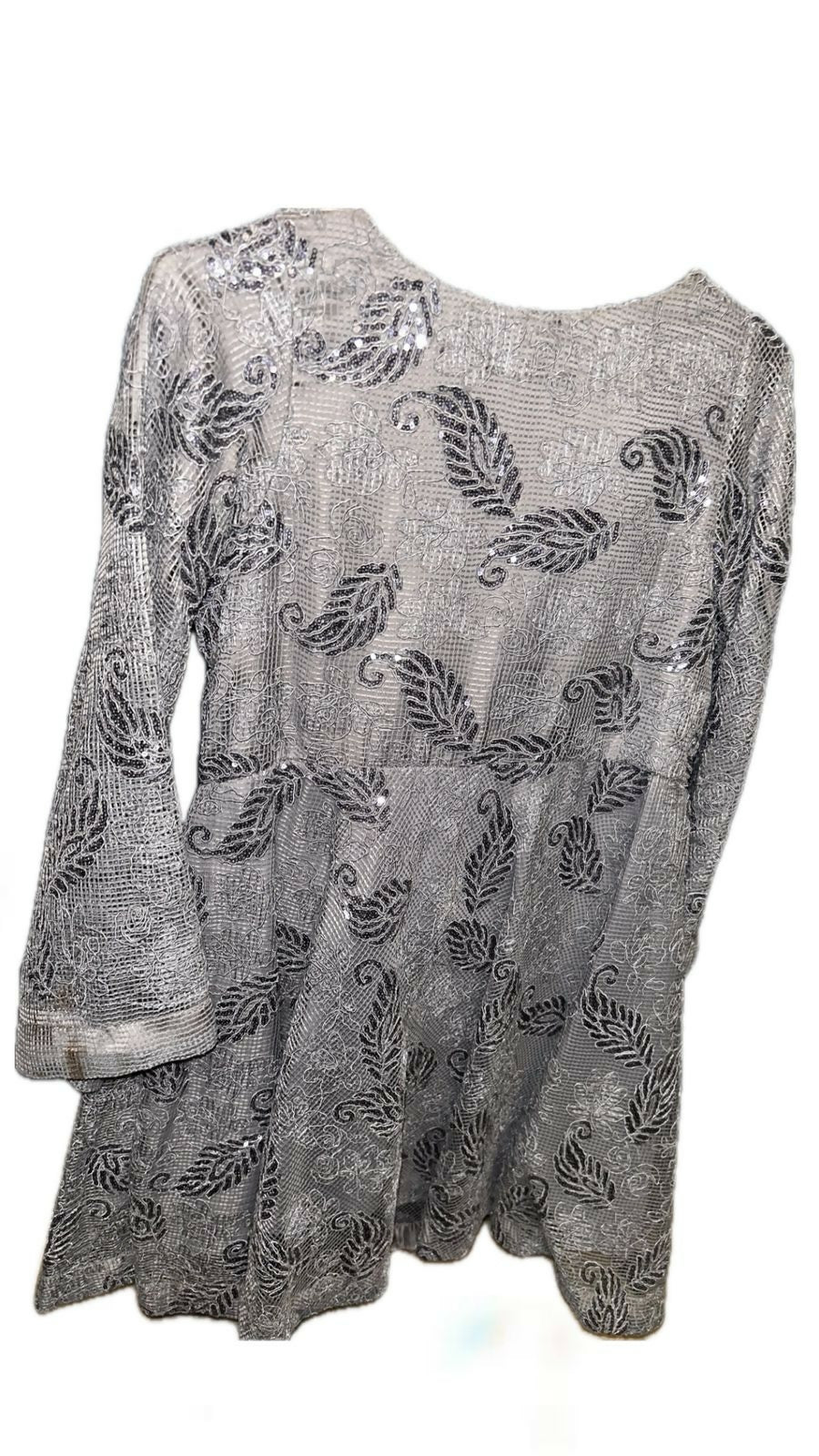 A beautifully stitched silver frock set designed for formal wear. The frock features a delicate net fabric with intricate floral and leaf motif embroidery, embellished with silver sequins. It includes: