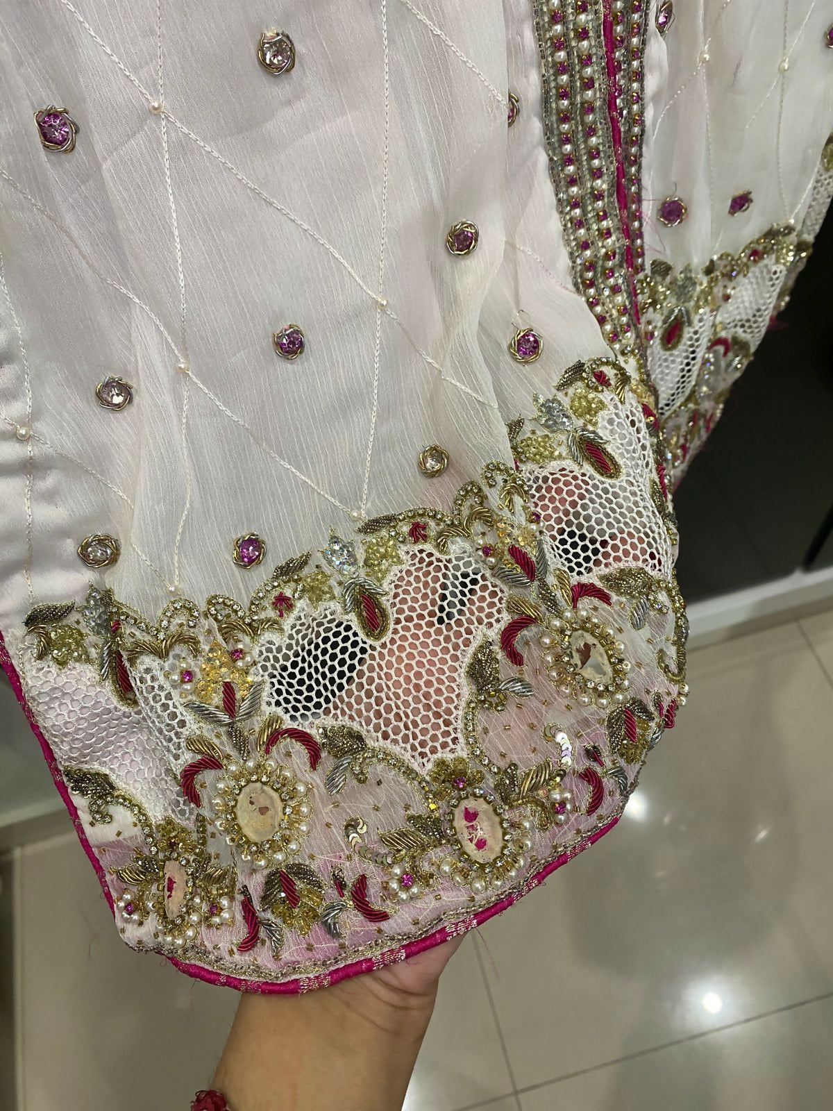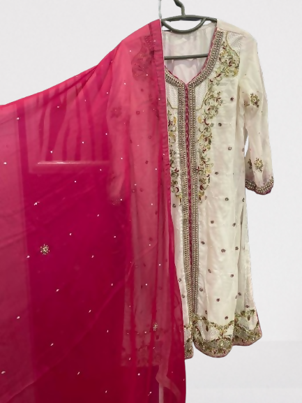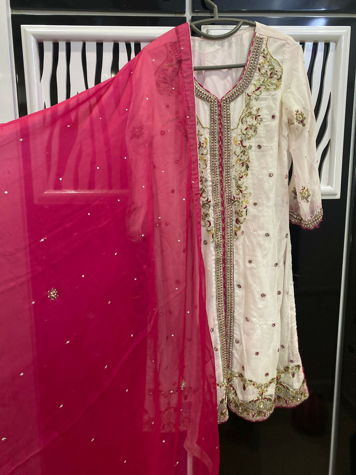 | MATERIAL & MEASUREMENT | SHIRT: stuff : CHIFFON WITH LINING Size : Large Condition: 8/10 Color: white DUPATTA: Stuff: chiffon Color: pink fully chan added in dupatta Condition : 9/10 Trouser: Stuff : Raw Silk Size: Large Condition: 10/10 |