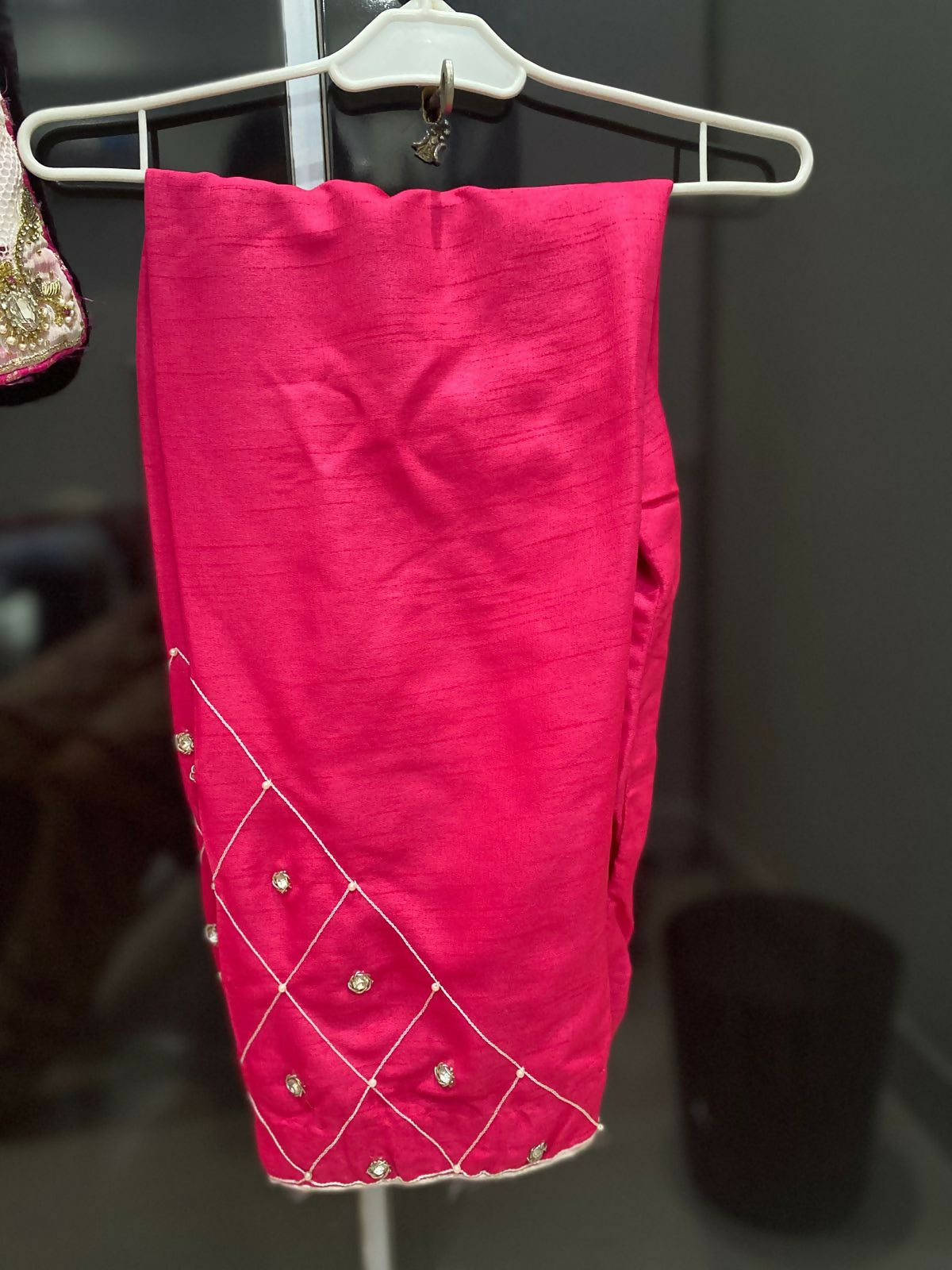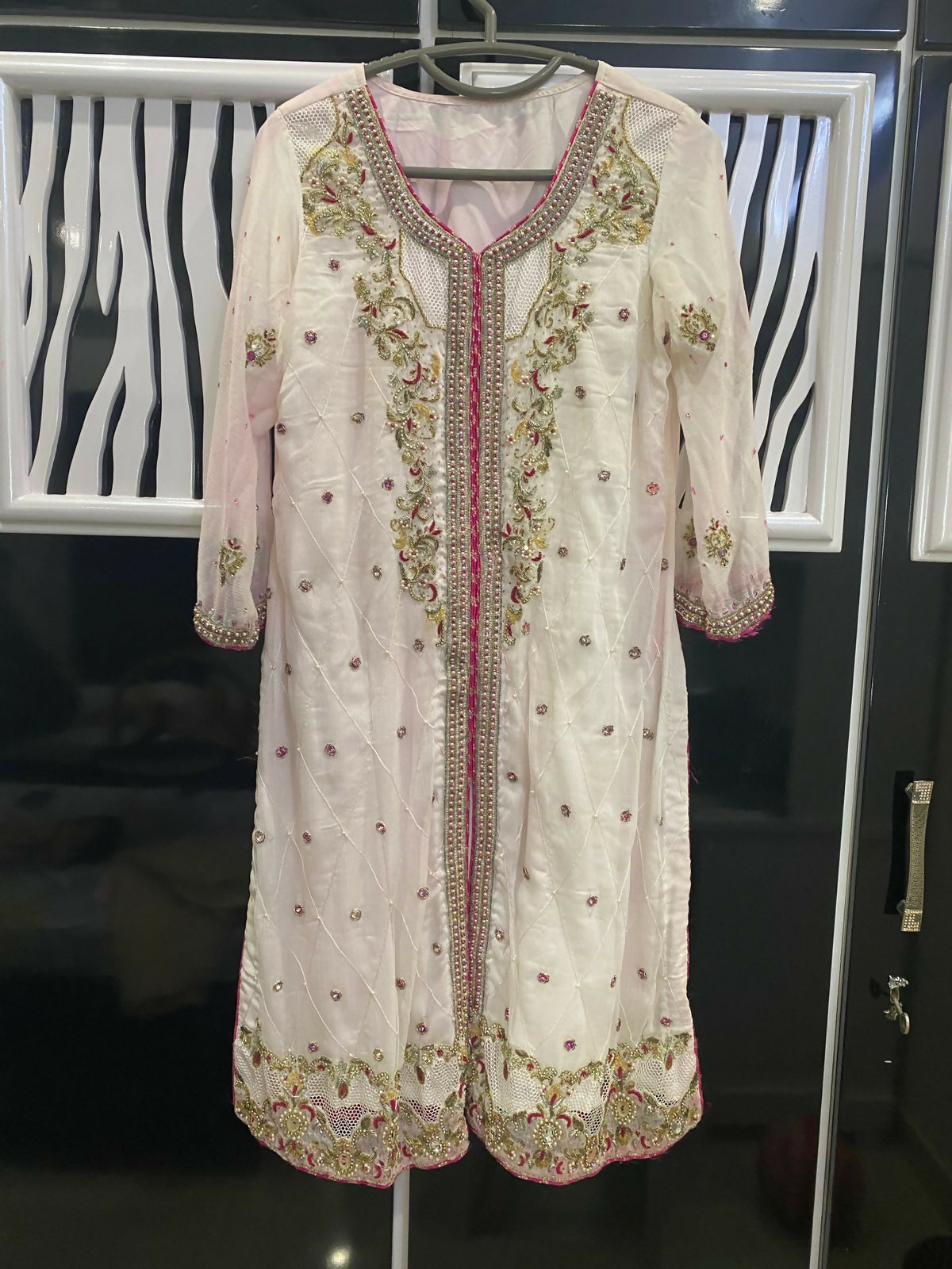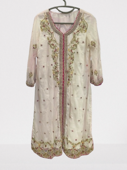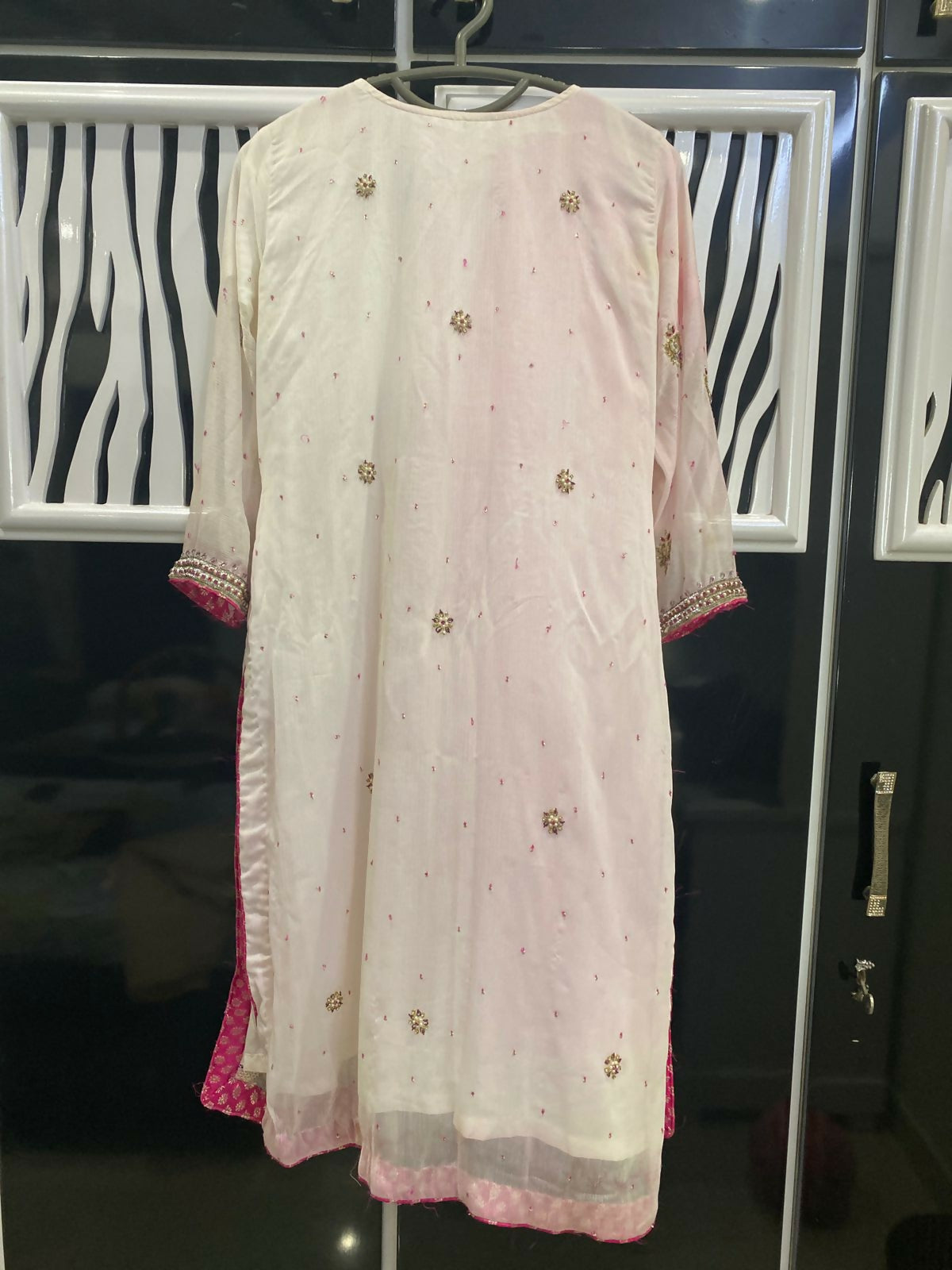 | MATERIAL & MEASUREMENT | SHIRT: stuff : CHIFFON WITH LINING Size : Large Condition: 8/10 Color: white DUPATTA: Stuff: chiffon Color: pink fully chan added in dupatta Condition : 9/10 Trouser: Stuff : Raw Silk Size: Large Condition: 10/10 |