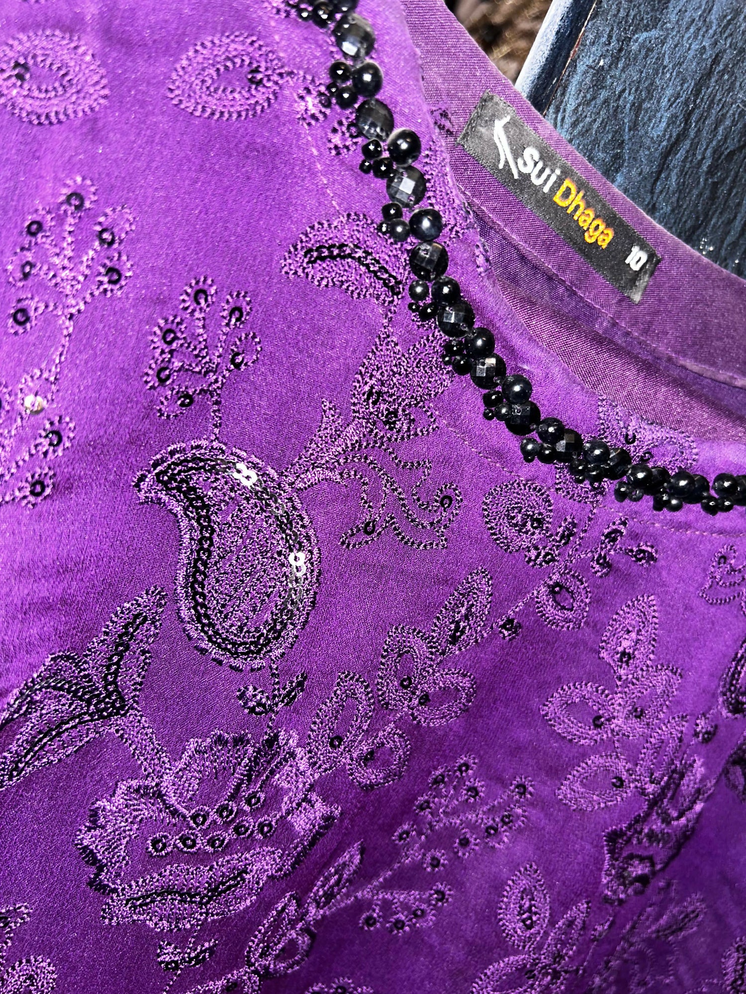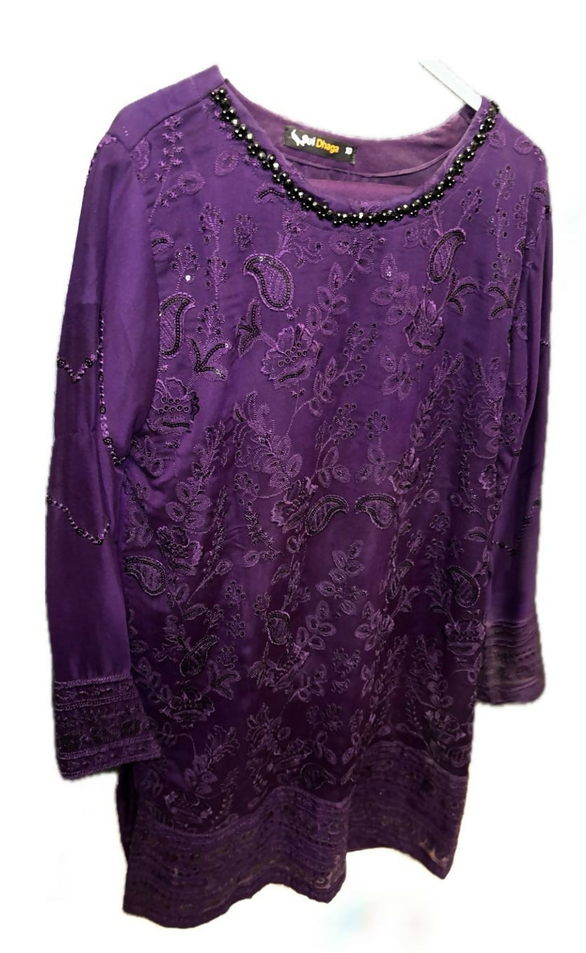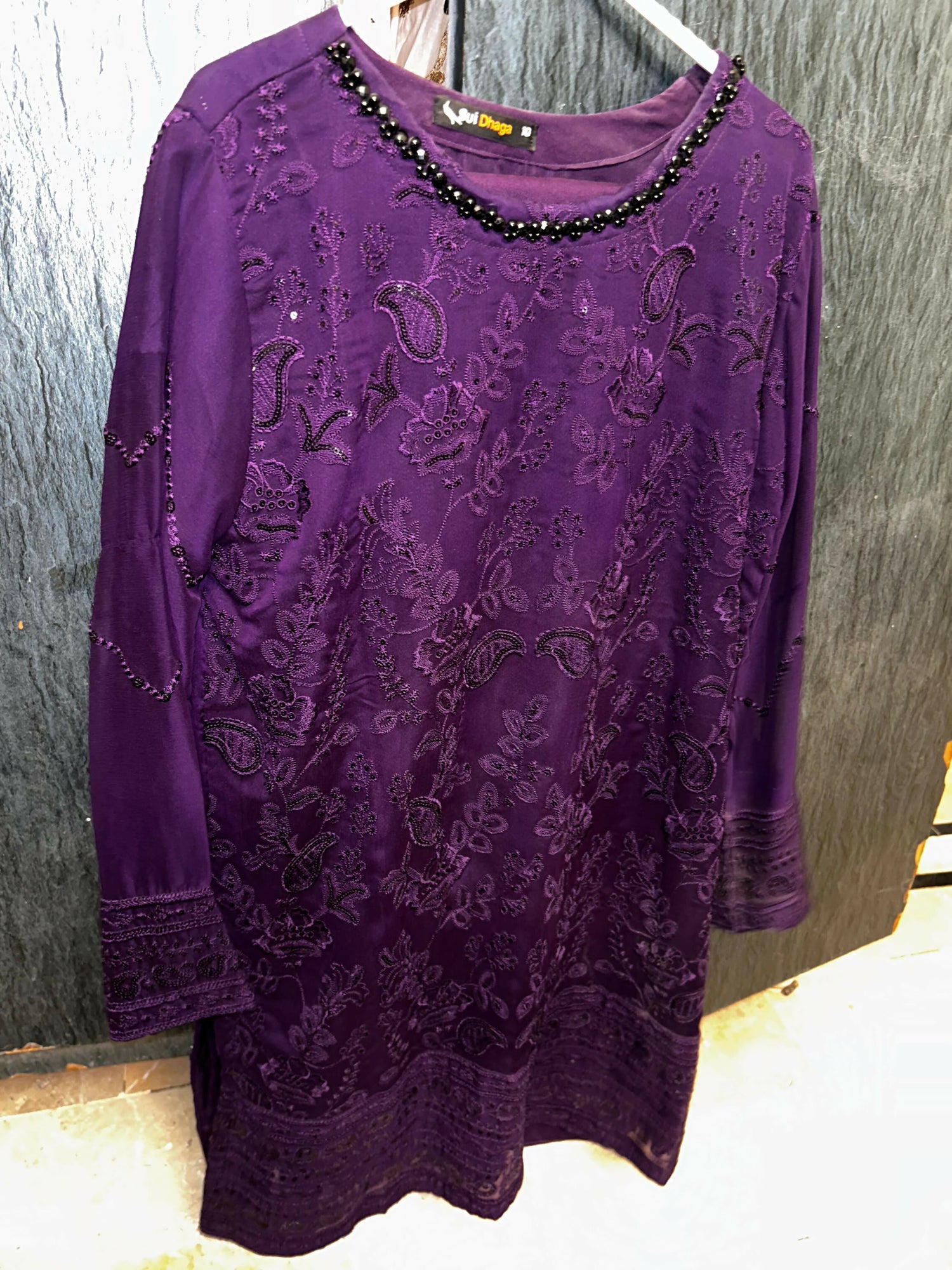 Shirt: Chiffon fabric with intricate embroidery on the front; round neckline and full sleeves.