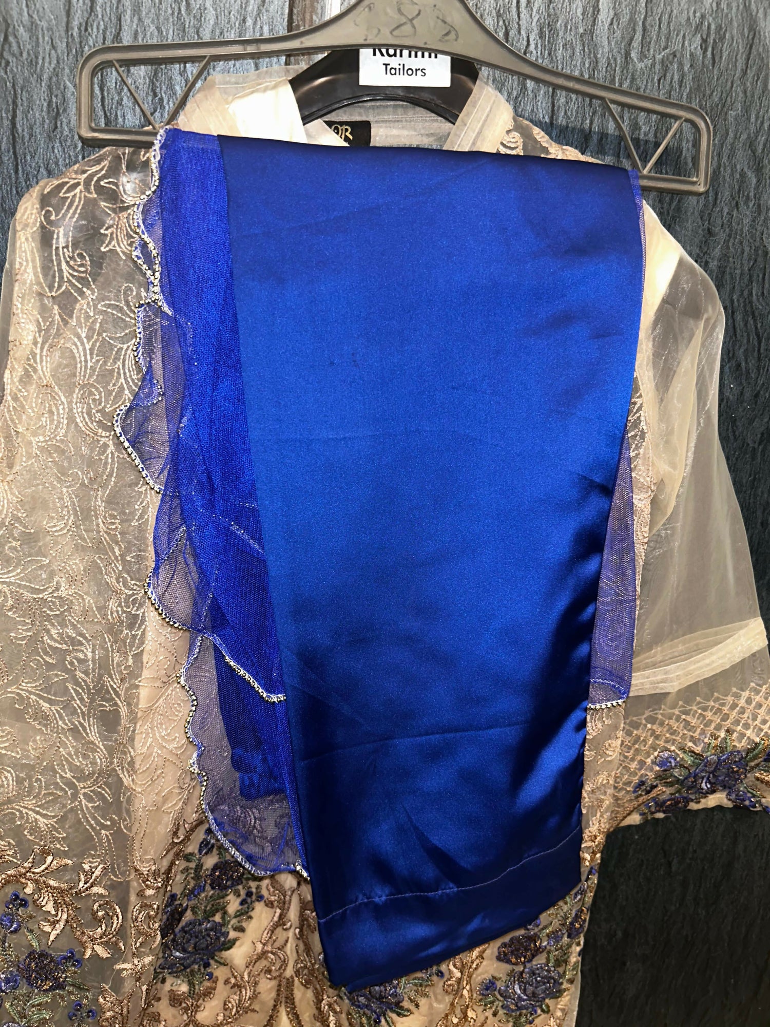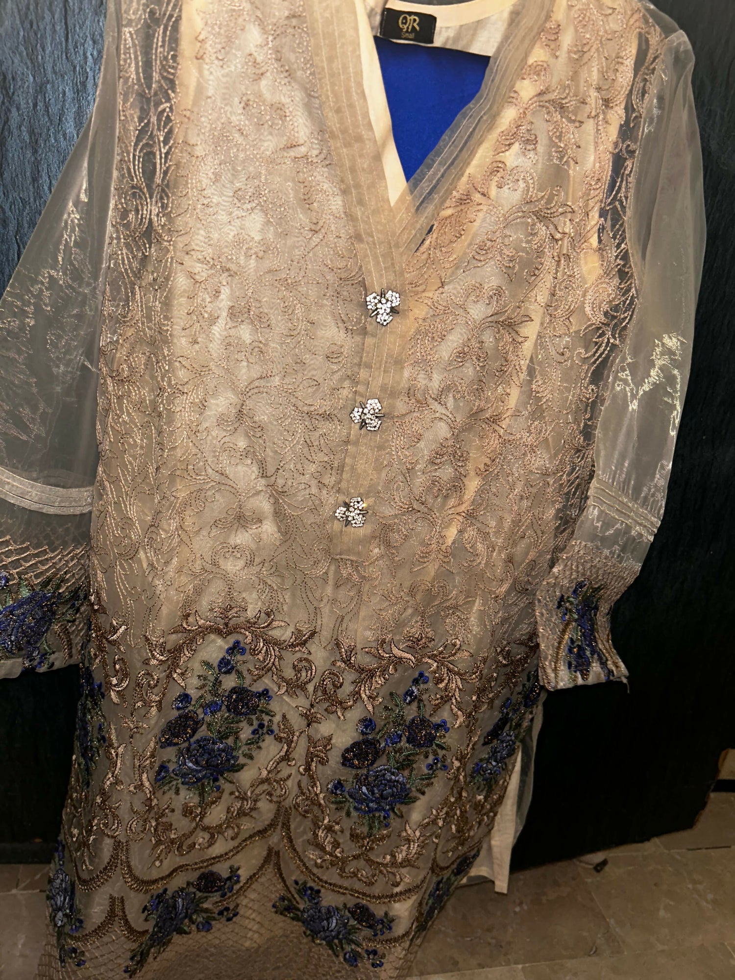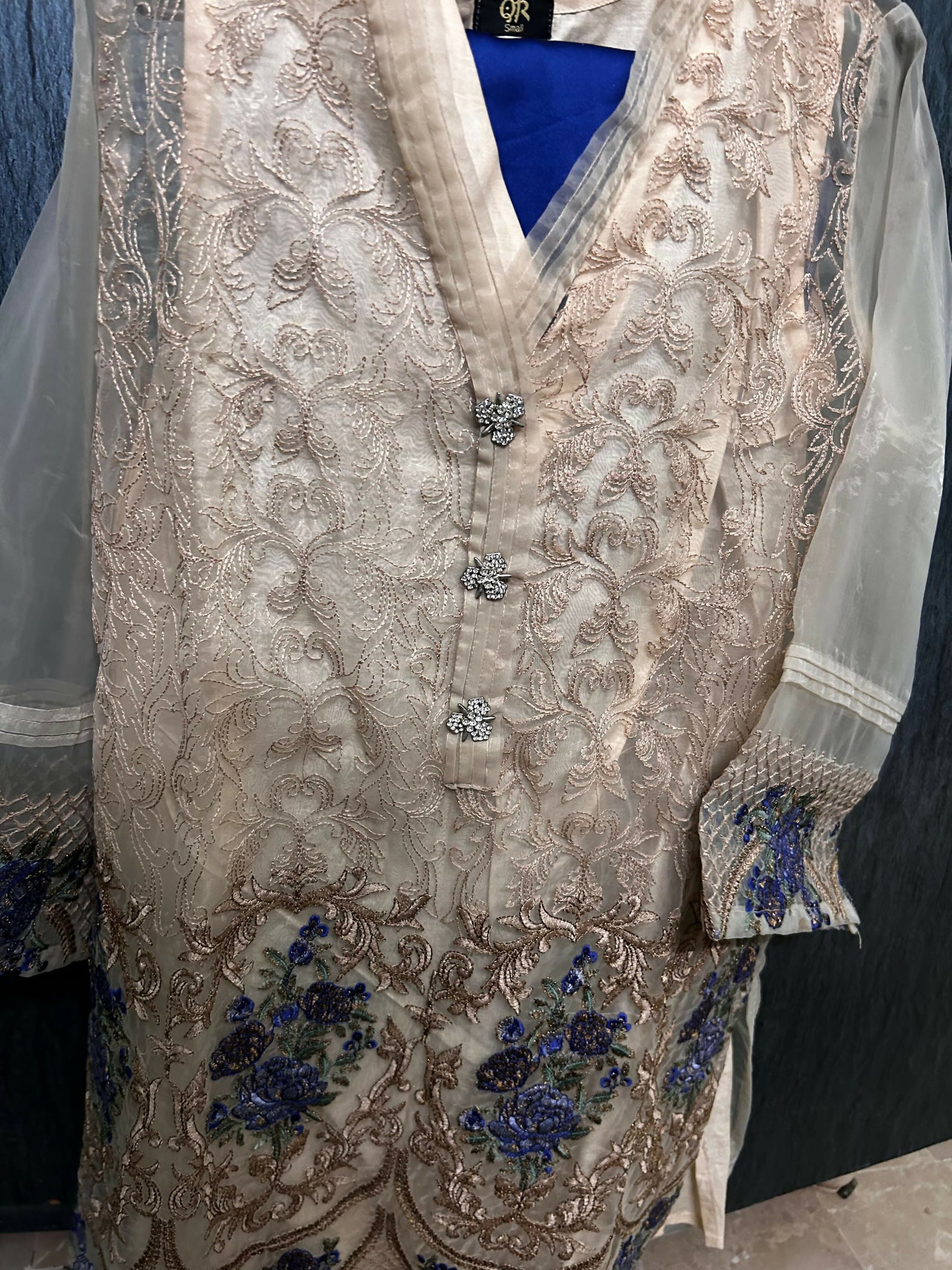 | MATERIAL & MEASUREMENT | Measurement: Shirt: Length: 40 inches Shoulder: 14 inches Chest (Bust): 19 inches (armpit to armpit) Waist: 18 inches Hip: 20 inches Sleeve Length: 21.5 inches Armhole: 8.5 inches Sleeve Opening: 5.5 inches Inner (Attached/Separate): Length: 38 inches Chest: 18 inches Shoulder: 13.5 inches Trouser: Length: 37 inches Waist (Relaxed): 13 inches (stretches up to 17–18 inches) Hip: 20 inches Bottom Opening: 6.5 inches Thigh: 11 inches Dupatta: Length: 2.5 meters Width: 36–38 inches |
