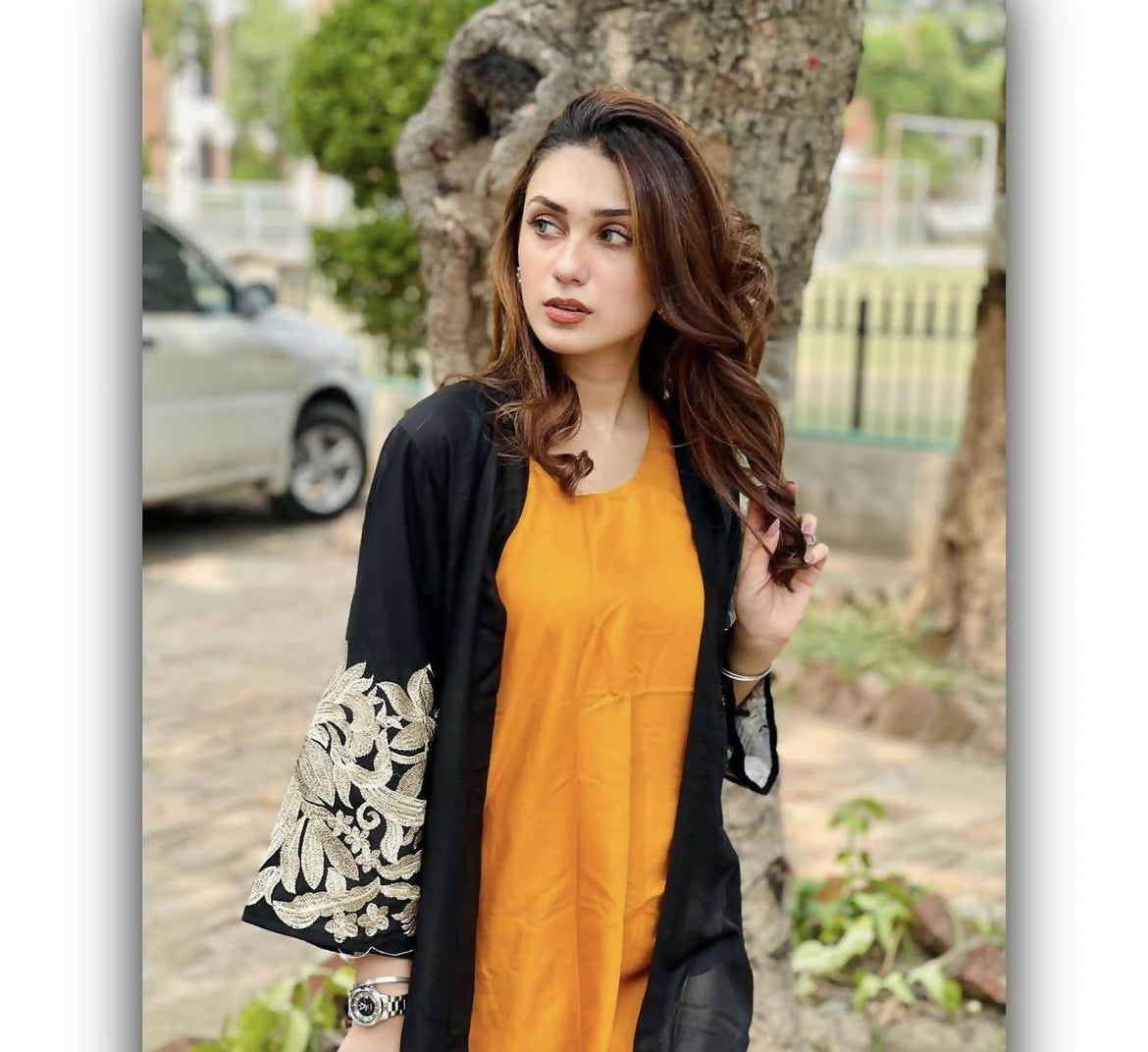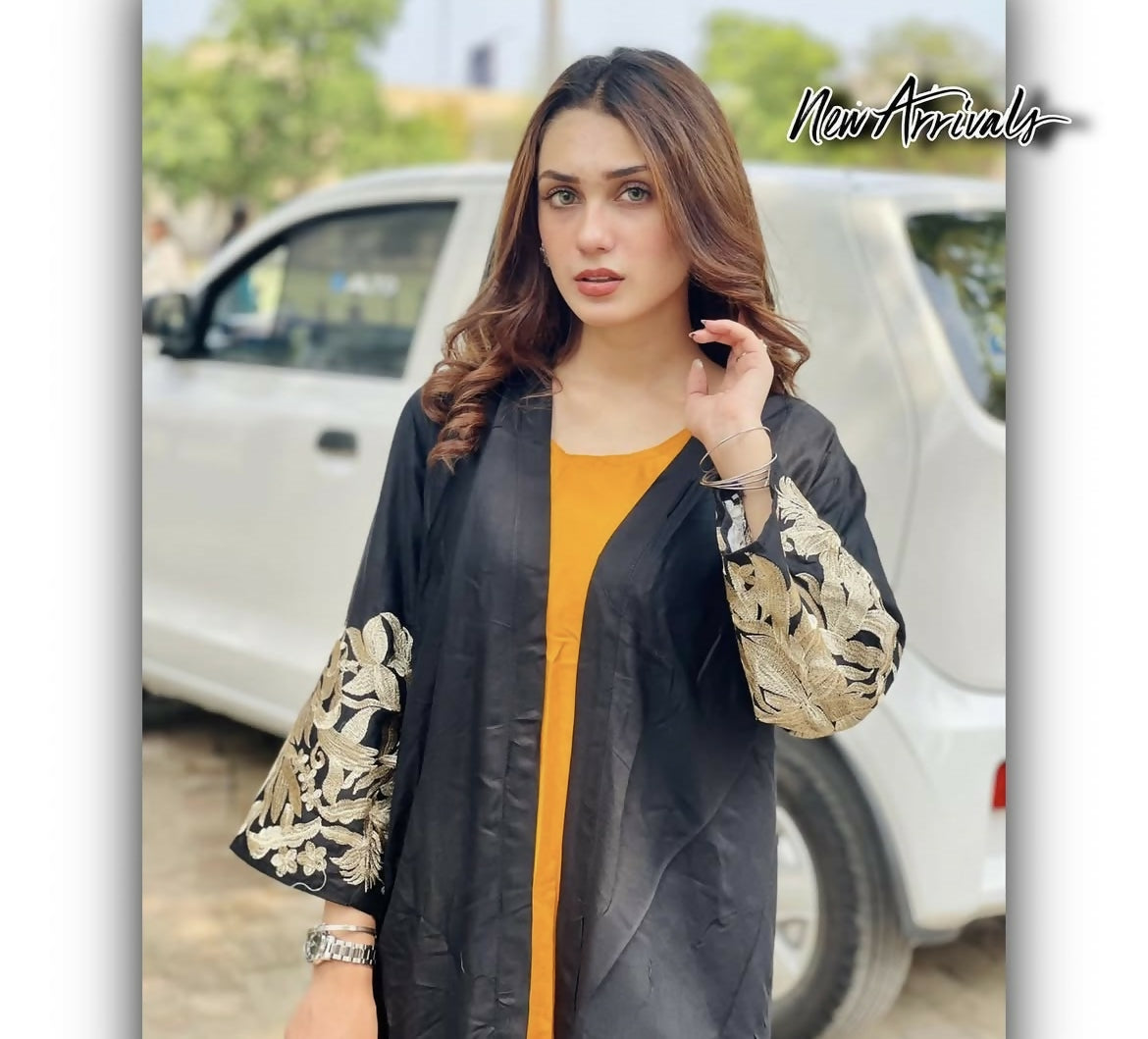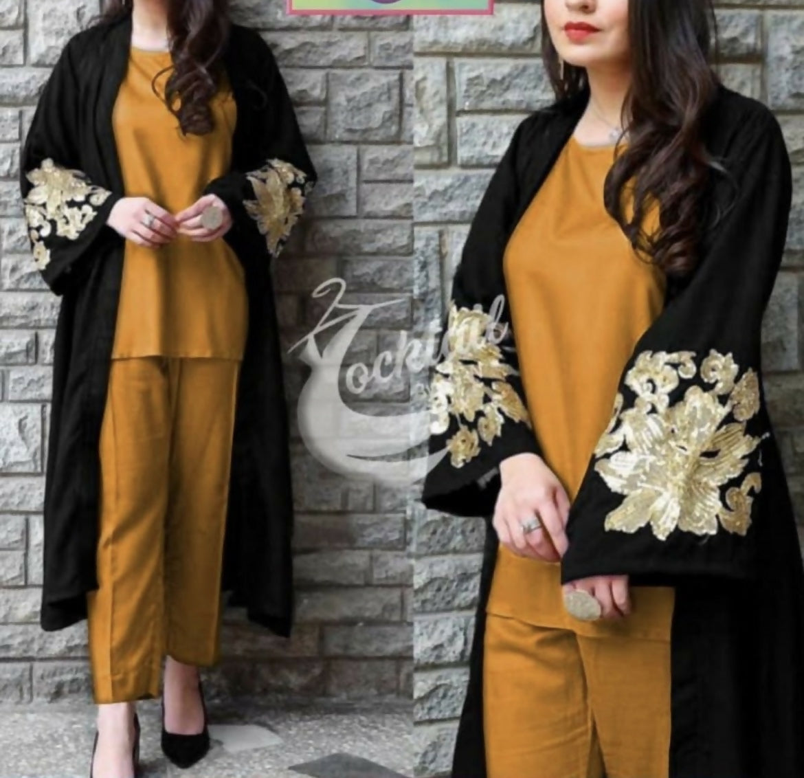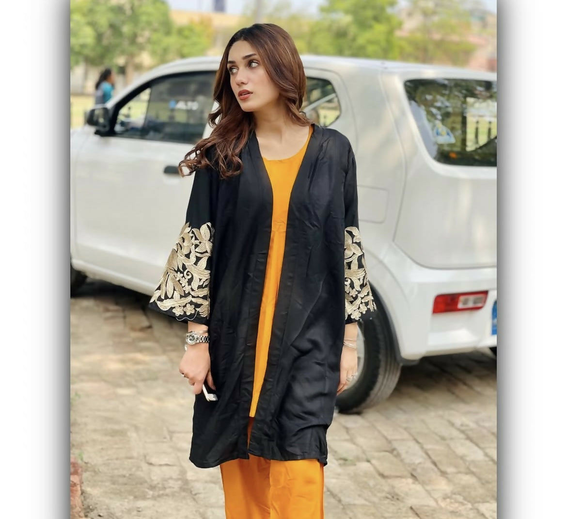 This stylish 2-piece set includes a solid mustard inner suit (top & pants) paired with a flowy black kimono-style outer gown. The standout feature is the heavy golden floral embroidery on the kimono sleeves, perfect for casual to semi-formal gatherings.