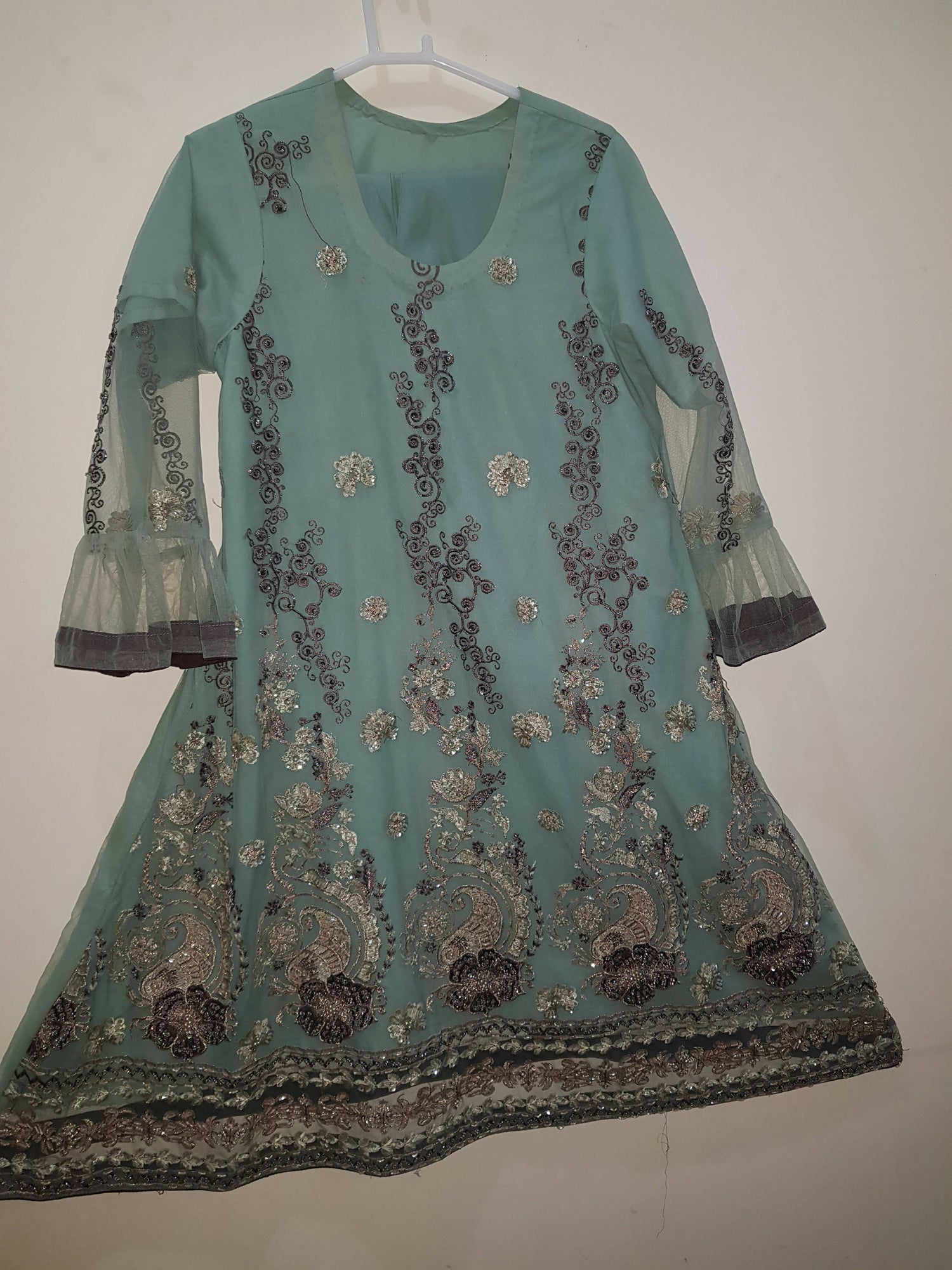 MATERIAL & MEASUREMENT siz : Medium lenght : 40 selves: 18 chest:18 flear: 40 Material: Nett stuff