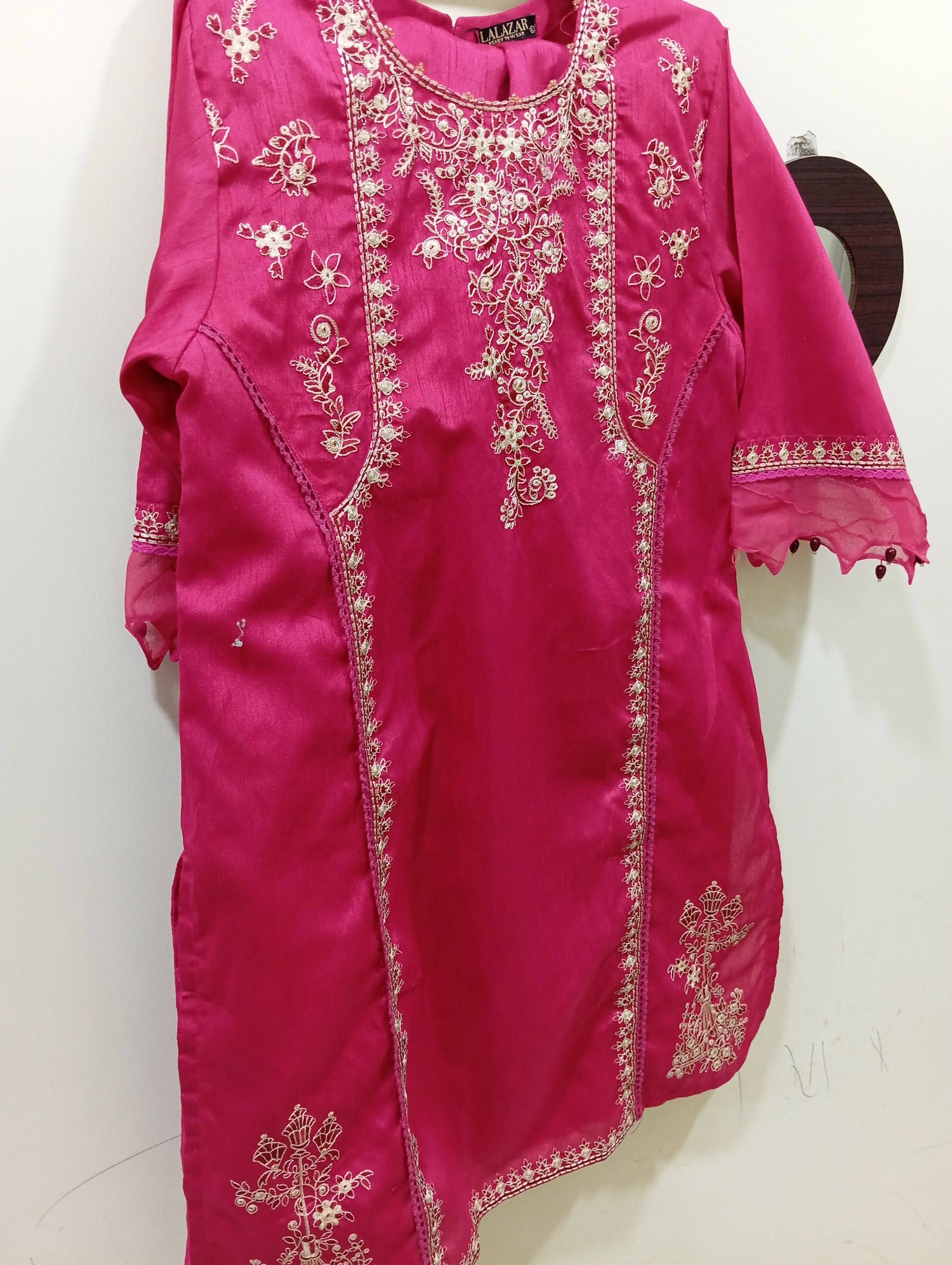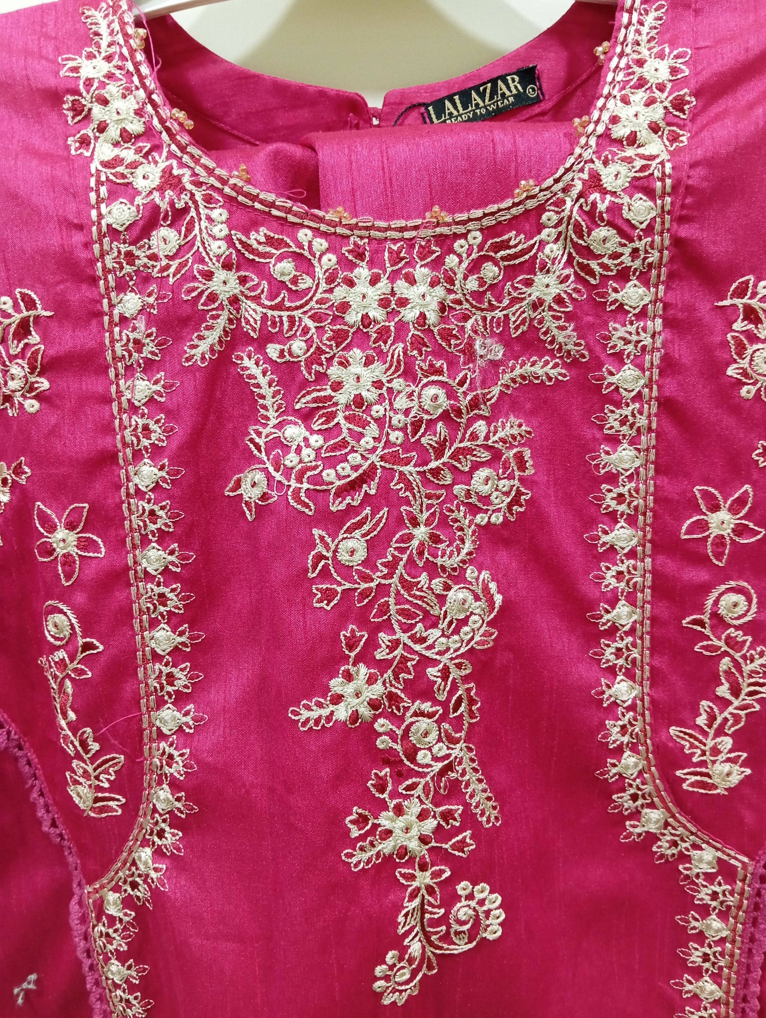 | MATERIAL & MEASUREMENT | Raw Silk Embroidered Stitched Dress Size :Large |