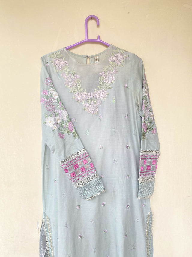 | MATERIAL & MEASUREMENT | Lawn Chest : 19 Sleeves : 23 Shoulders : 14 Shirt Length : 45 Trouser Length : 37 |