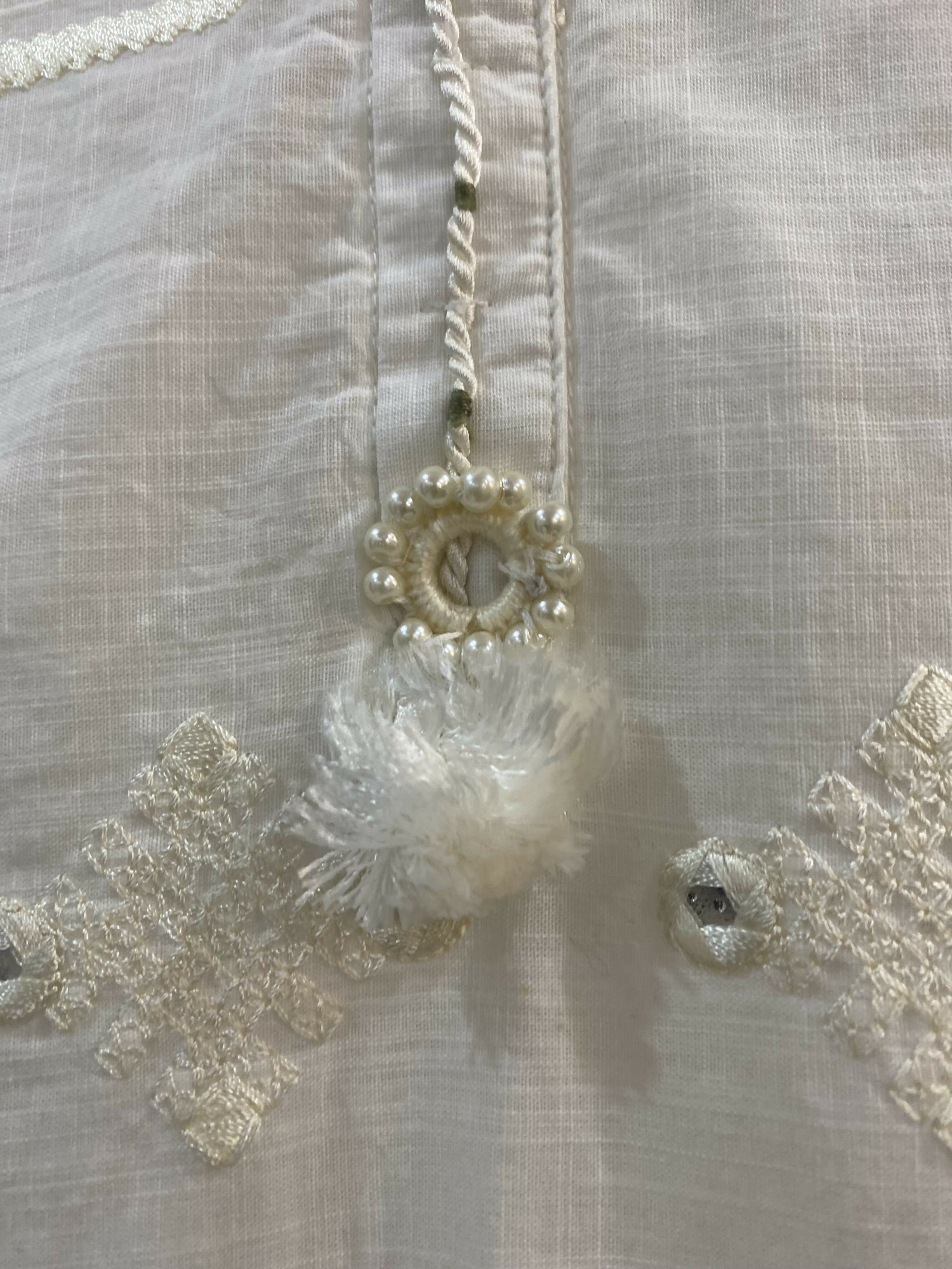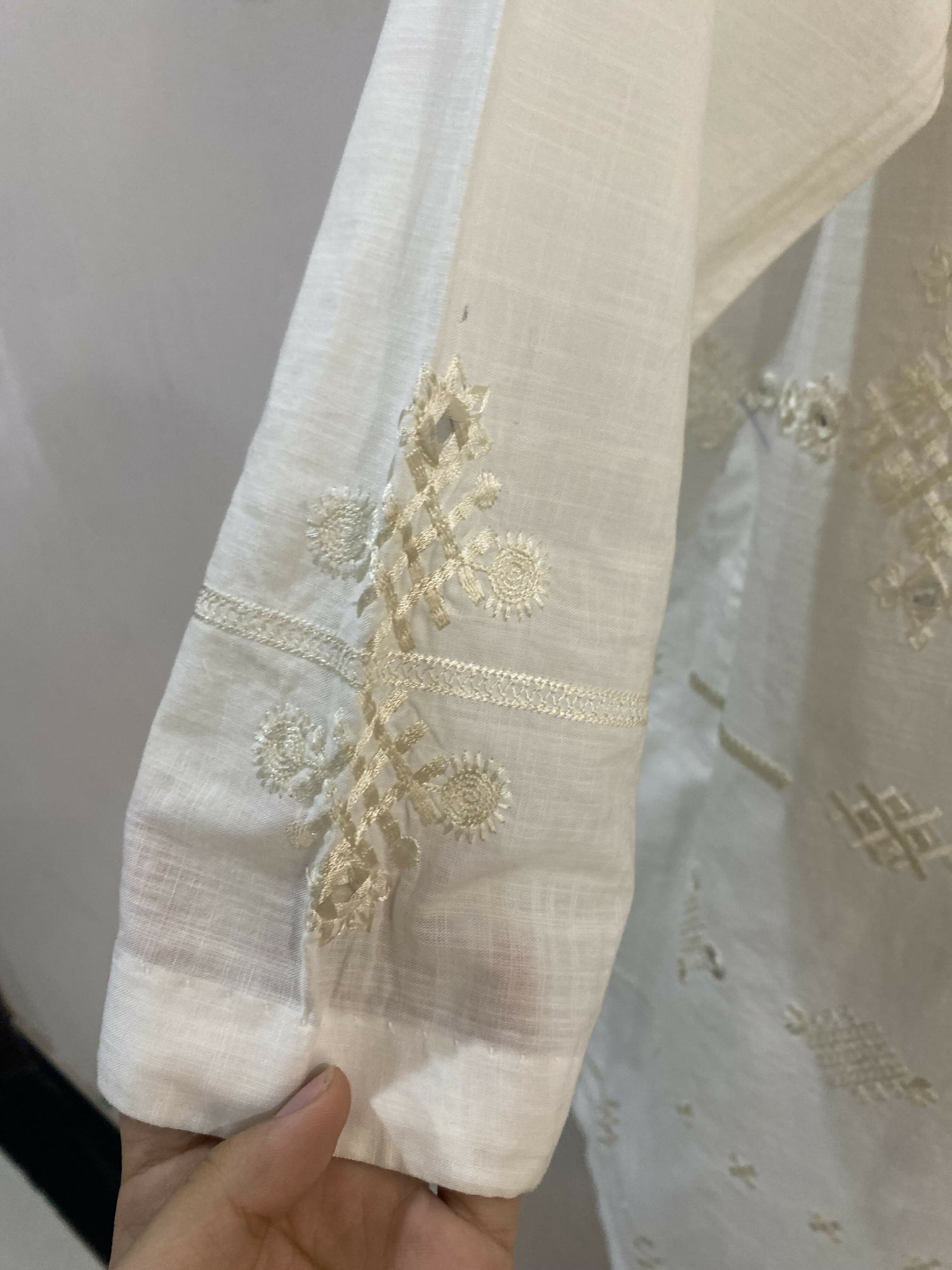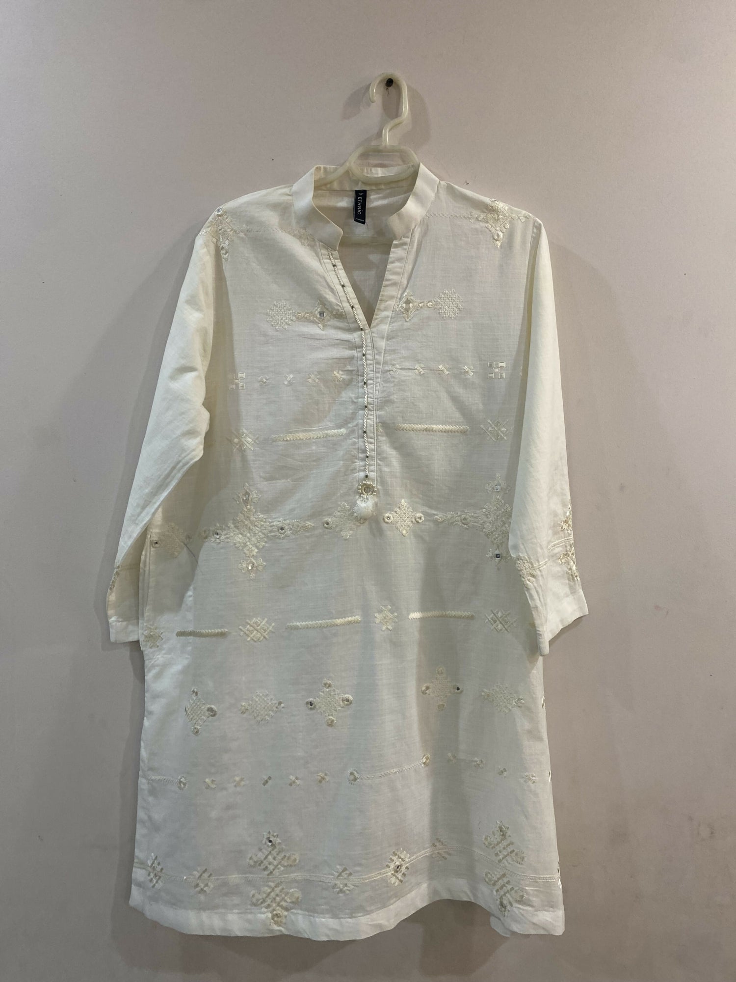 Stylish 1-piece white kurta from Ethnic, featuring elegant embroidery with mirror (shisha) work on the front. Designed in a soft non-lawn fabric, this kurta also includes side pockets for added comfort and functionality. Perfect for casual or semi-formal wear.