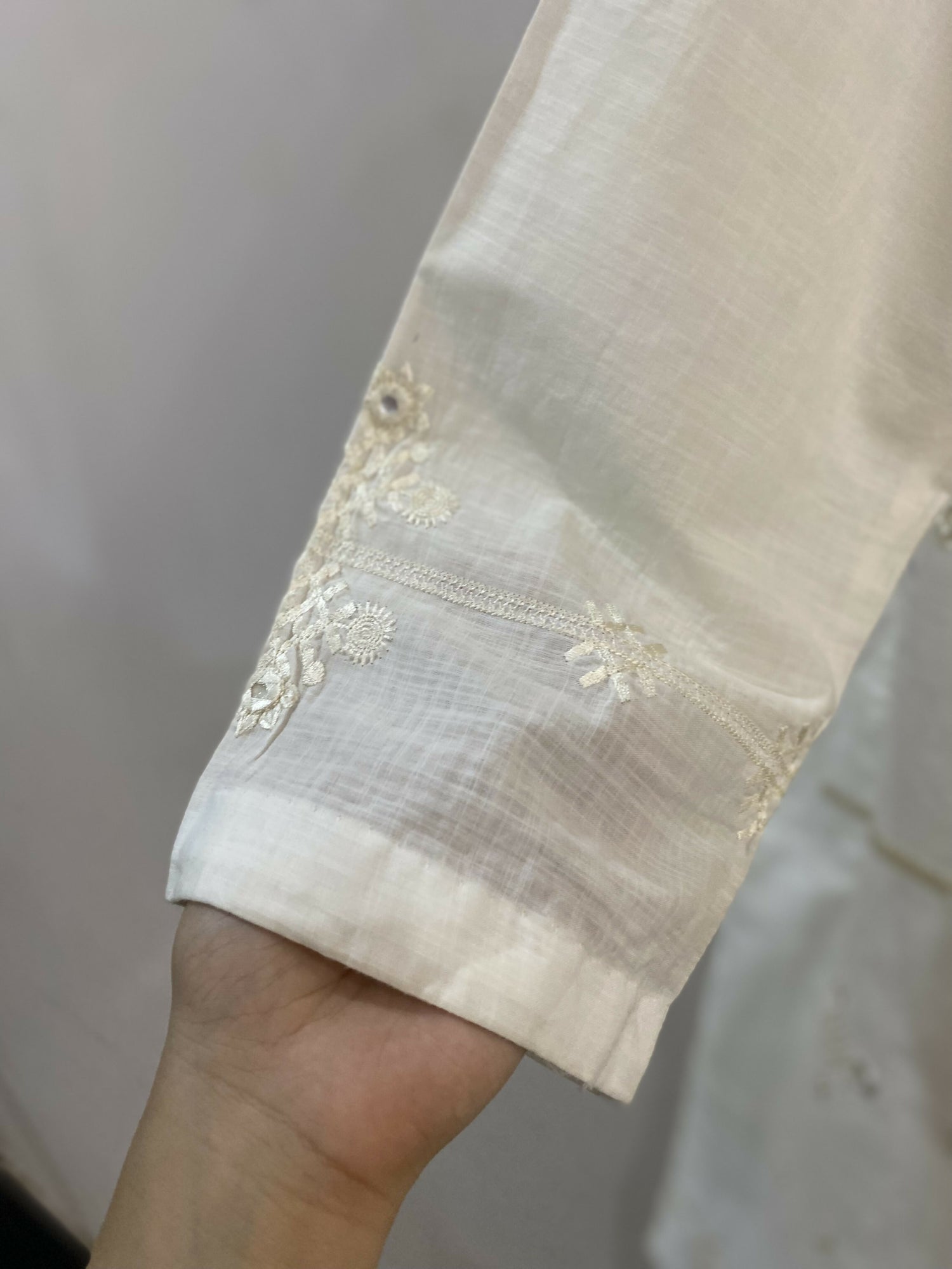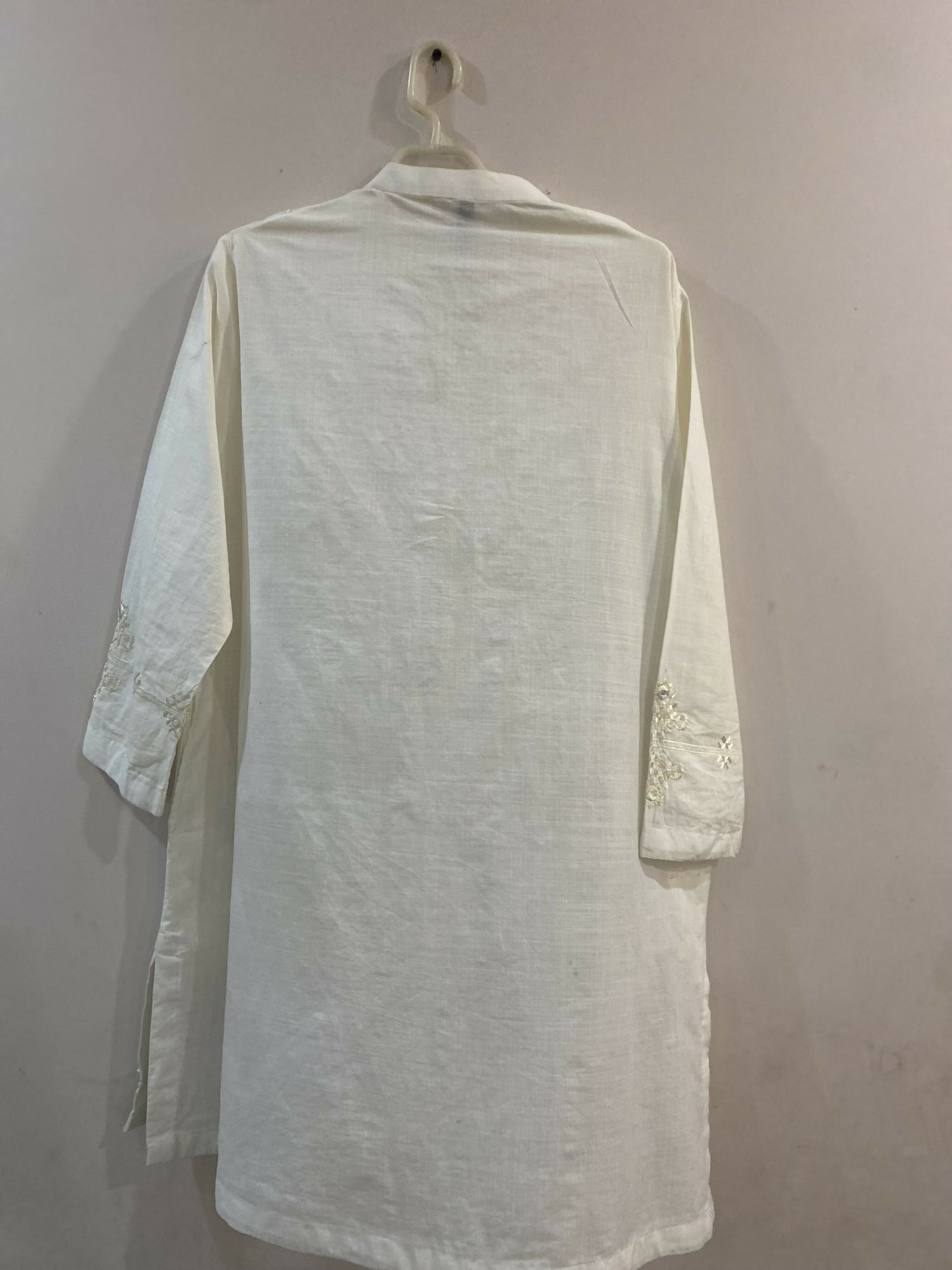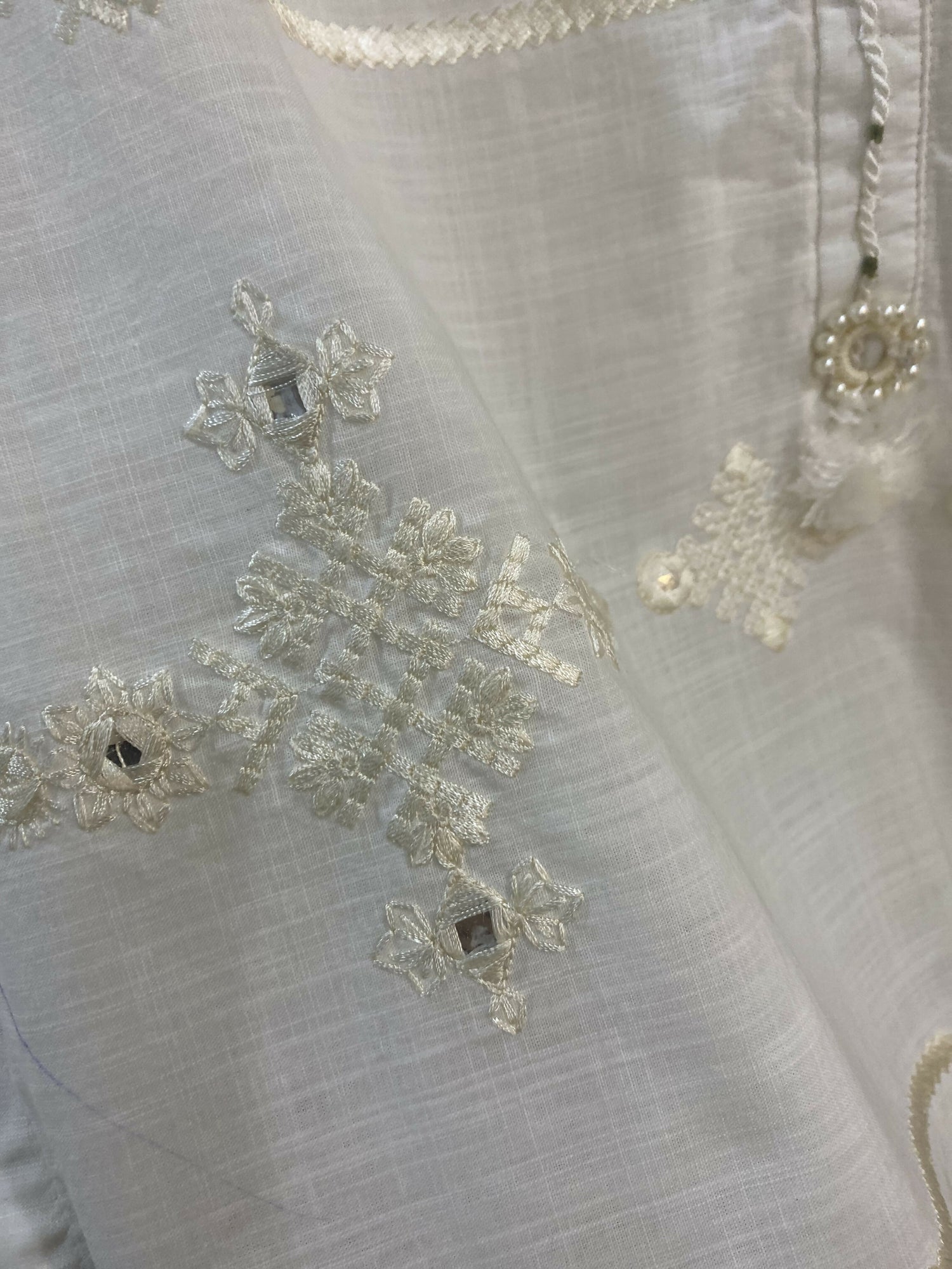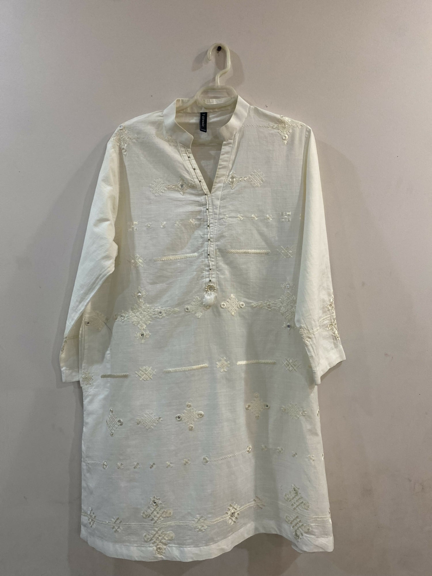 Stylish 1-piece white kurta from Ethnic, featuring elegant embroidery with mirror (shisha) work on the front. Designed in a soft non-lawn fabric, this kurta also includes side pockets for added comfort and functionality. Perfect for casual or semi-formal wear.
