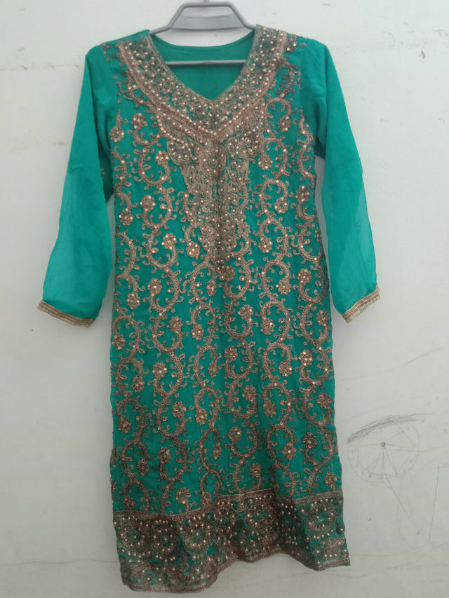 | MATERIAL & MEASUREMENT | size madium colour green fancy 3 pice dress size lenght 39 shirt width 22 chest 17 capri lenght 38 |