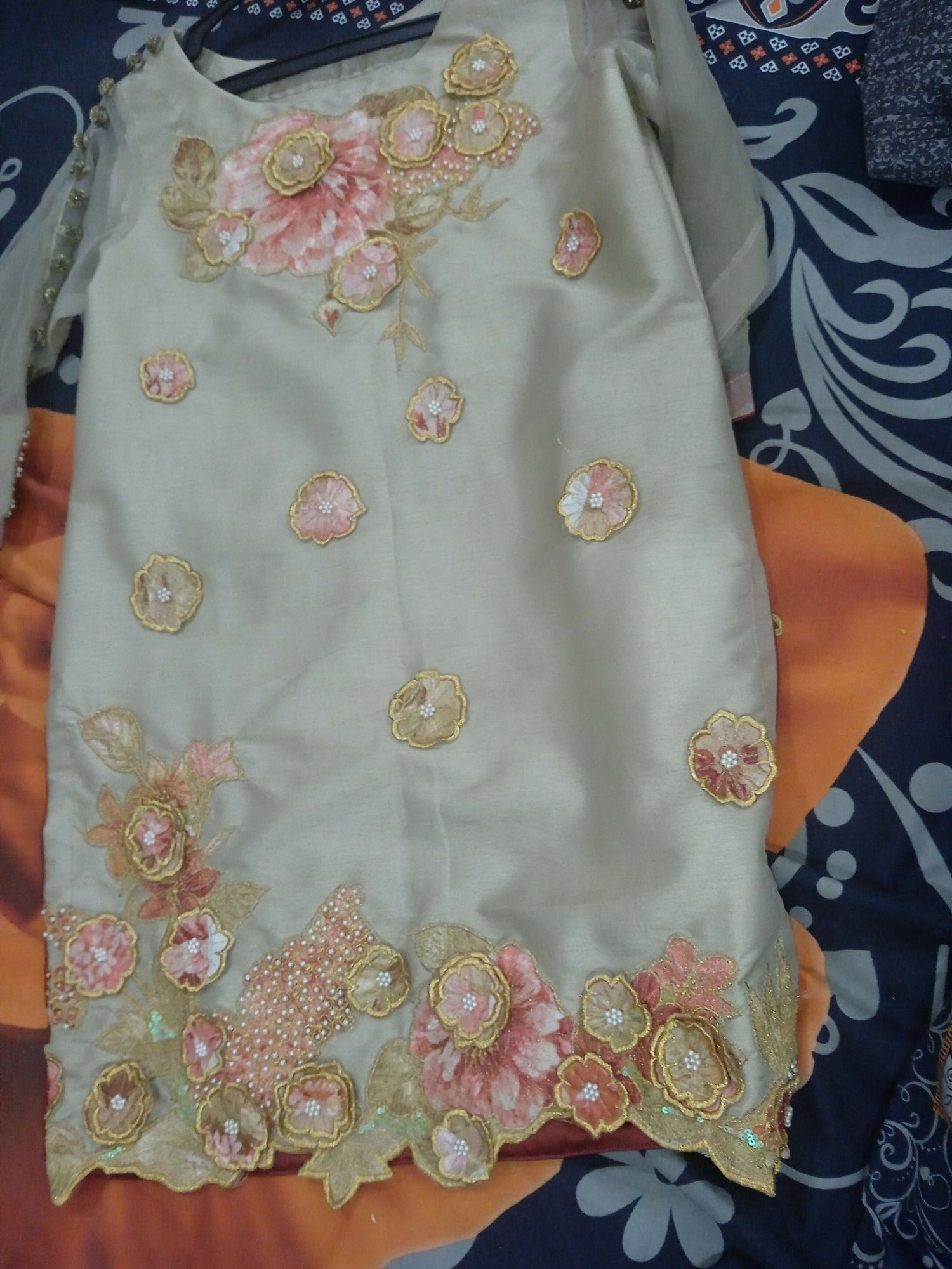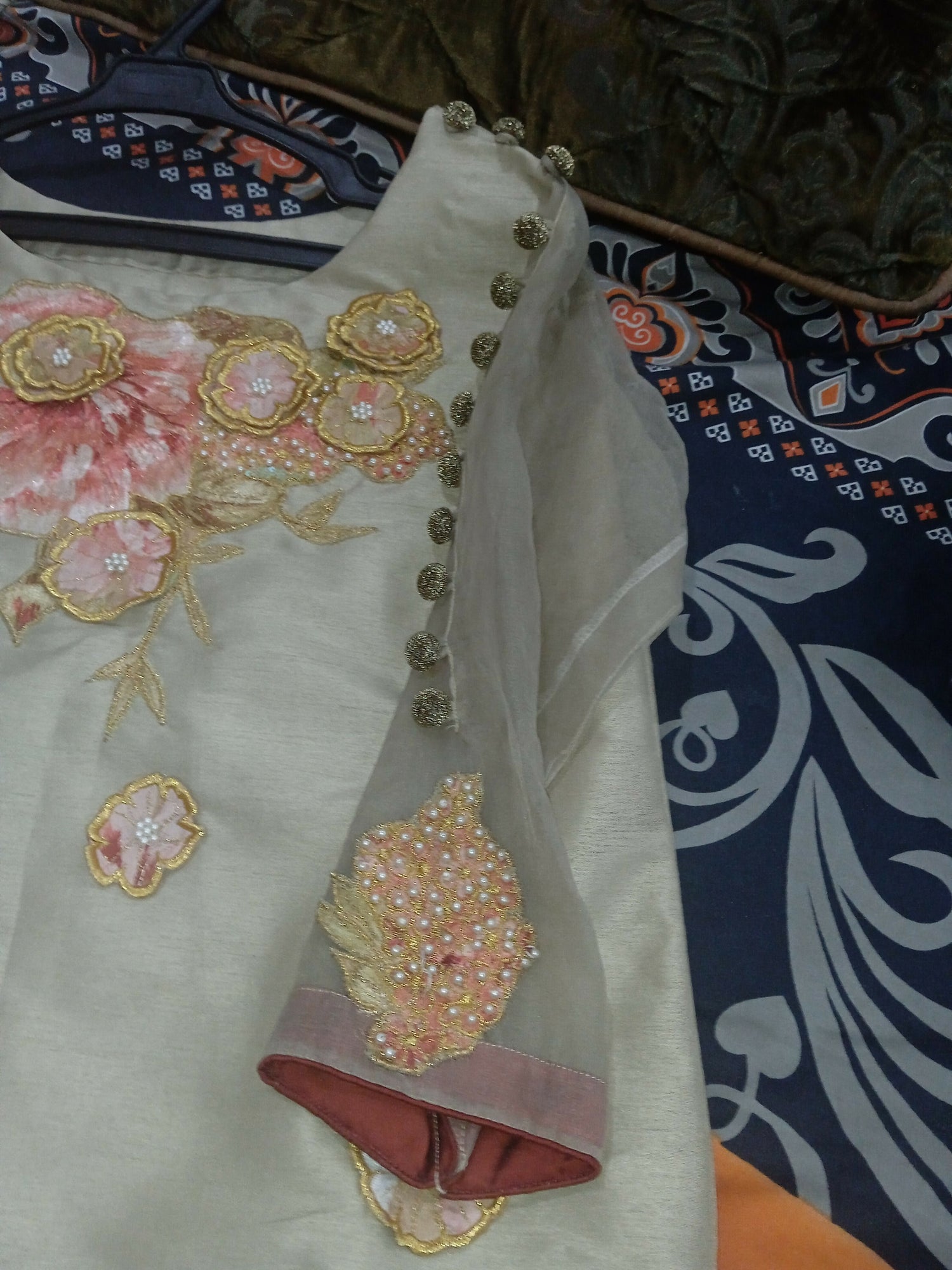 | MATERIAL & MEASUREMENT | Raw silk with hand work stones pearls , size Chest 38 Length 38 |