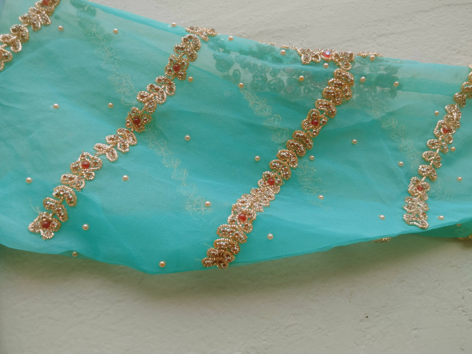 Embroidered with maroon pearls, stones and cora.