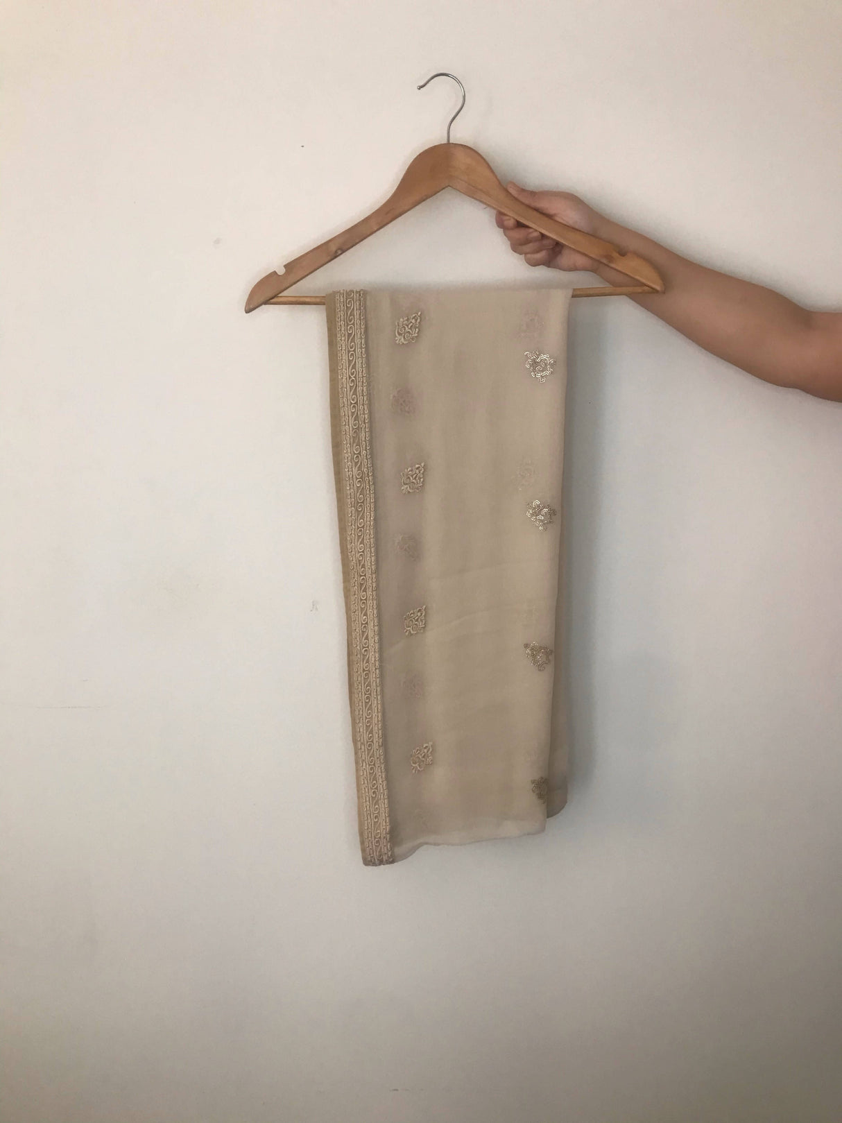 Beige two piece dress with sitara and silk thread embroidered raw silk straight shirt and embroidered chiffon dupatta.
