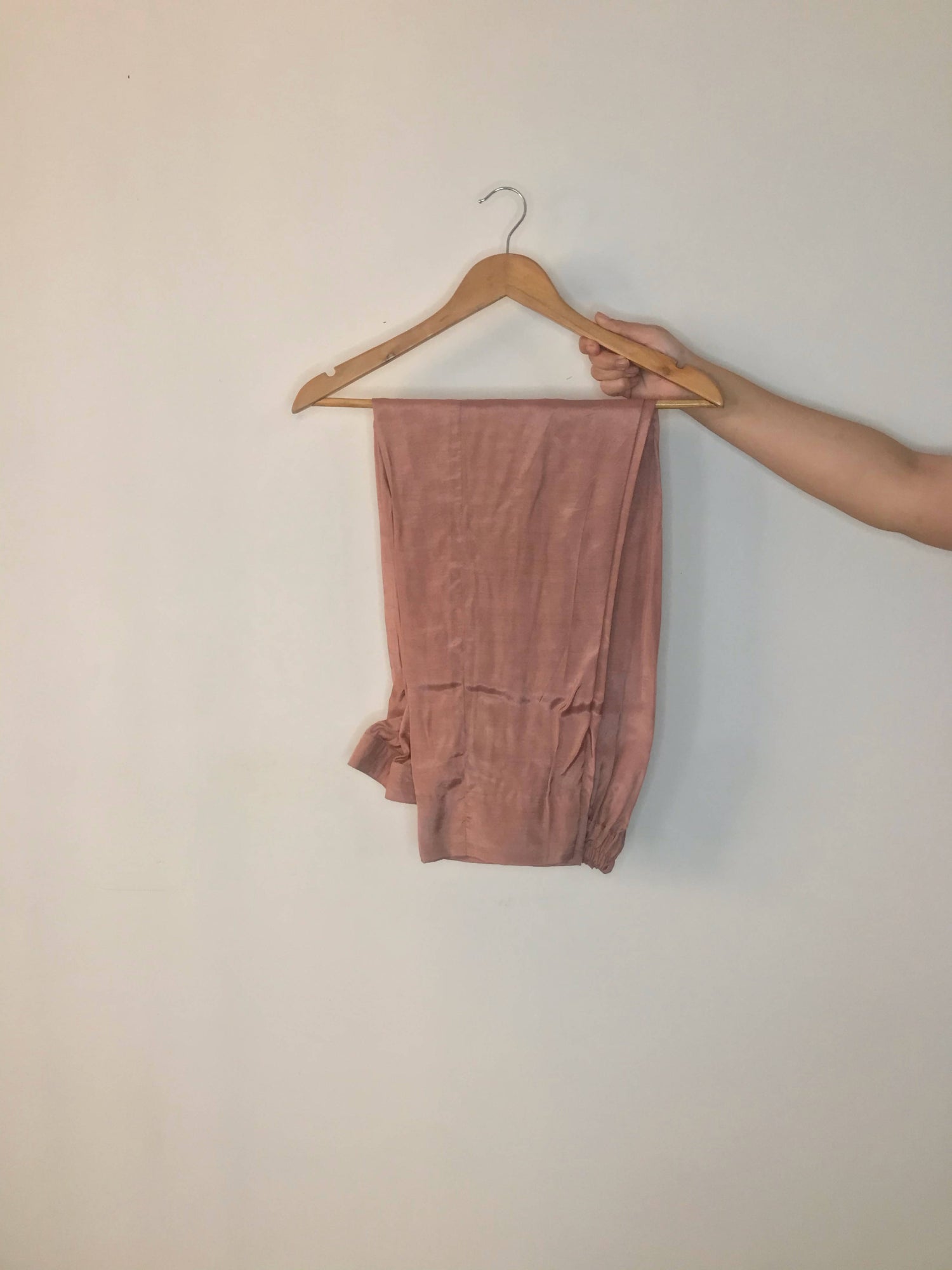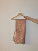 Dull/Saman pink three piece dress with sitara and silk thread embroidered maisuri straight shirt with laces on the neck, sleeves and daman, shamoz silk pant and embroidered maisuri dupatta with a lace on the border.