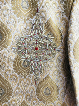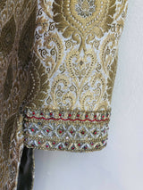 | MATERIAL & MEASUREMENT | Fancy jamawar embellishment and embroidery on sleeves and front sherwani. matching qulla and khussa shirt length 45 chest 21 hips 24 khussa size 10 |