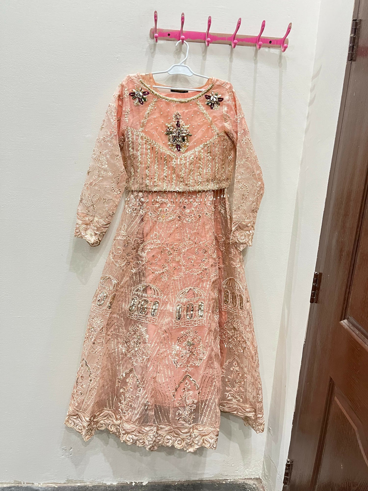 | MATERIAL & MEASUREMENT | Measurements (inch): Chest: 18 Sleeves Length: 20 Shoulder: 14 Frock Length: 55 Shalwar: 36 Dupatta: 100 |