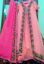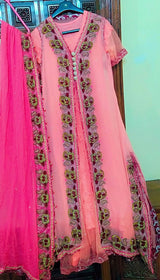 | MATERIAL & MEASUREMENT | Fabric material: pure chiffon heavy emboridery peach front open gown with separate net lining, trouser and baby pink chiffon dupatta. Measurement: small size Chest size: 33-34 Waist size:27-28 |